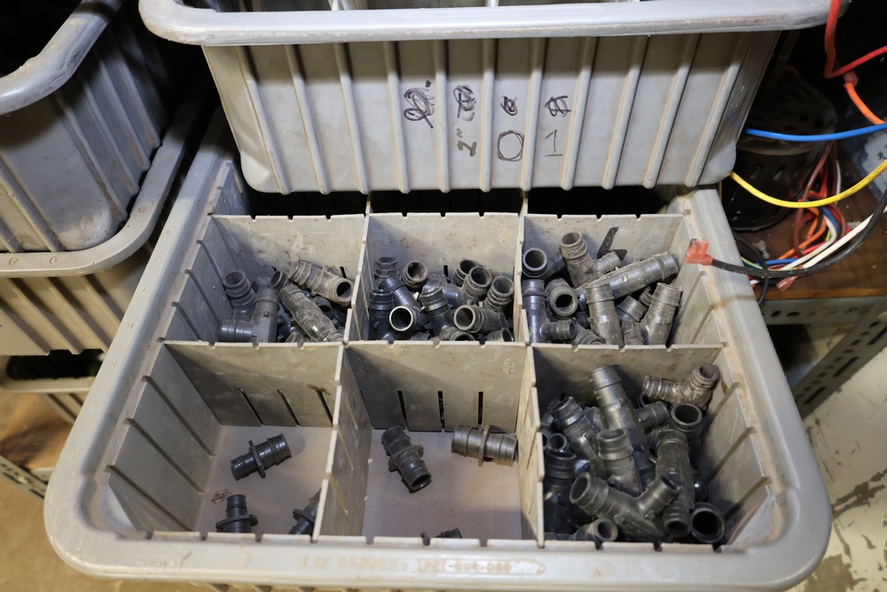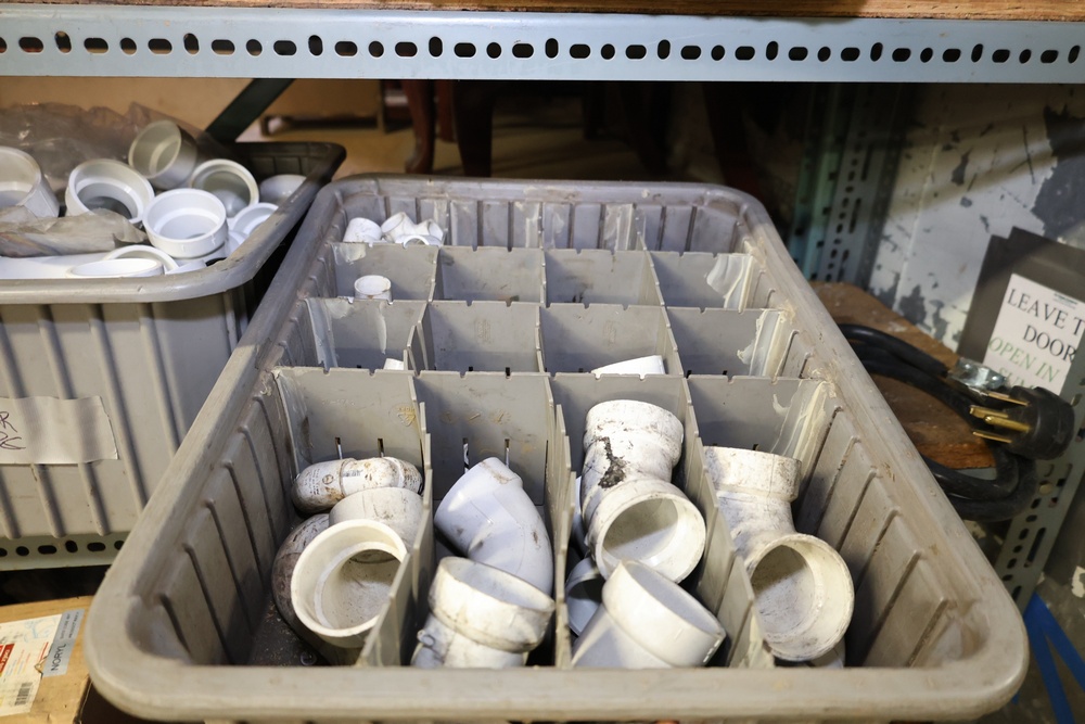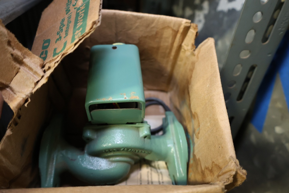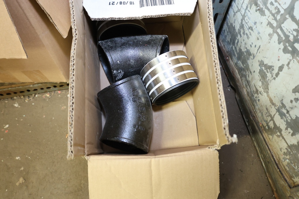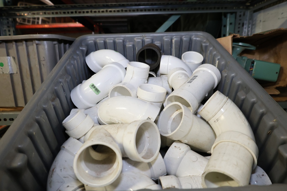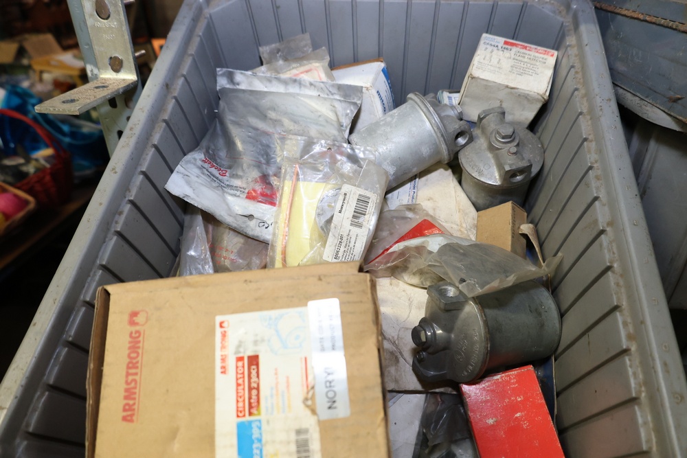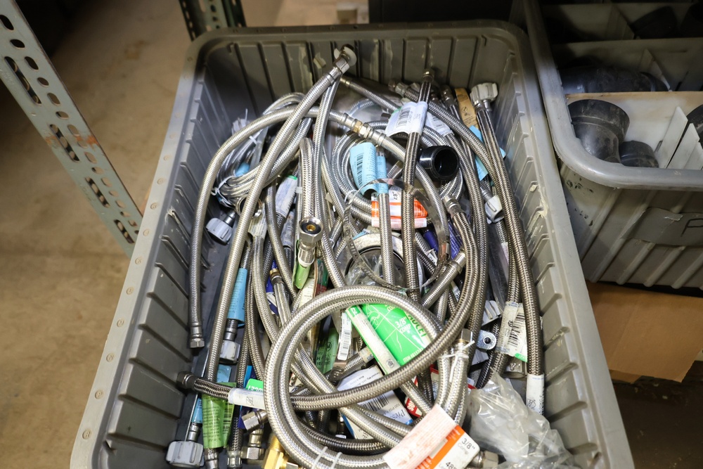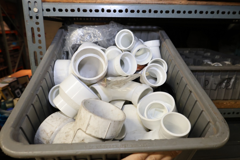 Bins and shelving unit with assorted plumbing and hardware components. Includes multiple plastic bins containing fittings, connectors, and valves, a green pump in its original box, and unopened boxes of parts. Shelving unit is made of metal and features multiple adjustable shelves. Some items are pre-owned, while others appear unused in original packaging. Pickup only. Buyer must take all.
