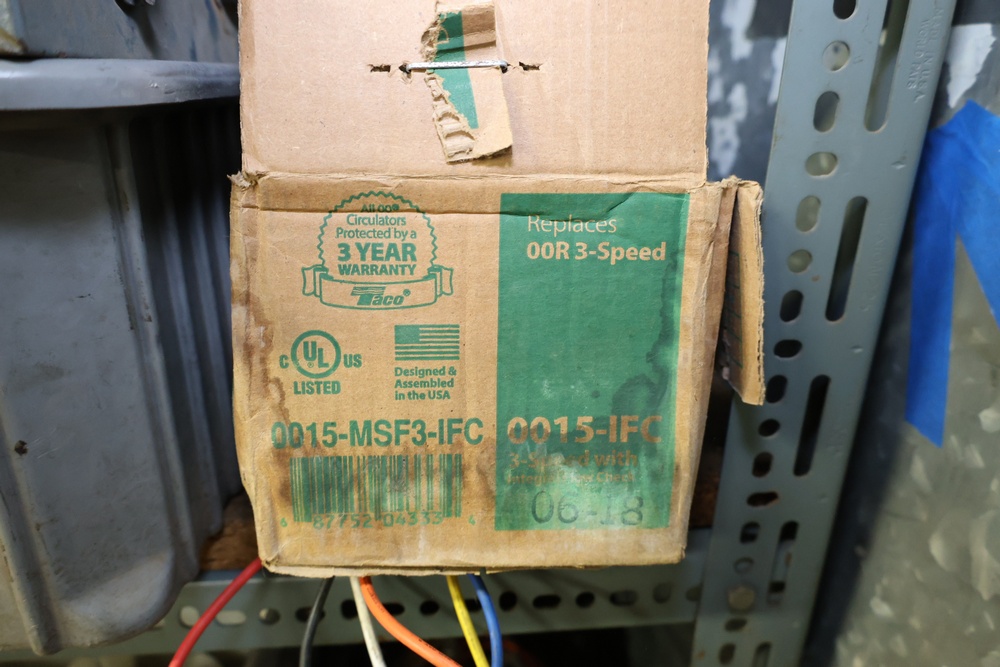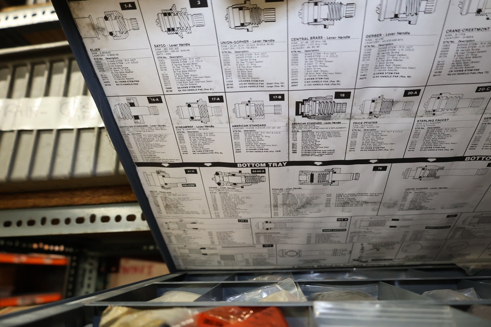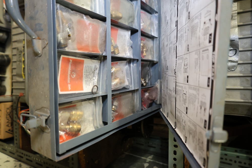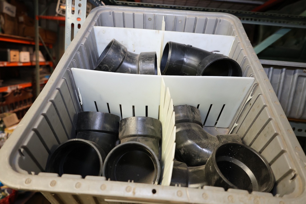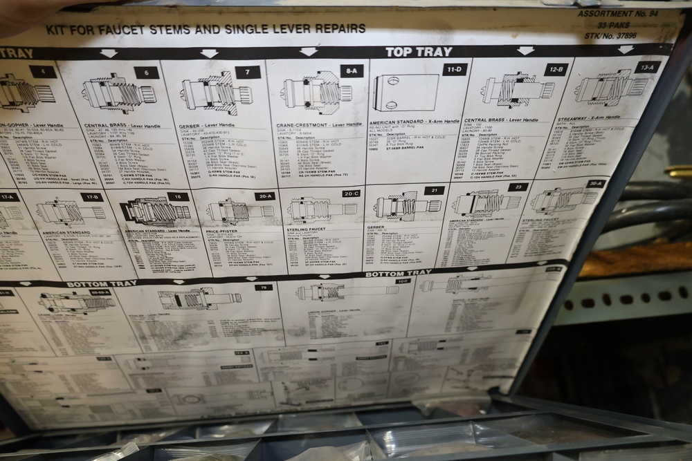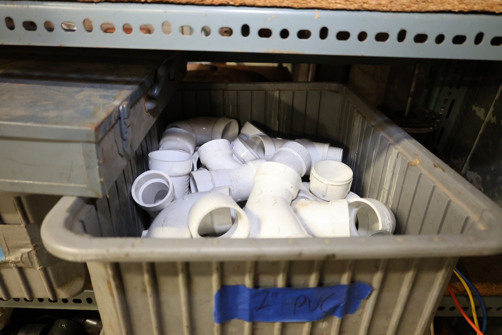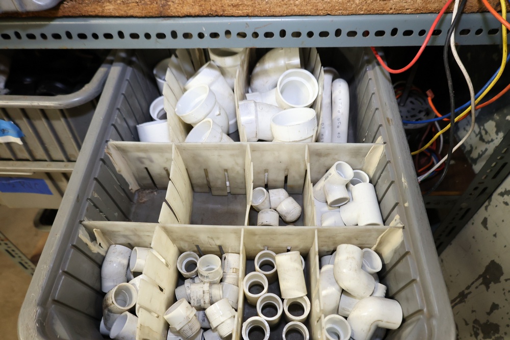 Bins and shelving unit with assorted plumbing and hardware components. Includes multiple plastic bins containing fittings, connectors, and valves, a green pump in its original box, and unopened boxes of parts. Shelving unit is made of metal and features multiple adjustable shelves. Some items are pre-owned, while others appear unused in original packaging. Pickup only. Buyer must take all.