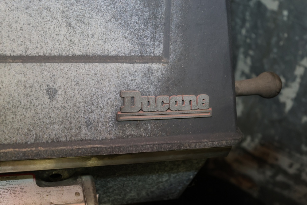 Ducane freestanding gas grill with three front-mounted control knobs and integrated push-button ignition. Features include dual side handles, cast grates, and internal burner shields. Grill lid is embossed with the Ducane brand mark, and unit is mounted on a cabinet-style stainless base with caster wheels. No model or serial number is visible in the provided images.
