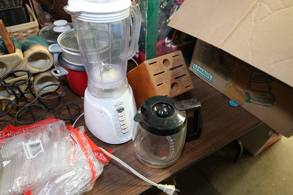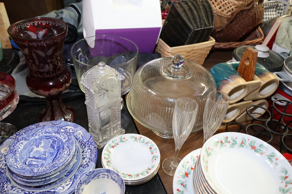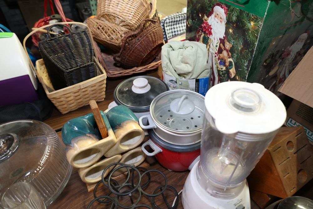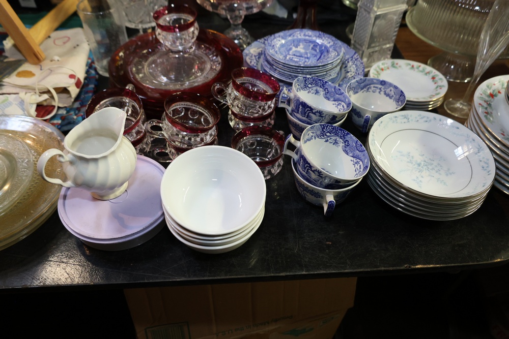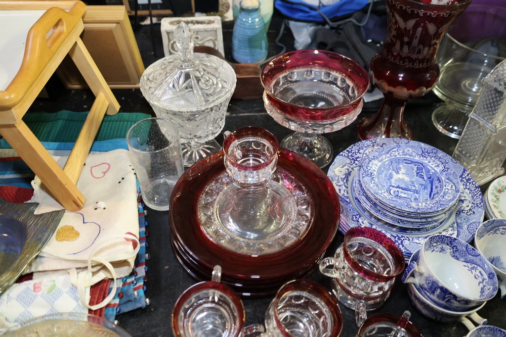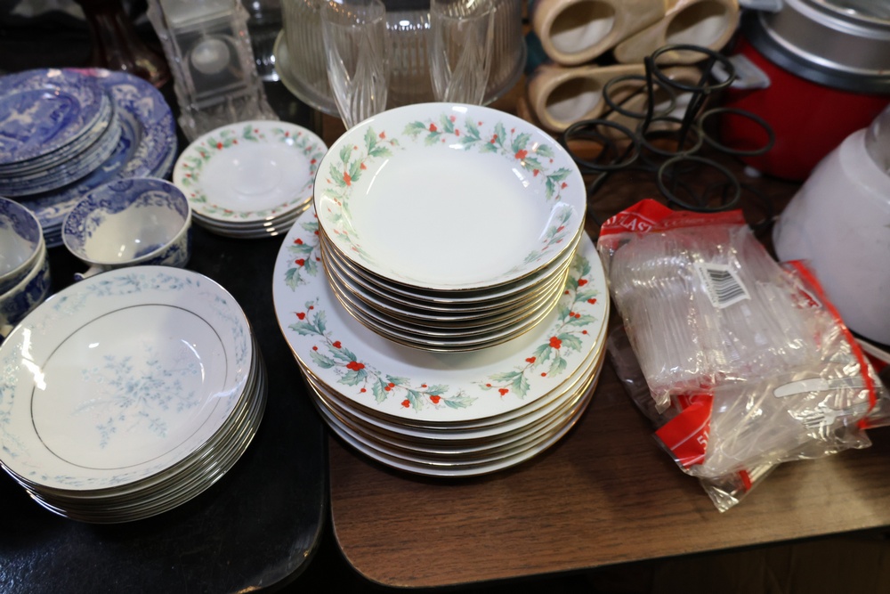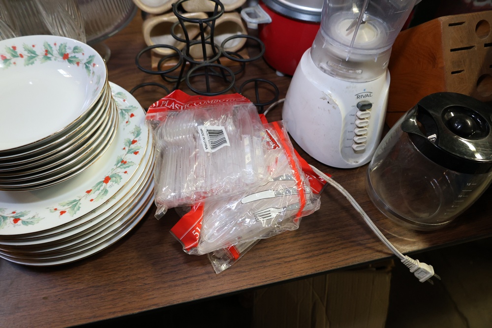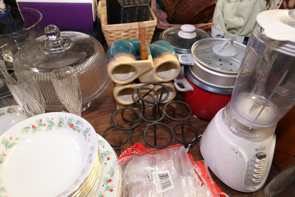 Spode Blue Italian dinnerware made in England with scenic transferware designs, including dinner and salad plates, bowls, and matching cups; complemented by ruby red glass pedestal dishes, a crystal lidded candy jar, and vintage pressed glass pieces. Includes Rival blender base and pitcher, cookware with lids, holiday-themed Corelle plates with holly design, plastic cutlery, knife block, and ceramic mugs in a countertop stand. Assorted framed art prints, decorative photo frames in multiple styles, metal easels, crocheted doilies, and woven storage baskets. Selection of handbags and clutches including Frye nylon backpack and pouch, Michael Kors drawstring shoulder bag, colorful striped handbag, and embellished wristlets. Also includes a Panasonic DVD/CD player in original box, framed horse print, Stephen King hardcover with bonus CD, pet clothing and accessories, laundry caddy, and a variety of linens, decor, and household accessories. Excludes tables. Buyer must take all.