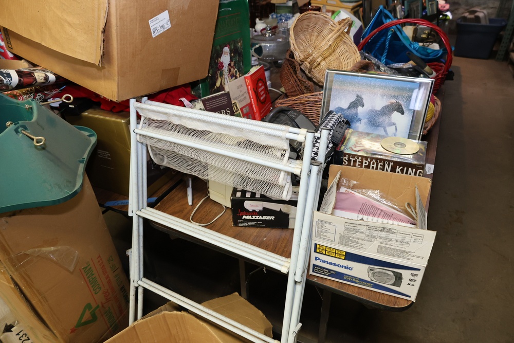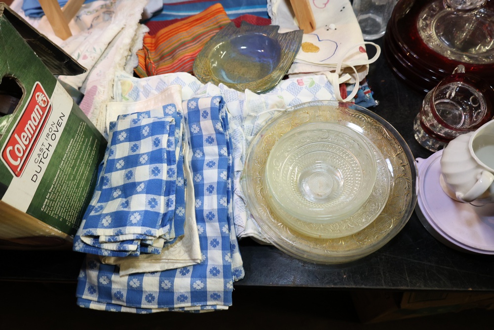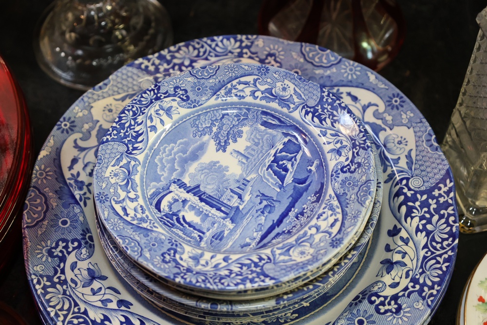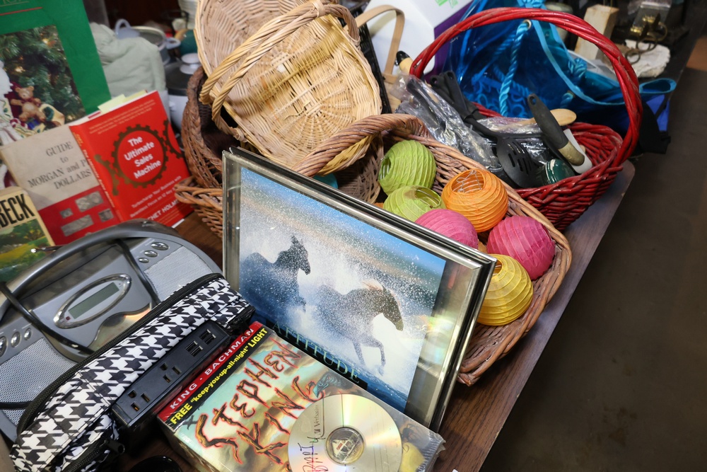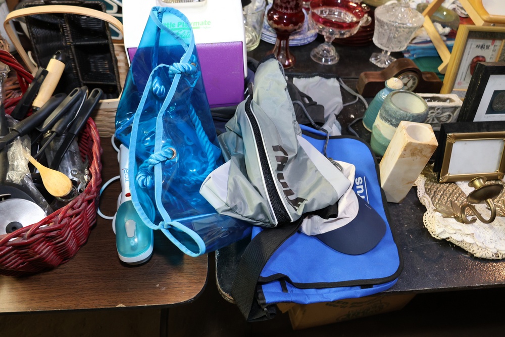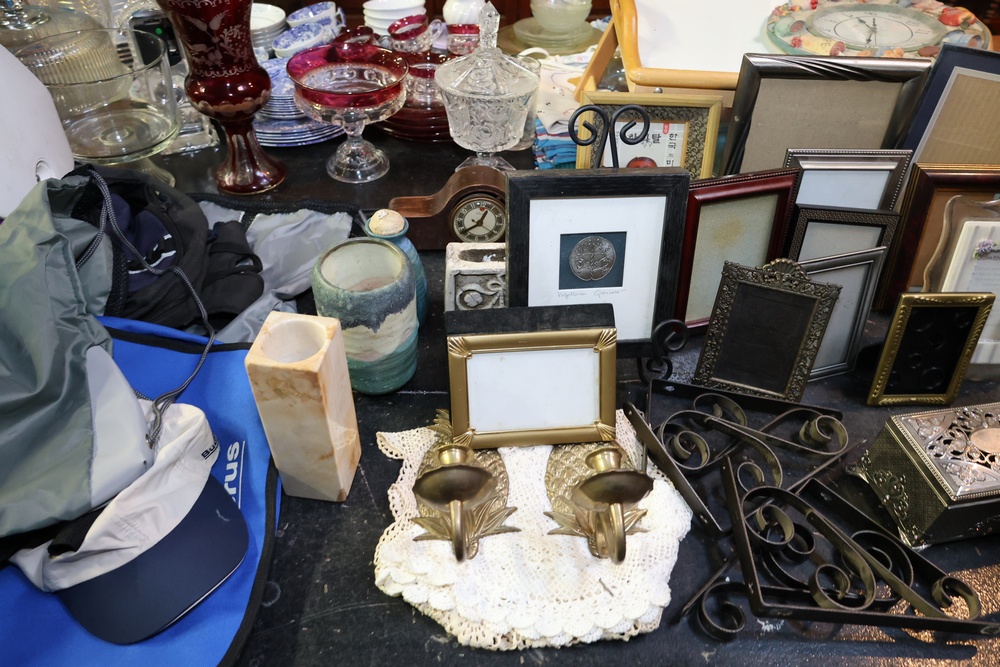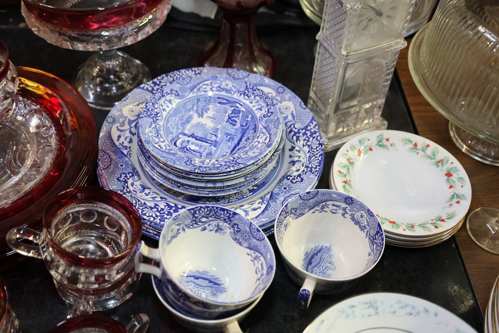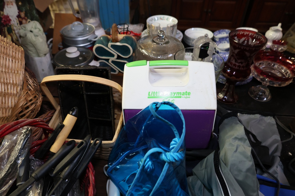 Spode Blue Italian dinnerware made in England with scenic transferware designs, including dinner and salad plates, bowls, and matching cups; complemented by ruby red glass pedestal dishes, a crystal lidded candy jar, and vintage pressed glass pieces. Includes Rival blender base and pitcher, cookware with lids, holiday-themed Corelle plates with holly design, plastic cutlery, knife block, and ceramic mugs in a countertop stand. Assorted framed art prints, decorative photo frames in multiple styles, metal easels, crocheted doilies, and woven storage baskets. Selection of handbags and clutches including Frye nylon backpack and pouch, Michael Kors drawstring shoulder bag, colorful striped handbag, and embellished wristlets. Also includes a Panasonic DVD/CD player in original box, framed horse print, Stephen King hardcover with bonus CD, pet clothing and accessories, laundry caddy, and a variety of linens, decor, and household accessories. Excludes tables. Buyer must take all.