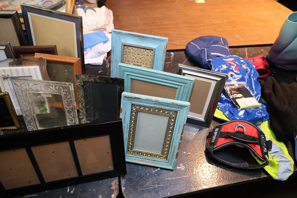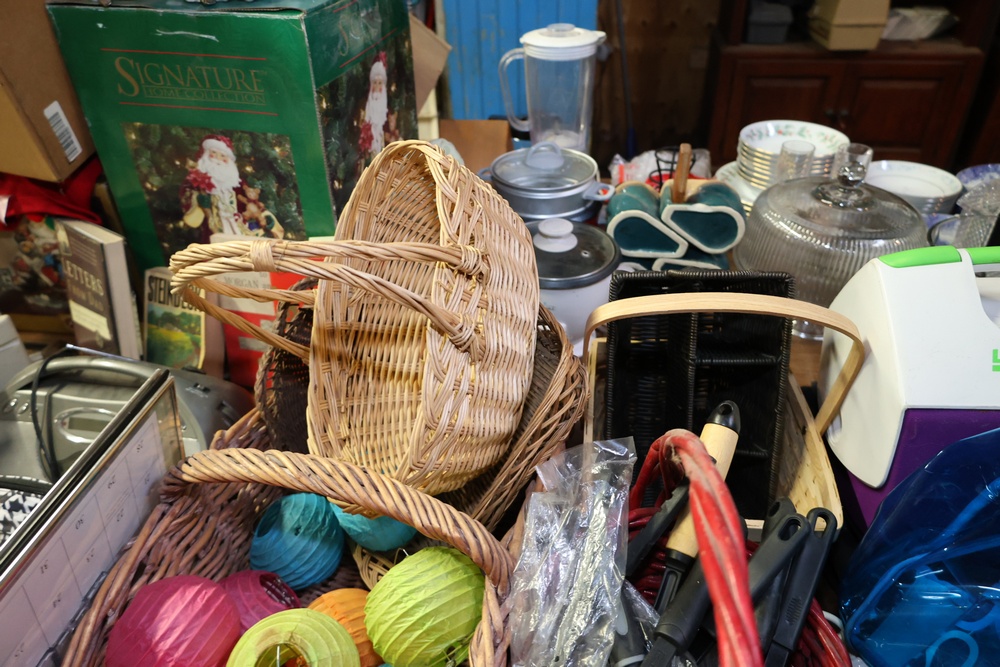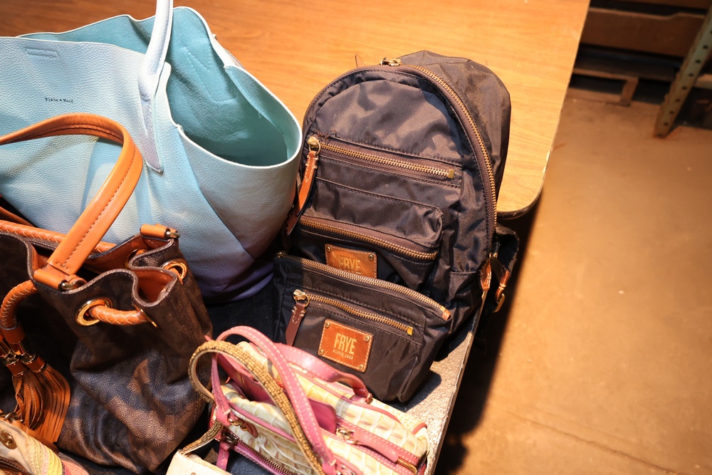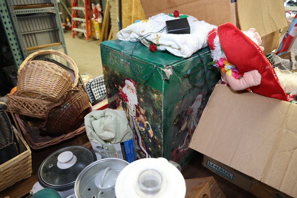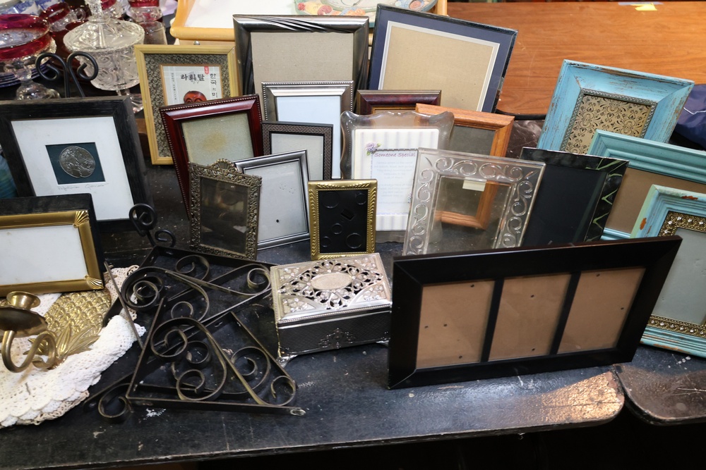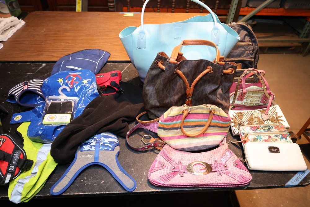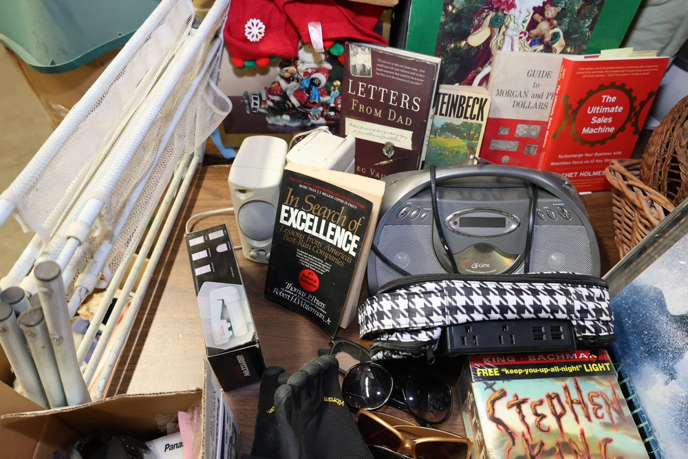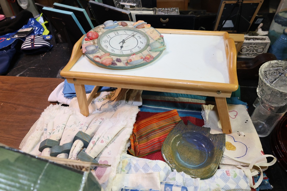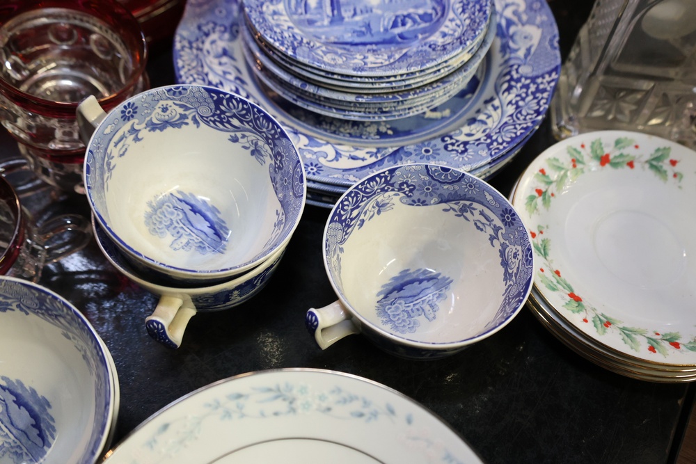 Spode Blue Italian dinnerware made in England with scenic transferware designs, including dinner and salad plates, bowls, and matching cups; complemented by ruby red glass pedestal dishes, a crystal lidded candy jar, and vintage pressed glass pieces. Includes Rival blender base and pitcher, cookware with lids, holiday-themed Corelle plates with holly design, plastic cutlery, knife block, and ceramic mugs in a countertop stand. Assorted framed art prints, decorative photo frames in multiple styles, metal easels, crocheted doilies, and woven storage baskets. Selection of handbags and clutches including Frye nylon backpack and pouch, Michael Kors drawstring shoulder bag, colorful striped handbag, and embellished wristlets. Also includes a Panasonic DVD/CD player in original box, framed horse print, Stephen King hardcover with bonus CD, pet clothing and accessories, laundry caddy, and a variety of linens, decor, and household accessories. Excludes tables. Buyer must take all.