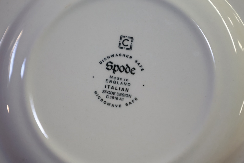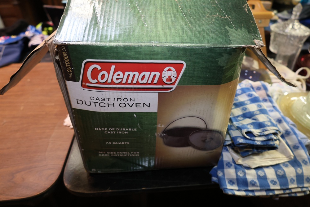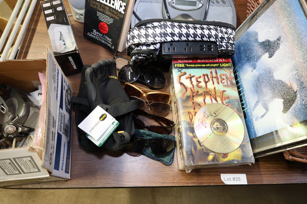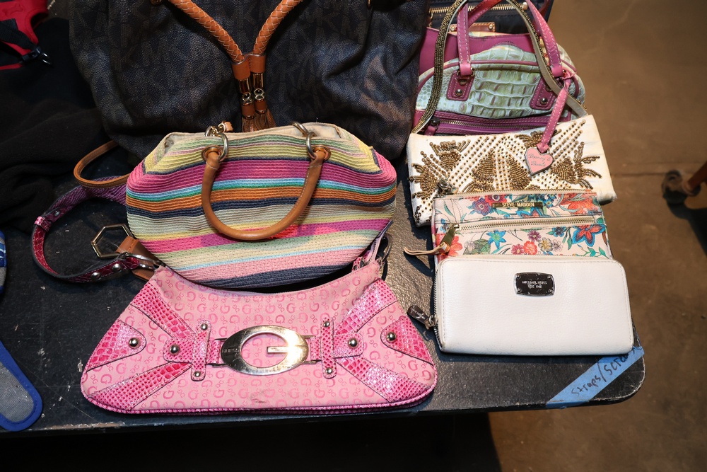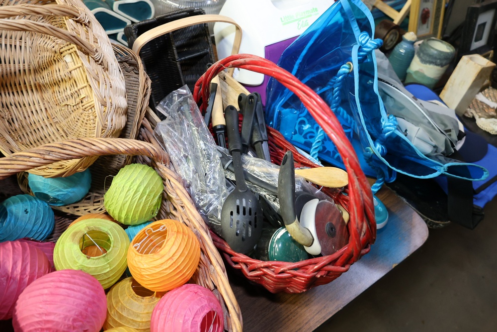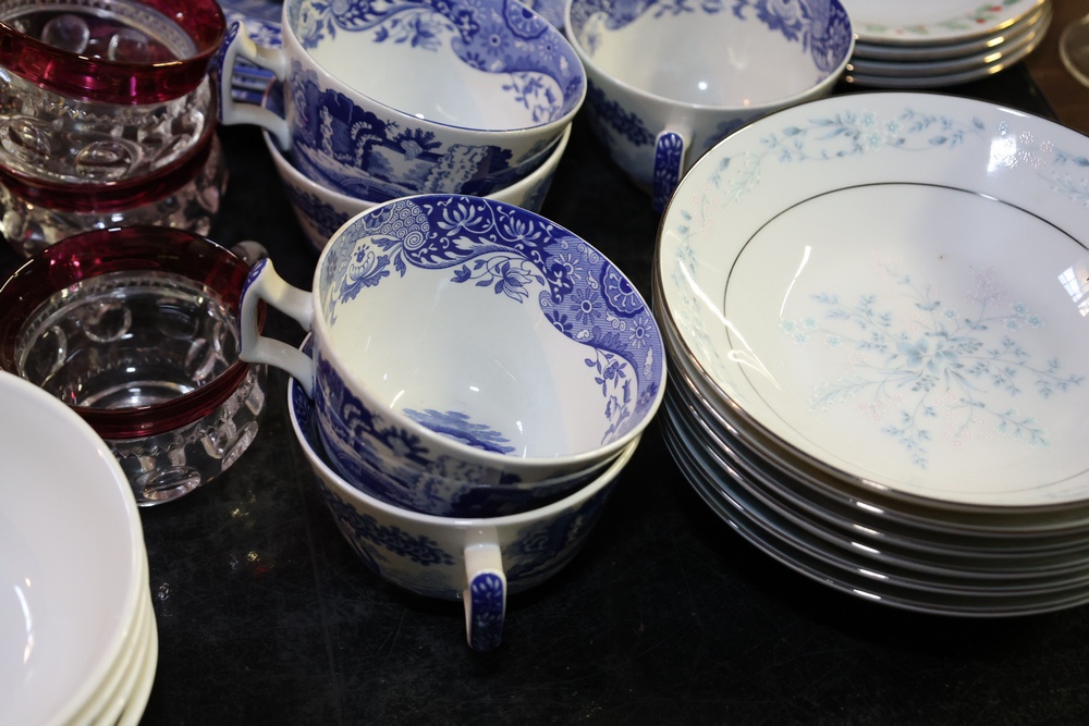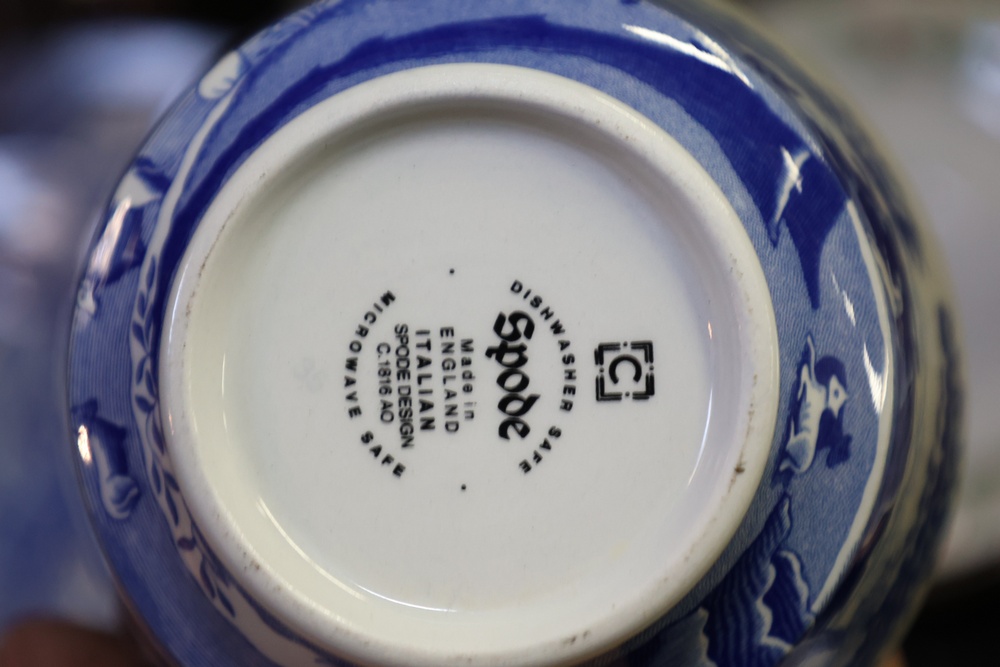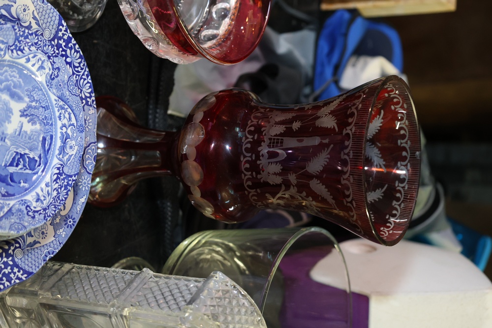Spode Blue Italian dinnerware made in England with scenic transferware designs, including dinner and salad plates, bowls, and matching cups; complemented by ruby red glass pedestal dishes, a crystal lidded candy jar, and vintage pressed glass pieces. Includes Rival blender base and pitcher, cookware with lids, holiday-themed Corelle plates with holly design, plastic cutlery, knife block, and ceramic mugs in a countertop stand. Assorted framed art prints, decorative photo frames in multiple styles, metal easels, crocheted doilies, and woven storage baskets. Selection of handbags and clutches including Frye nylon backpack and pouch, Michael Kors drawstring shoulder bag, colorful striped handbag, and embellished wristlets. Also includes a Panasonic DVD/CD player in original box, framed horse print, Stephen King hardcover with bonus CD, pet clothing and accessories, laundry caddy, and a variety of linens, decor, and household accessories. Excludes tables. Buyer must take all.