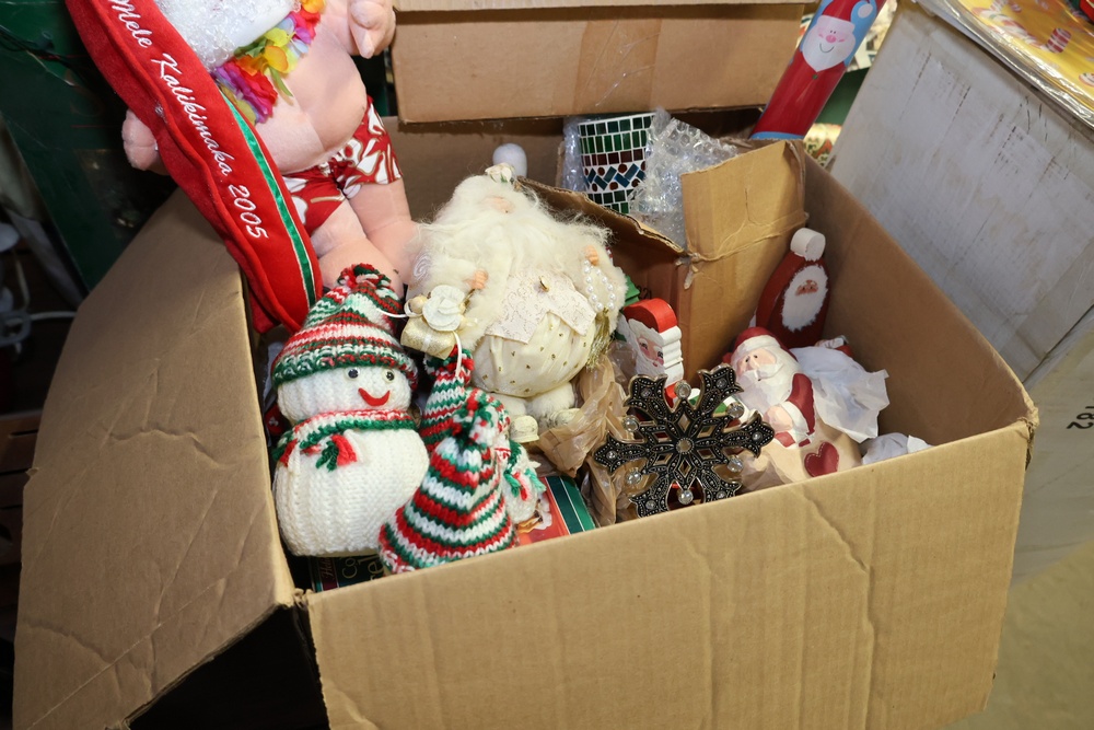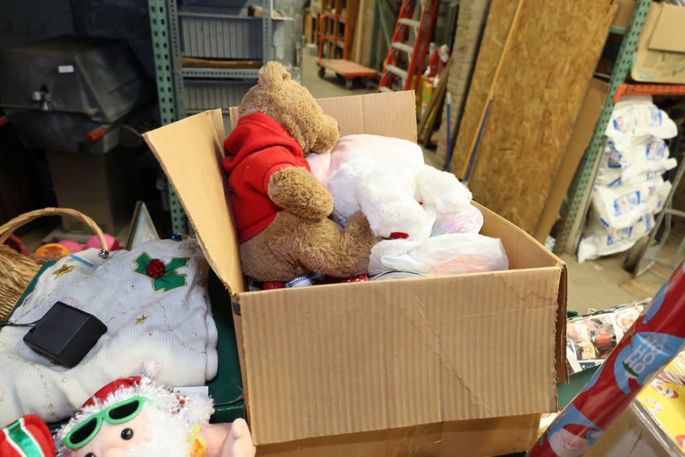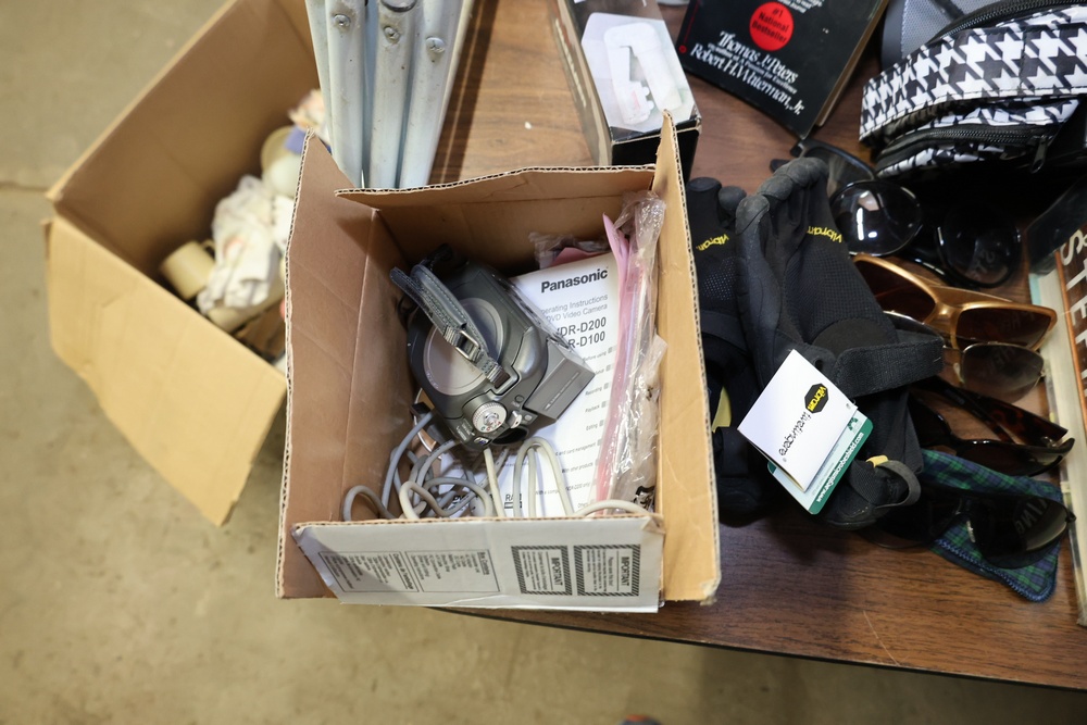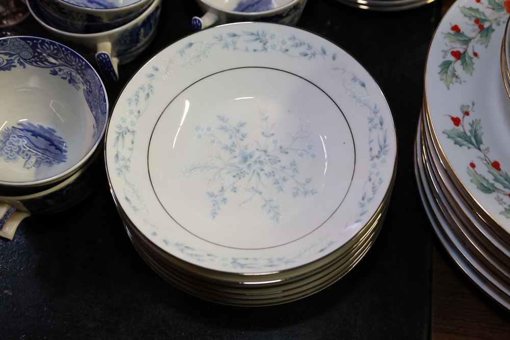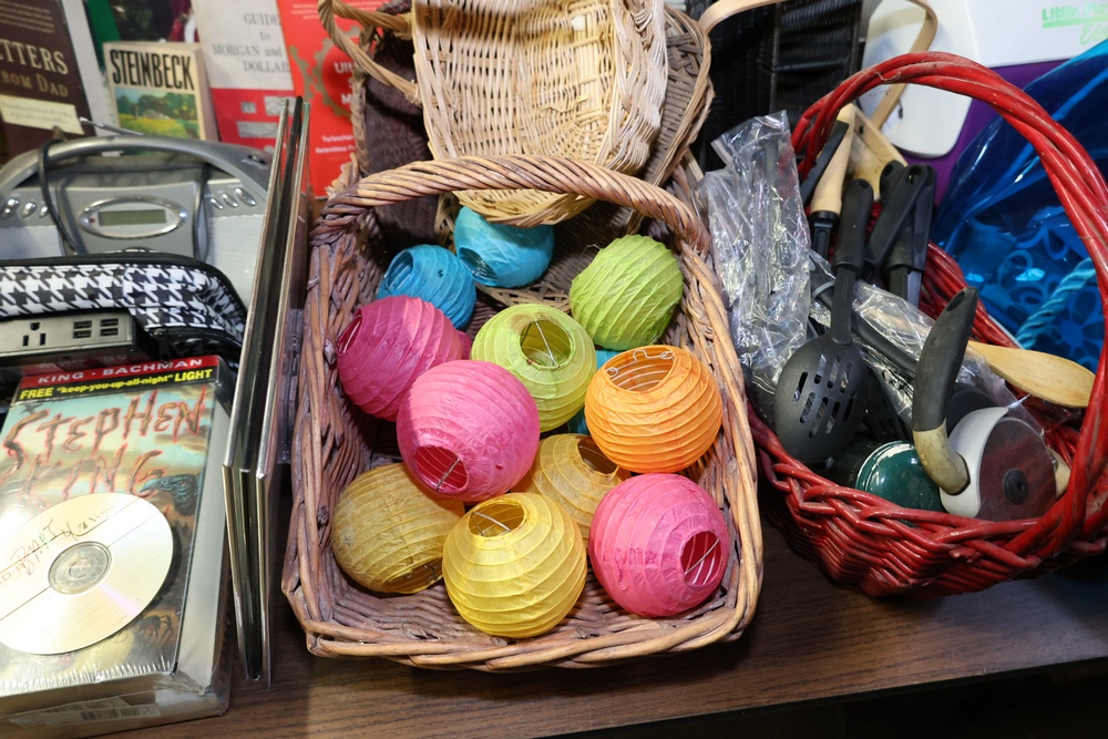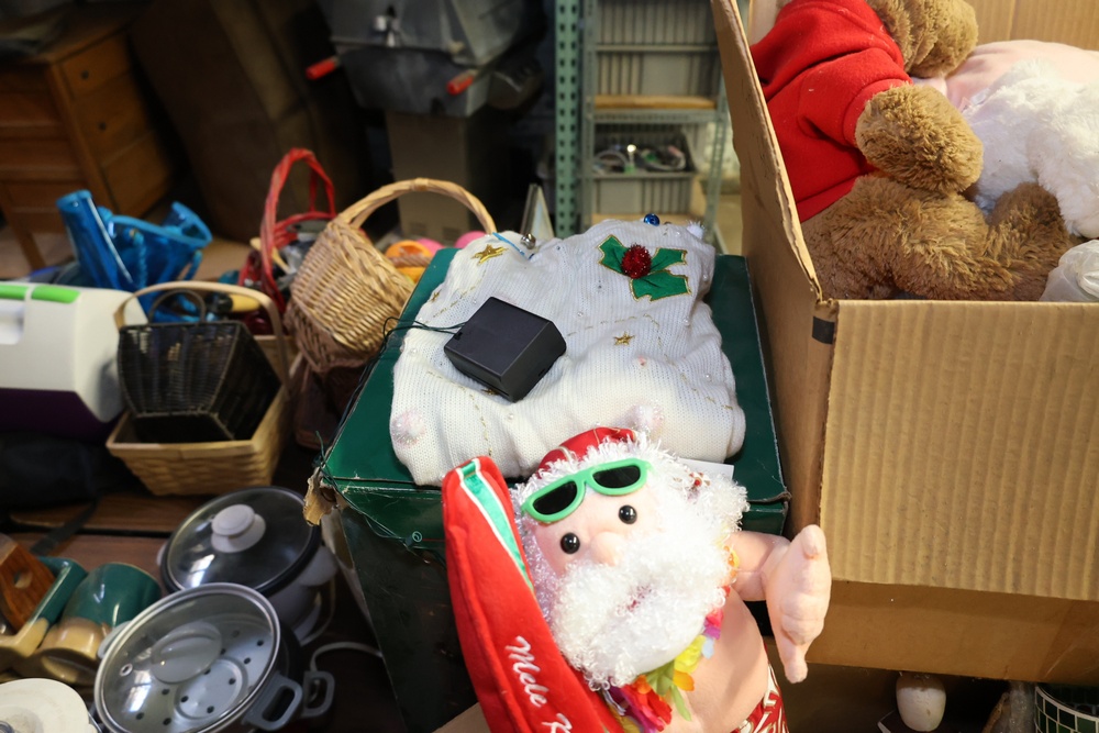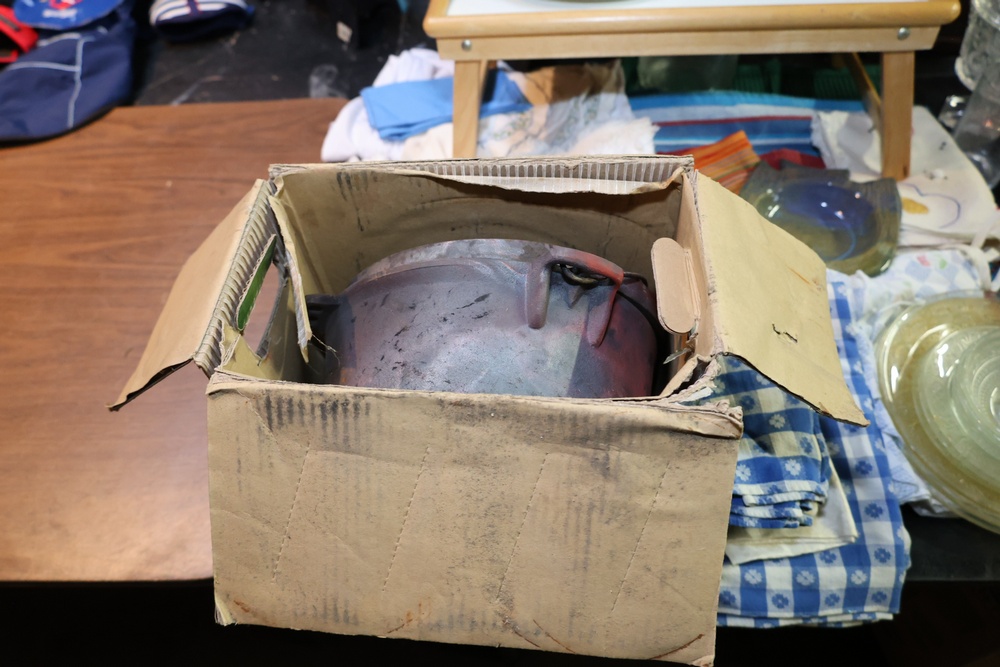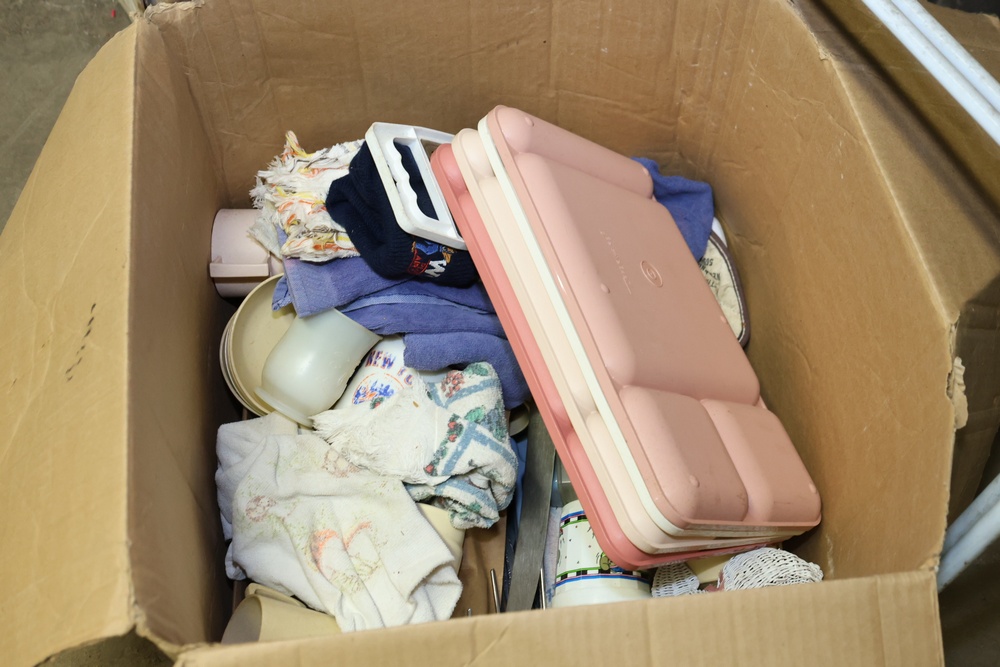 Spode Blue Italian dinnerware made in England with scenic transferware designs, including dinner and salad plates, bowls, and matching cups; complemented by ruby red glass pedestal dishes, a crystal lidded candy jar, and vintage pressed glass pieces. Includes Rival blender base and pitcher, cookware with lids, holiday-themed Corelle plates with holly design, plastic cutlery, knife block, and ceramic mugs in a countertop stand. Assorted framed art prints, decorative photo frames in multiple styles, metal easels, crocheted doilies, and woven storage baskets. Selection of handbags and clutches including Frye nylon backpack and pouch, Michael Kors drawstring shoulder bag, colorful striped handbag, and embellished wristlets. Also includes a Panasonic DVD/CD player in original box, framed horse print, Stephen King hardcover with bonus CD, pet clothing and accessories, laundry caddy, and a variety of linens, decor, and household accessories. Excludes tables. Buyer must take all.