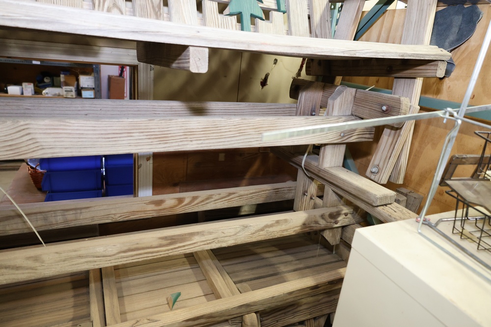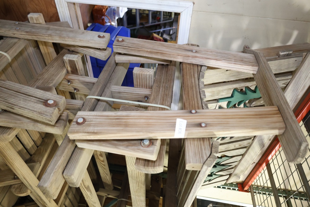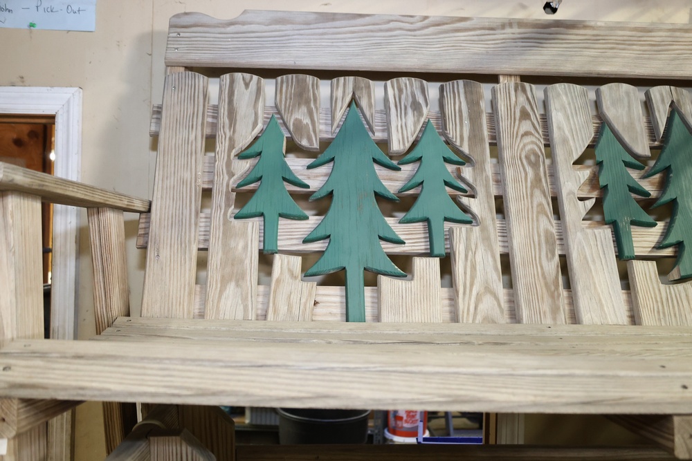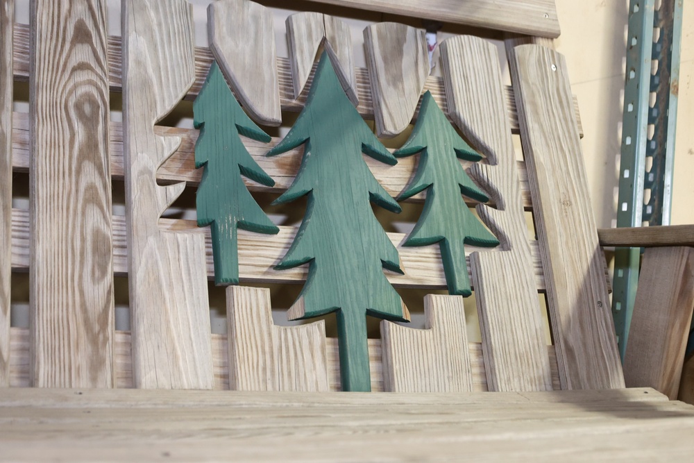 4 Wooden Adirondack Rocking Benches with Tree Design. Each bench features a slatted wooden design with green tree cutout accents on the backrest. Made of durable wood construction and ideal for outdoor seating. Pickup only.