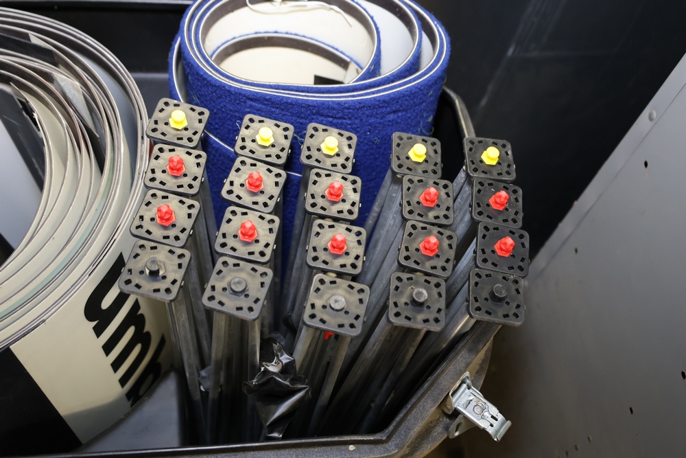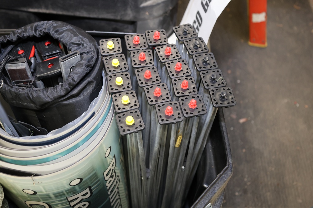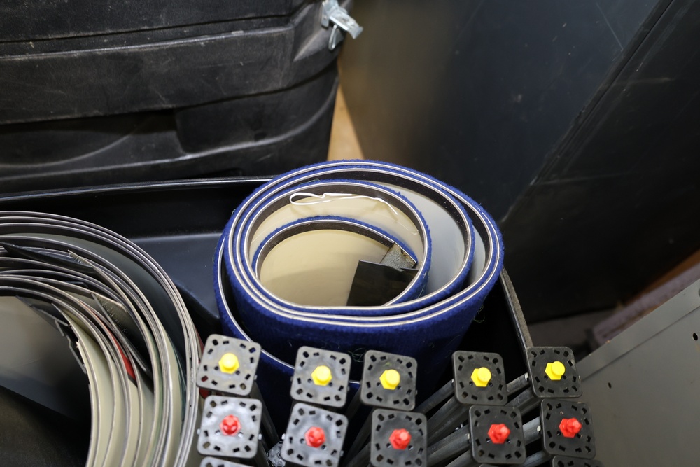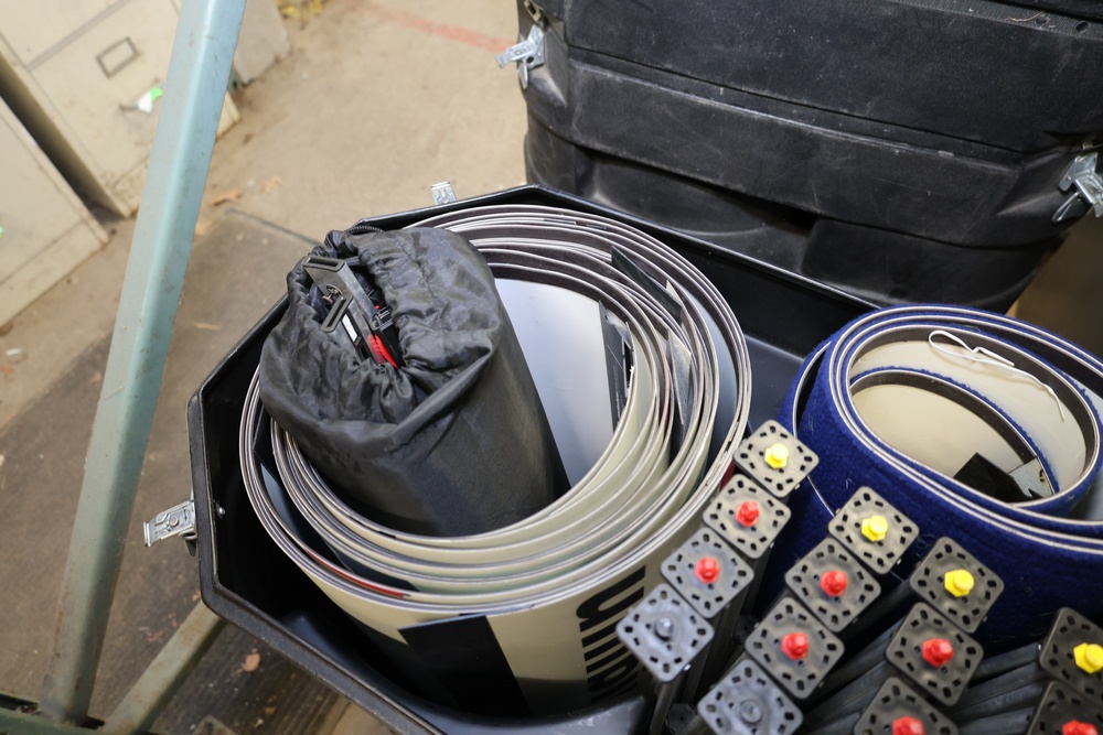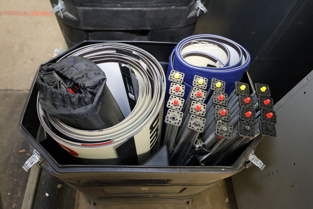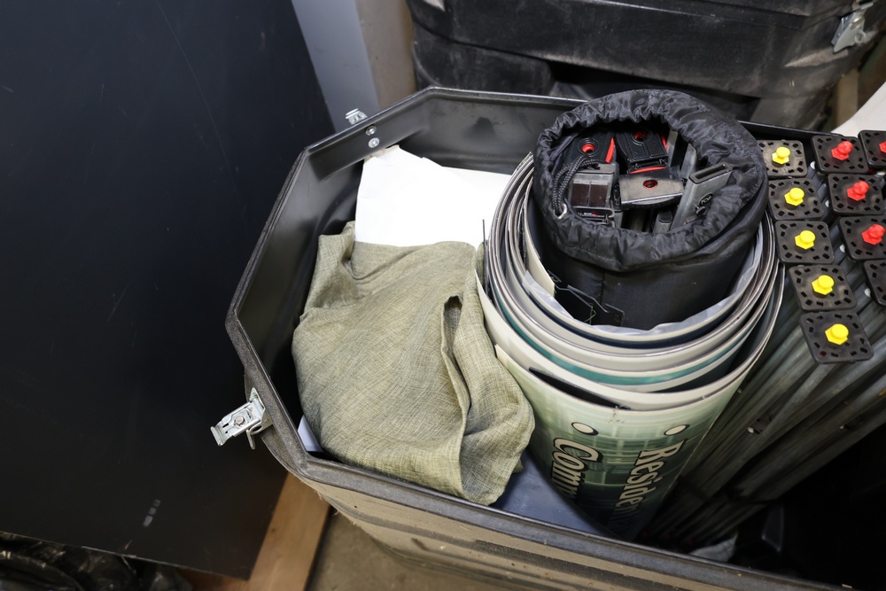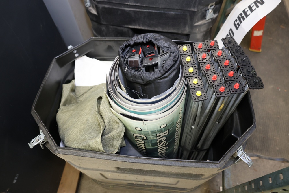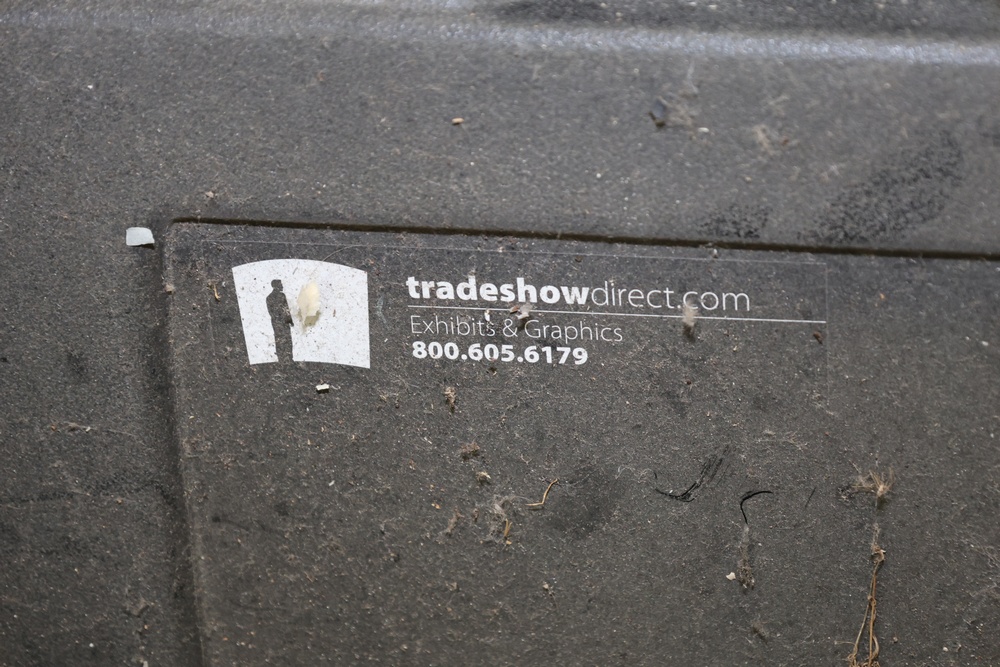Two Trade Show Signs and Graphics in Hard-Shell Storage Cases. Includes rolled graphic banners, stand components, and related items stored in secure plastic transport containers. Some wear is visible on the storage cases. Pickup only.