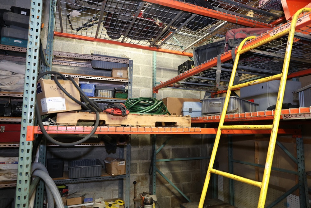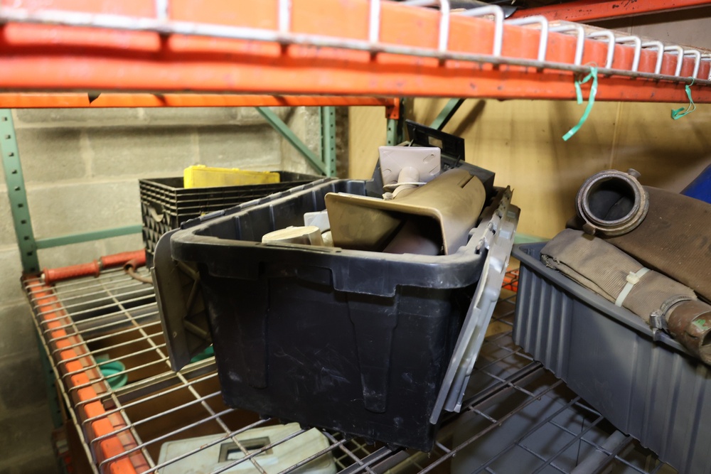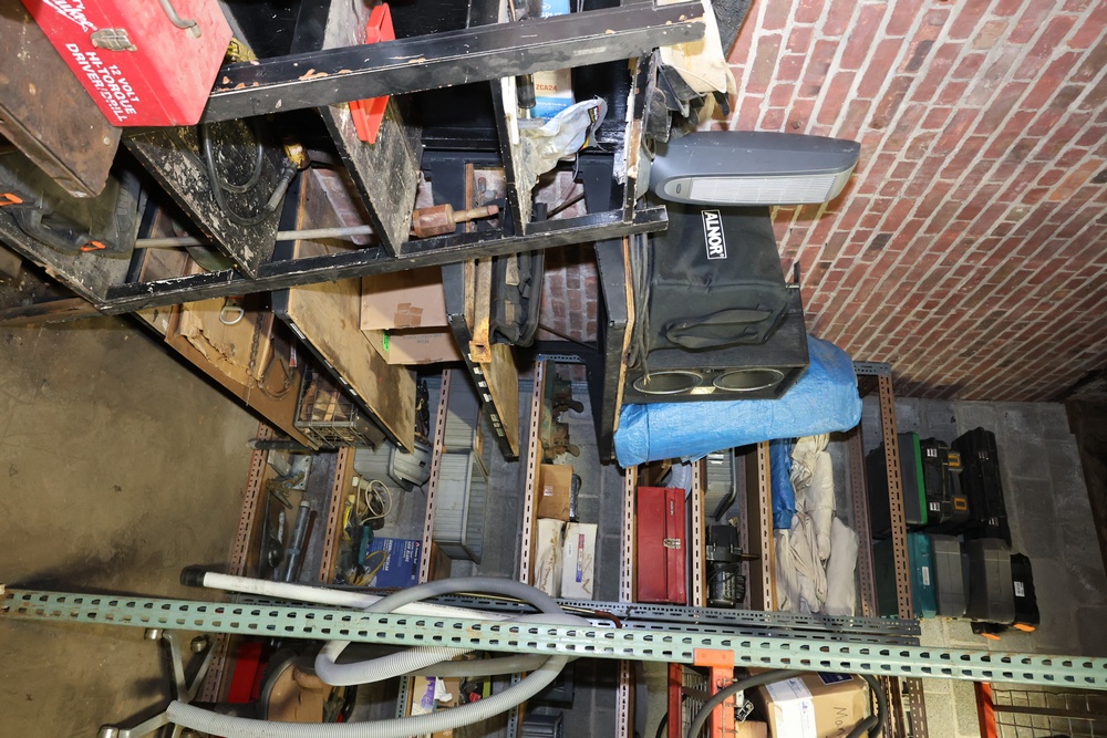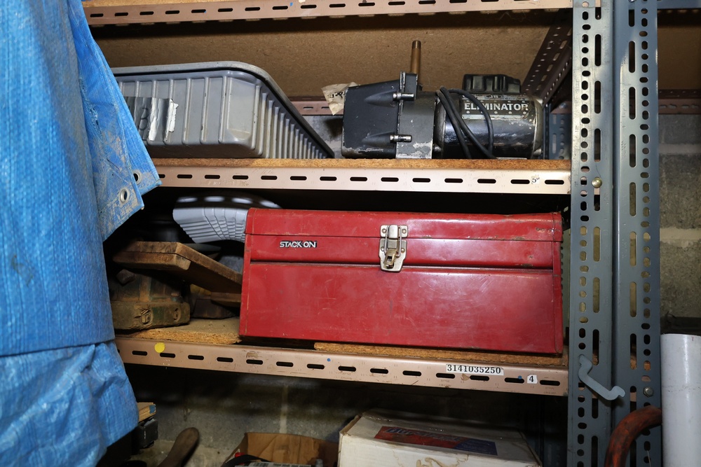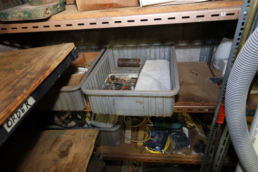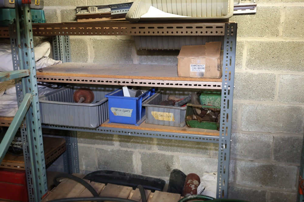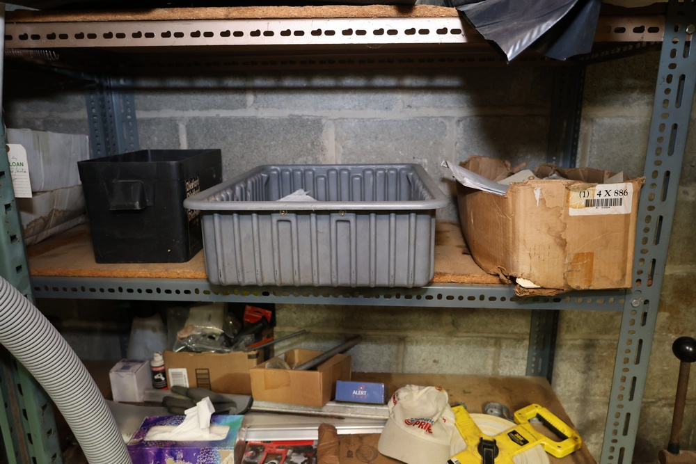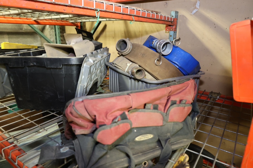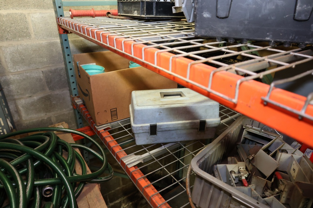 Remaining contents of shelving units in room. Includes assorted tools, hoses, boxes, and equipment stored on the units, empty tool boxes, hardware, tools, etc. Excludes shelving, mowers, tools and equipment in corner (not shown in photos) and other lots. Buyer must take all.