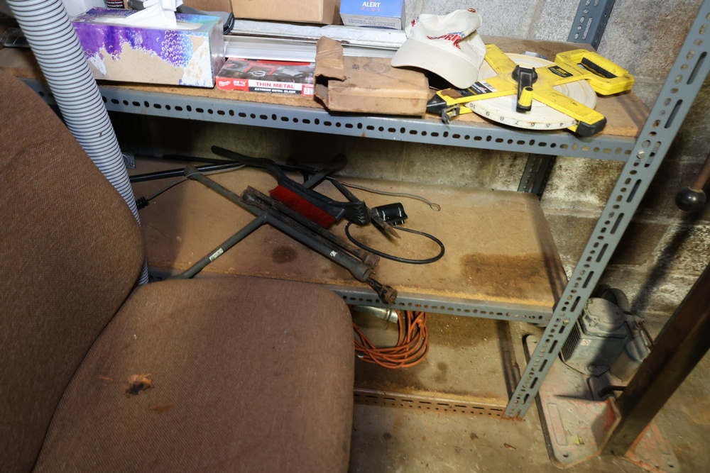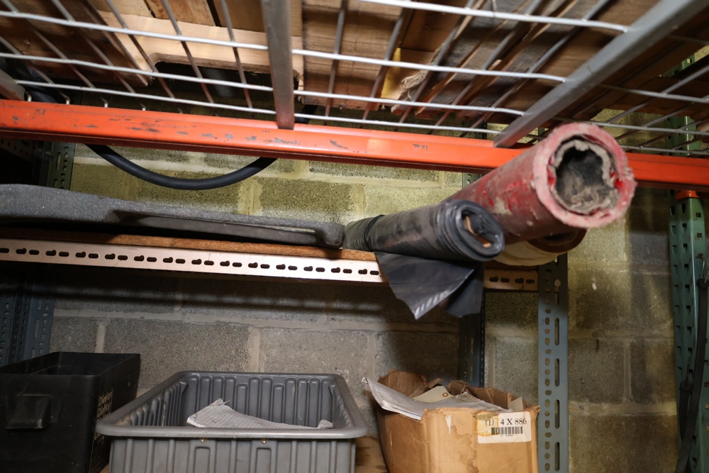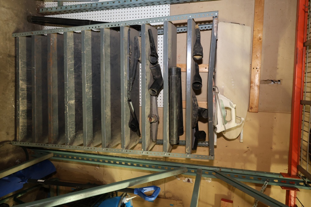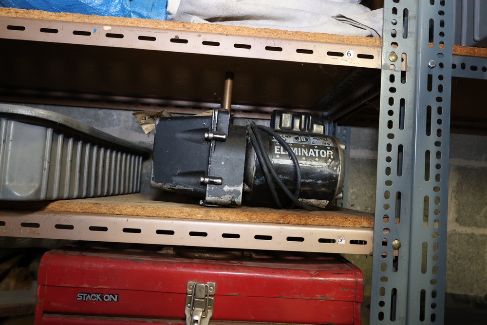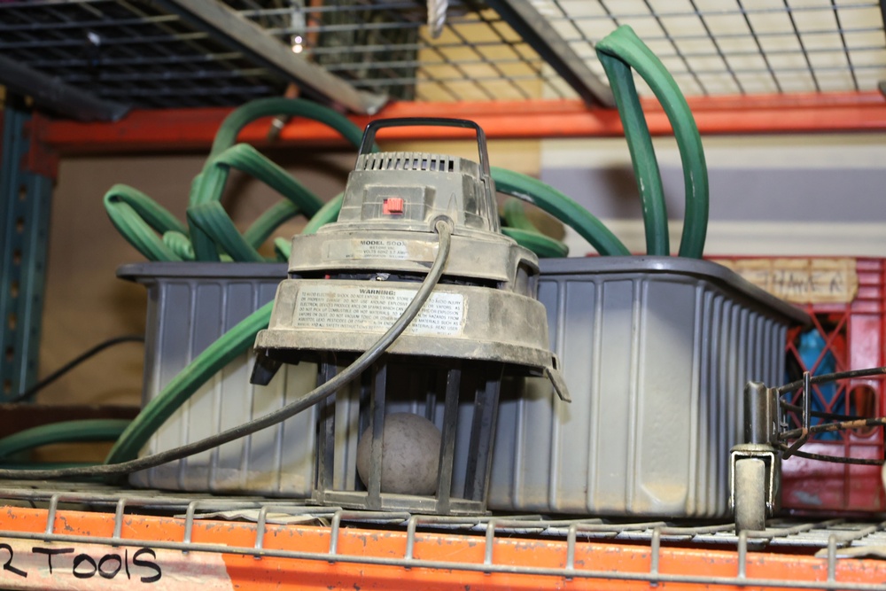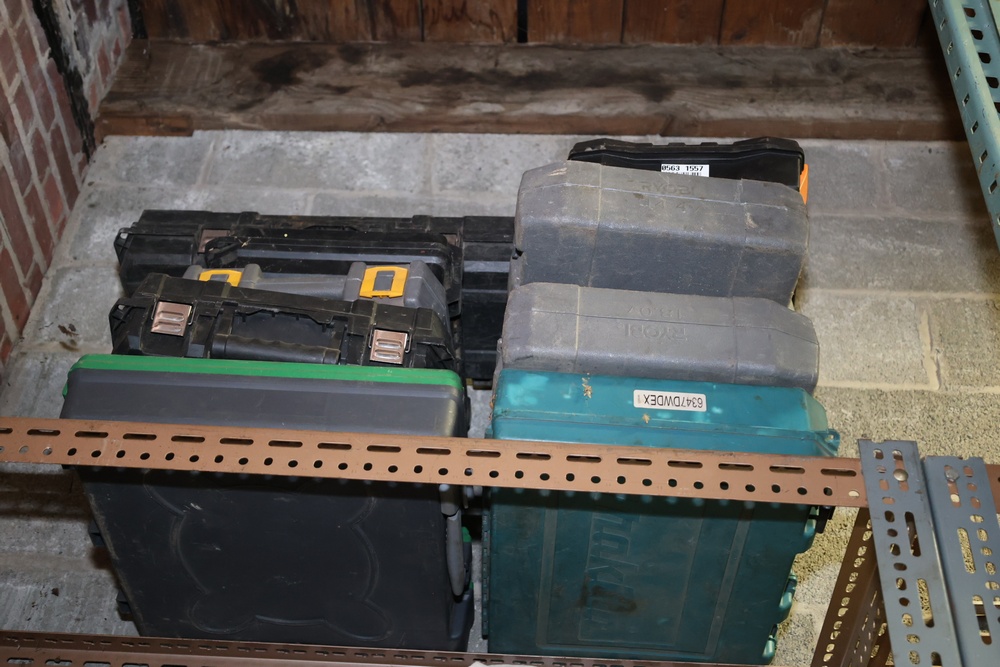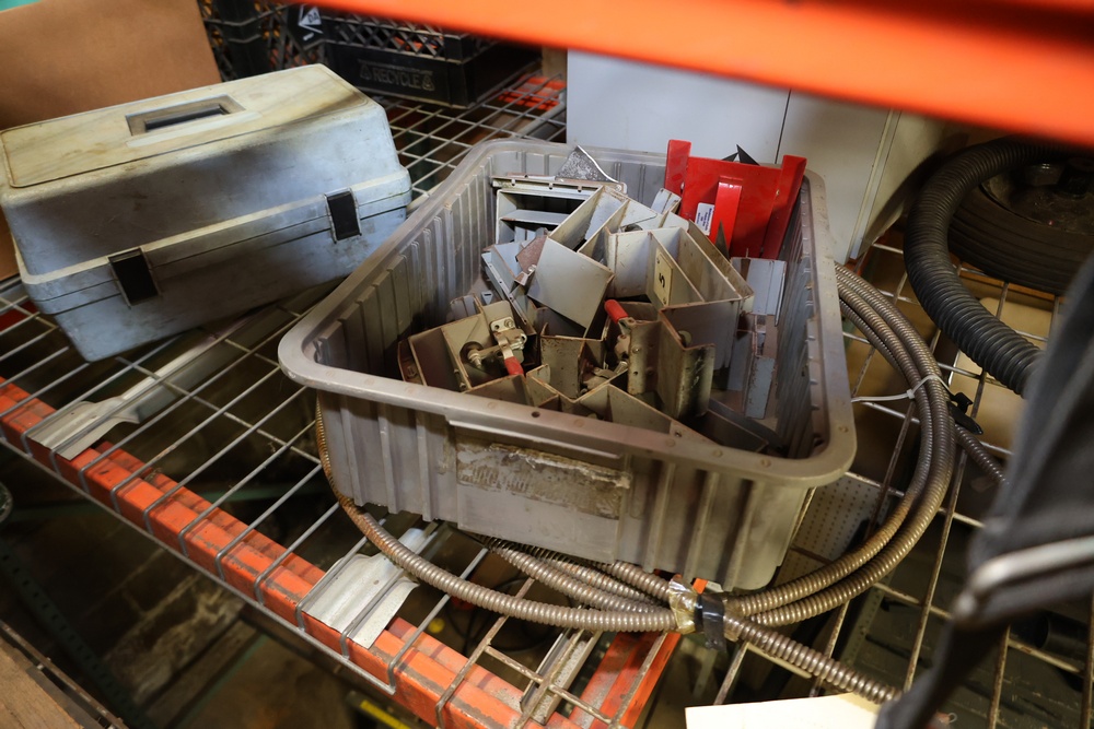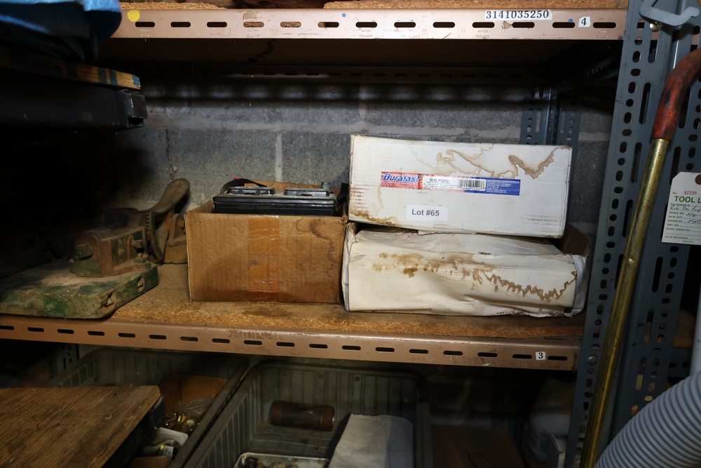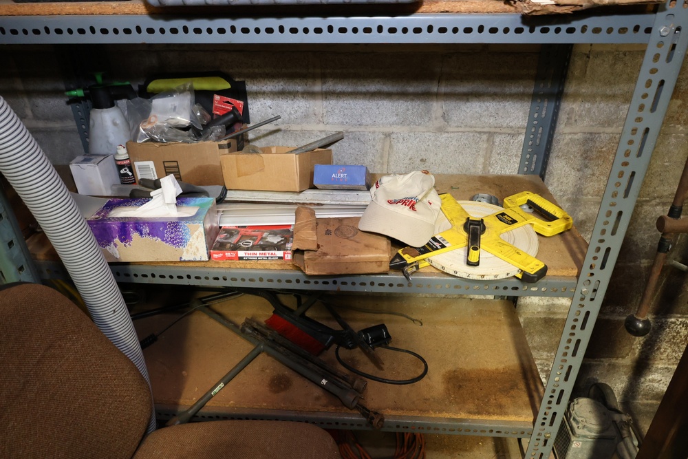 Remaining contents of shelving units in room. Includes assorted tools, hoses, boxes, and equipment stored on the units, empty tool boxes, hardware, tools, etc. Excludes shelving, mowers, tools and equipment in corner (not shown in photos) and other lots. Buyer must take all.