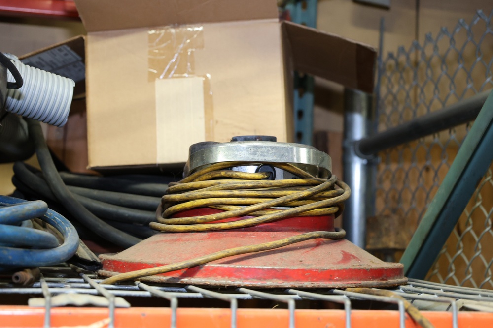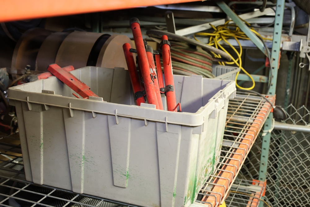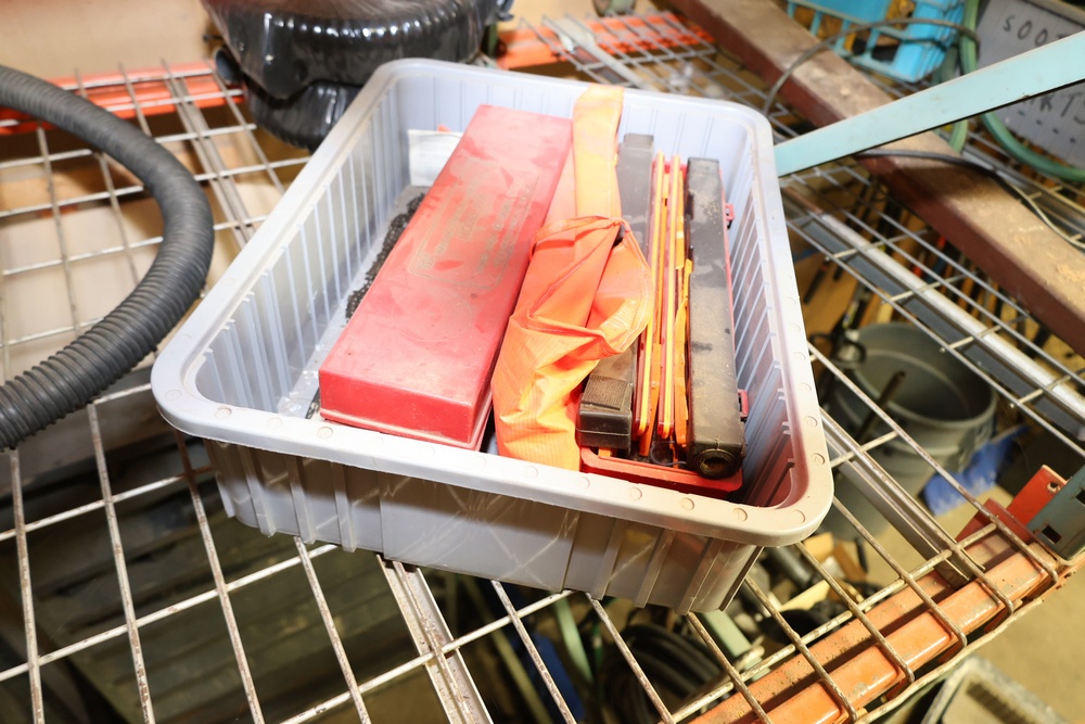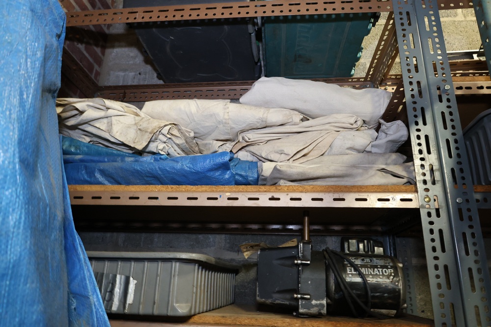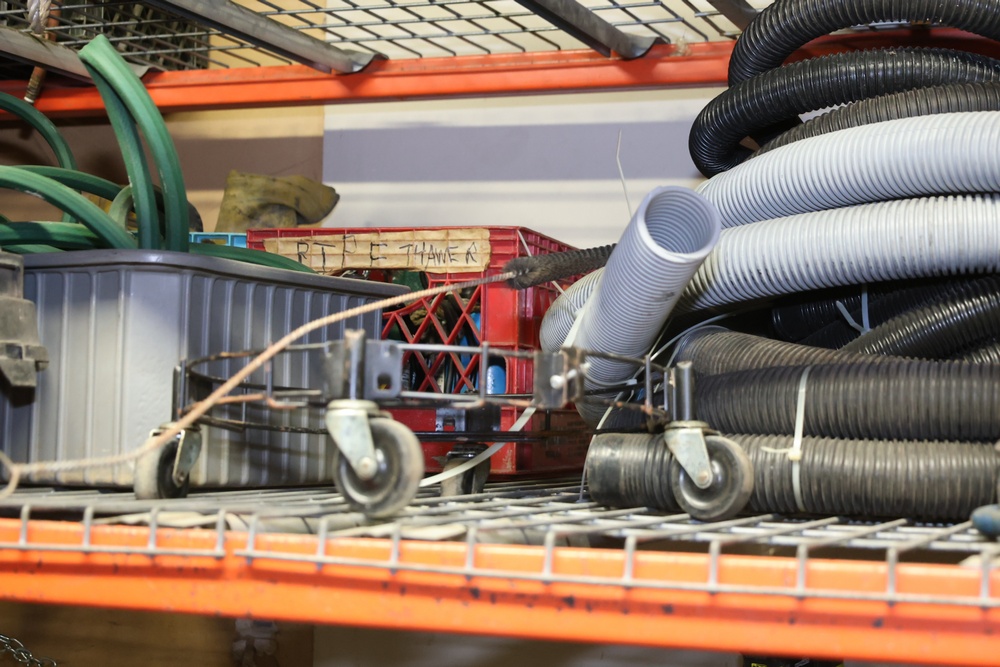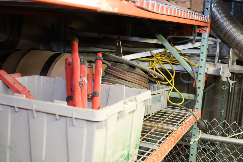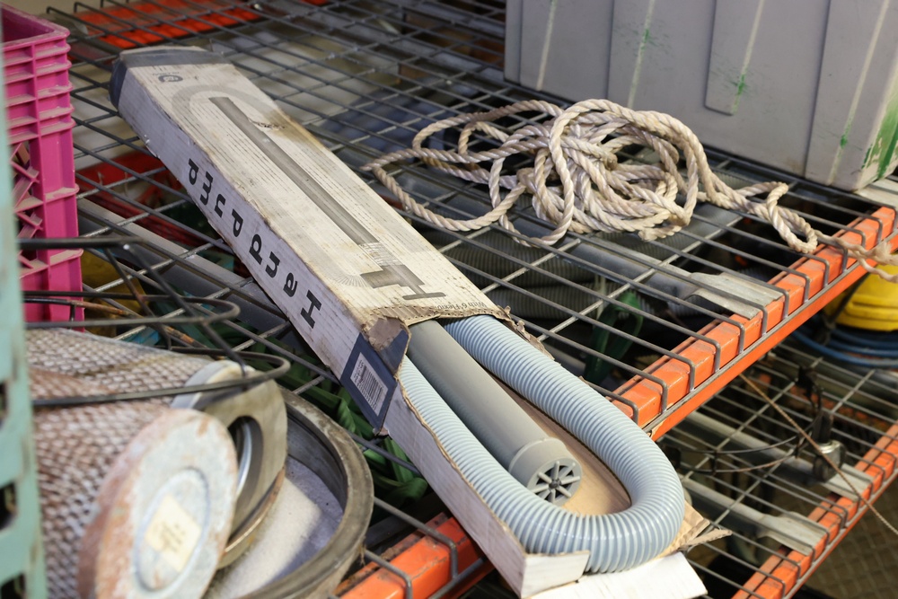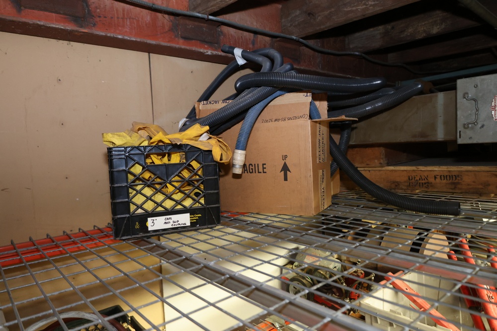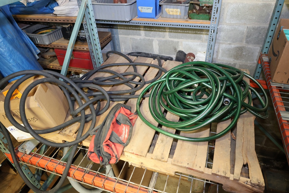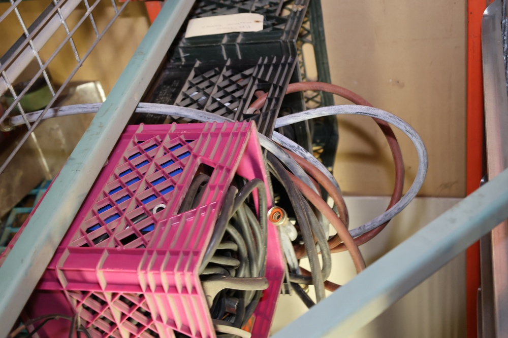 Remaining contents of shelving units in room. Includes assorted tools, hoses, boxes, and equipment stored on the units, empty tool boxes, hardware, tools, etc. Excludes shelving, mowers, tools and equipment in corner (not shown in photos) and other lots. Buyer must take all.