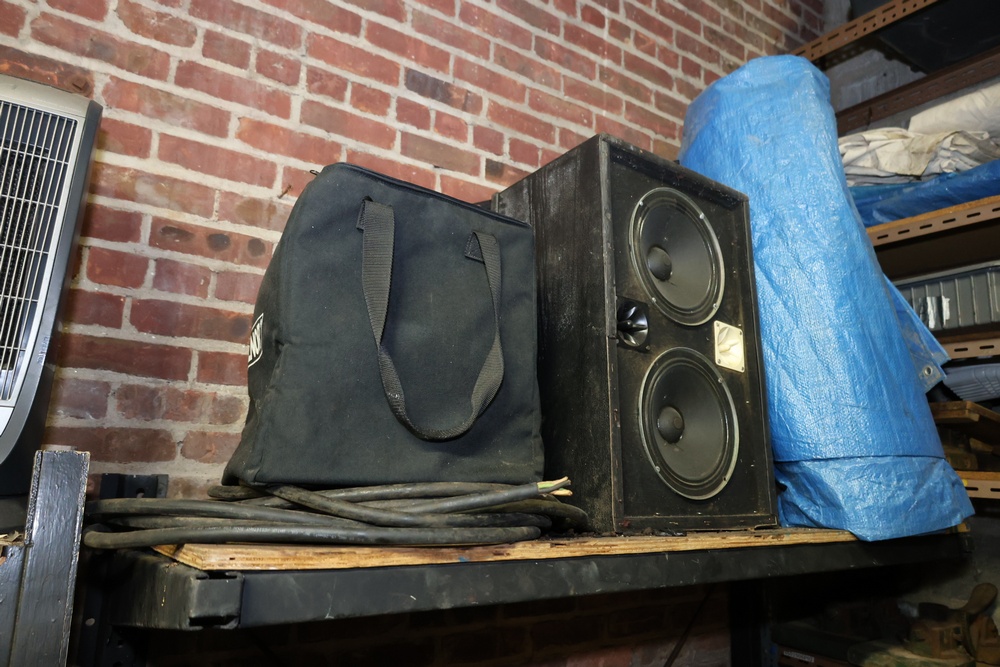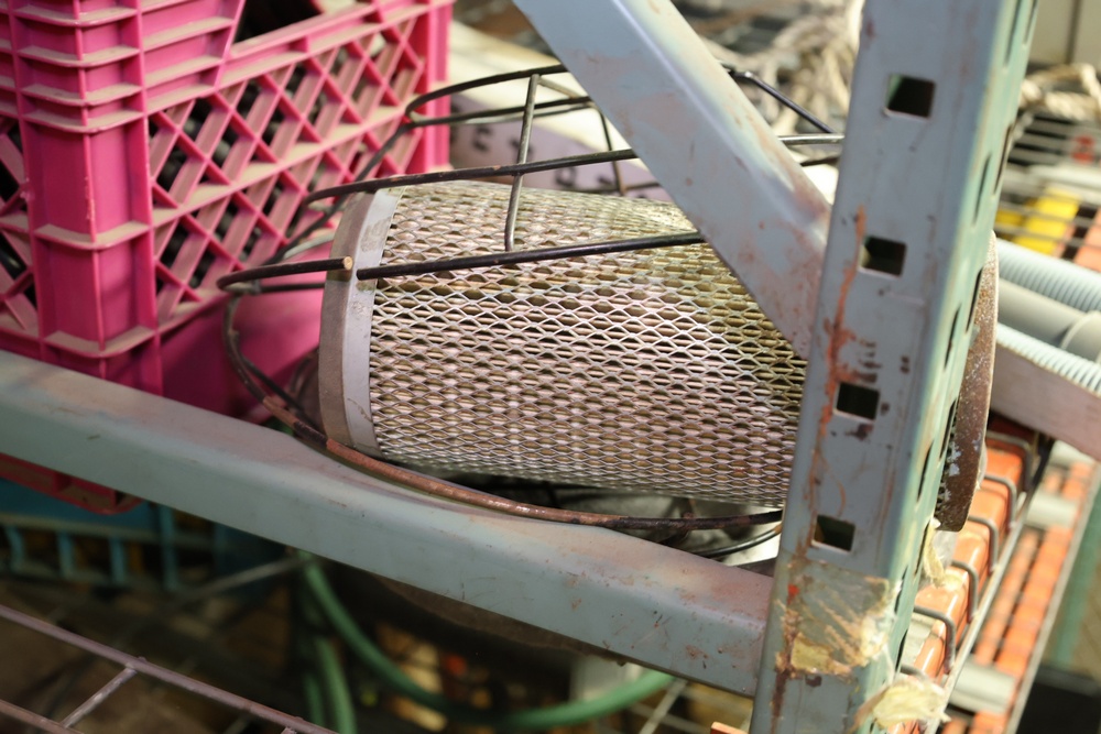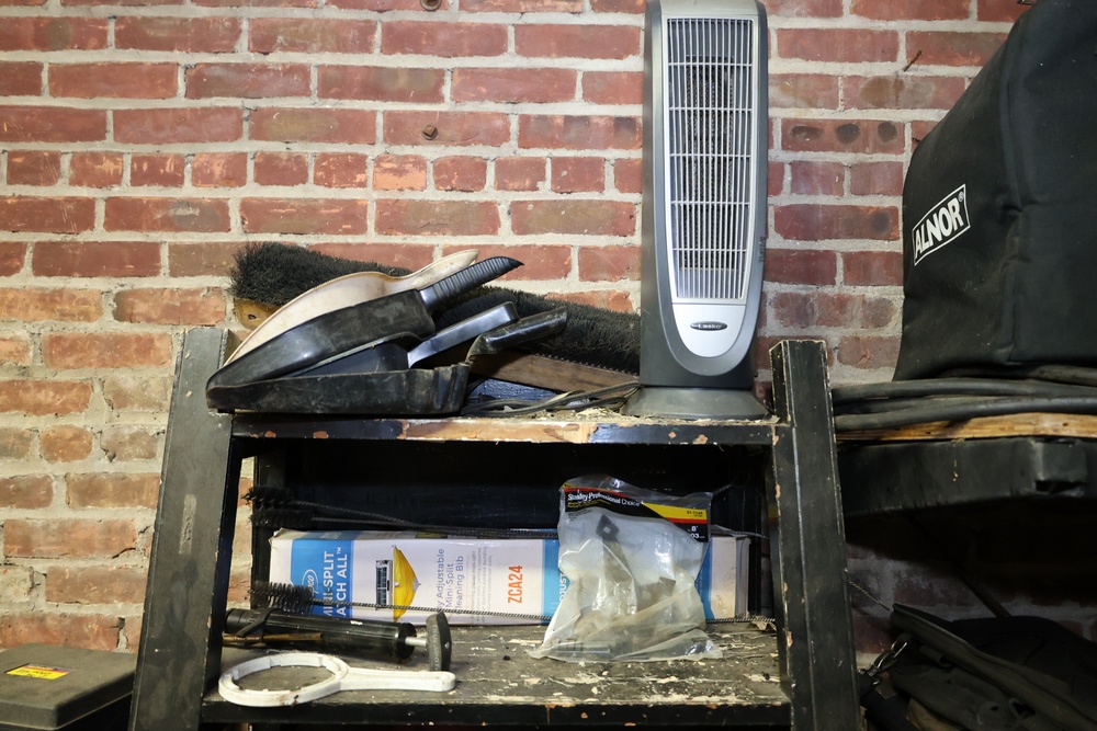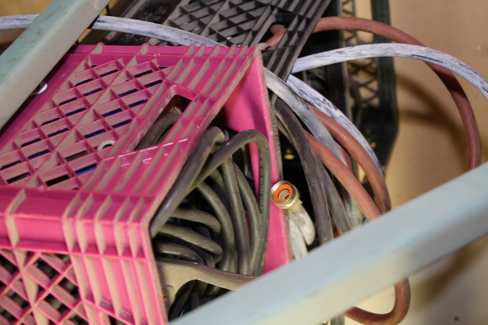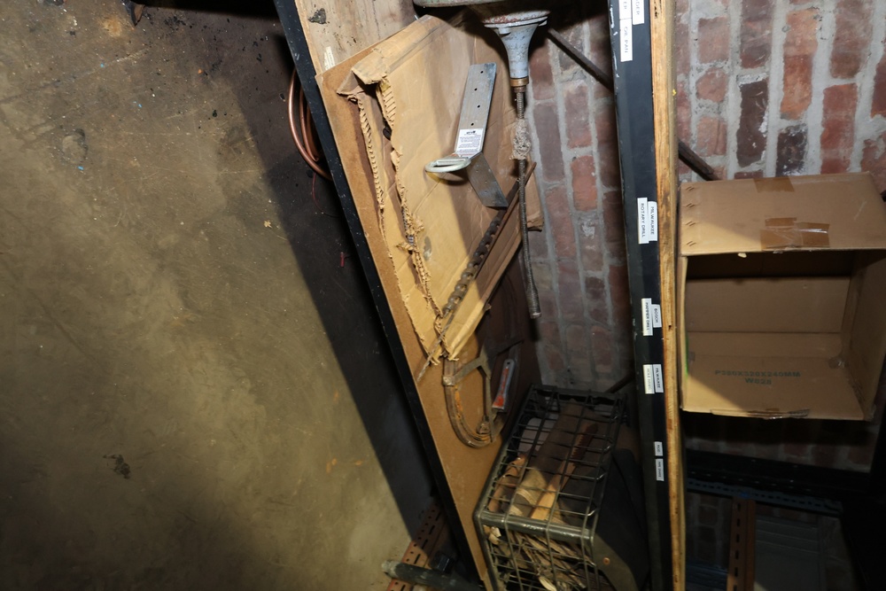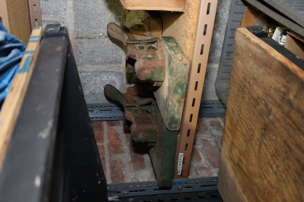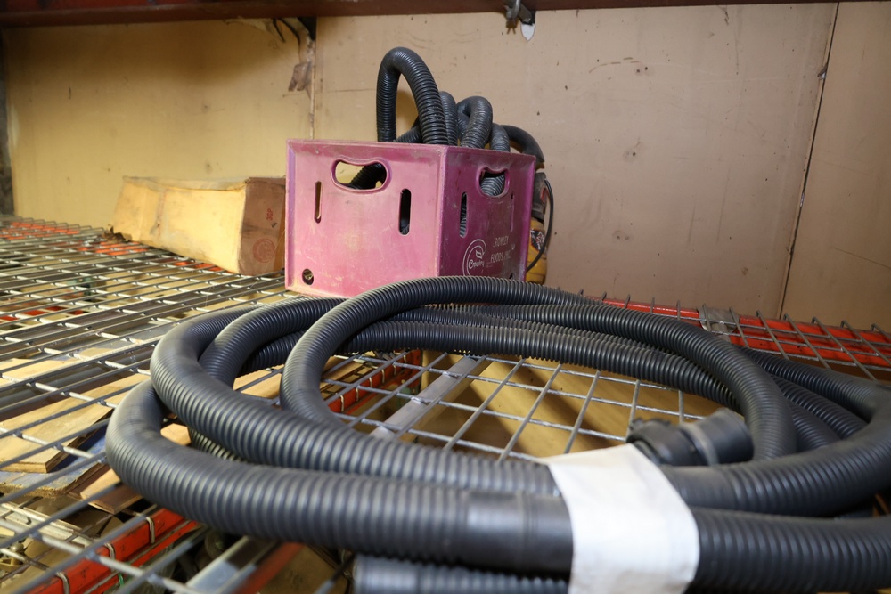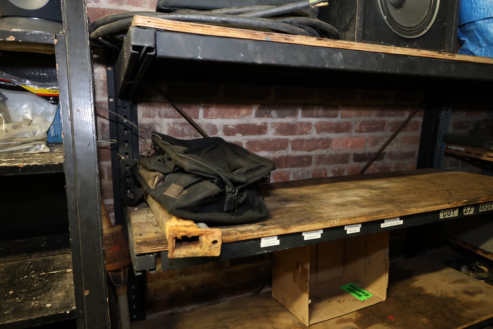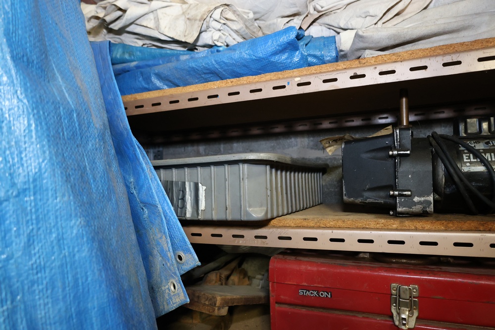 Remaining contents of shelving units in room. Includes assorted tools, hoses, boxes, and equipment stored on the units, empty tool boxes, hardware, tools, etc. Excludes shelving, mowers, tools and equipment in corner (not shown in photos) and other lots. Buyer must take all.