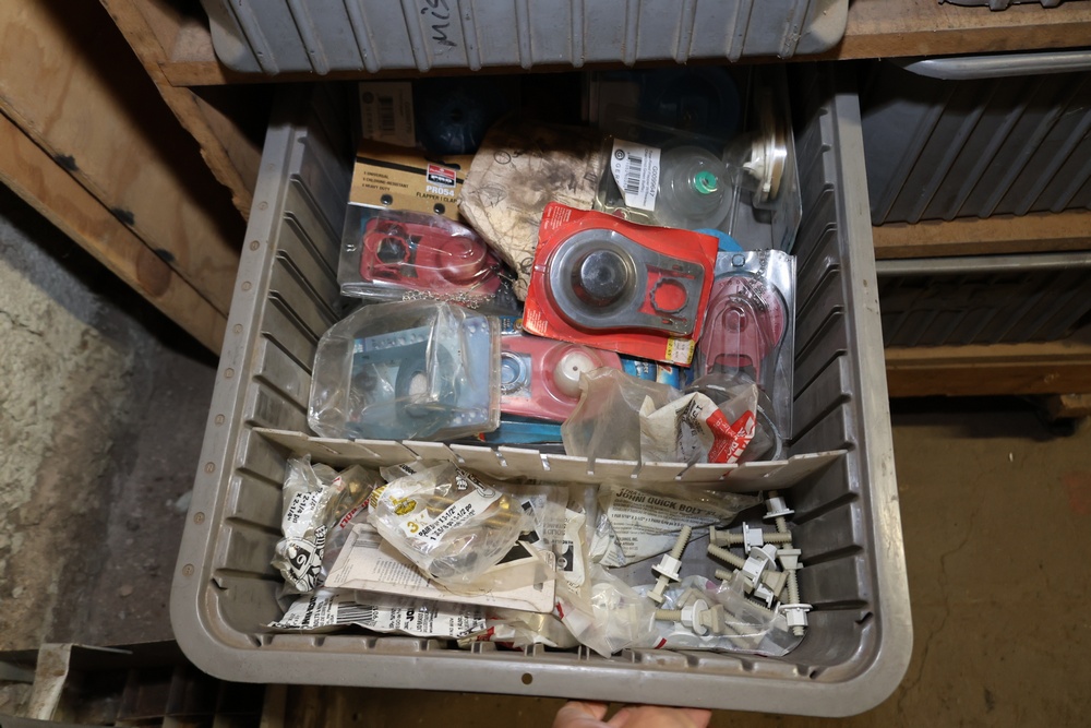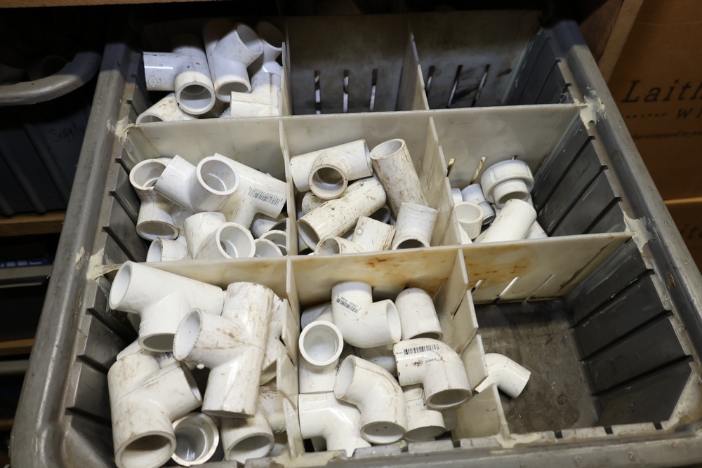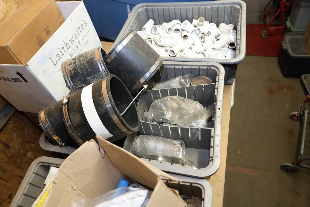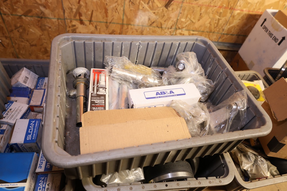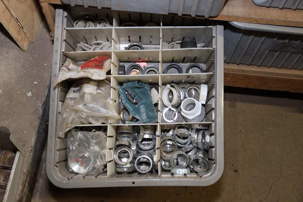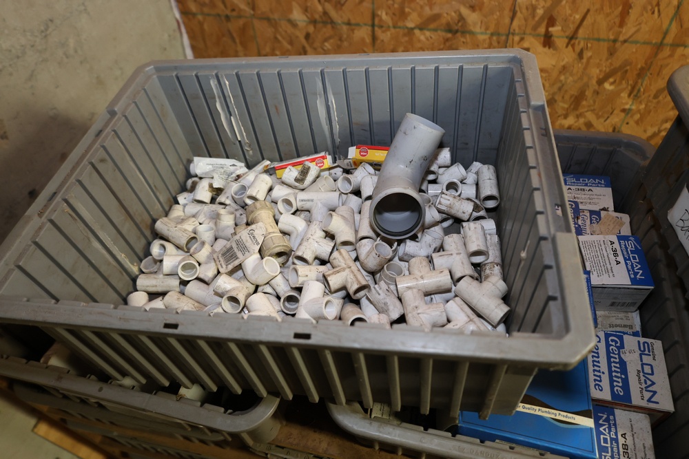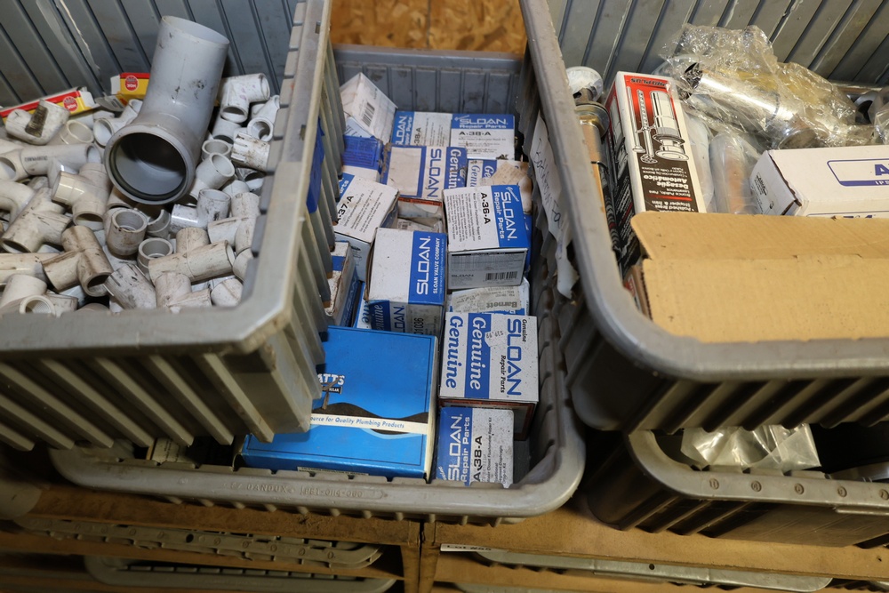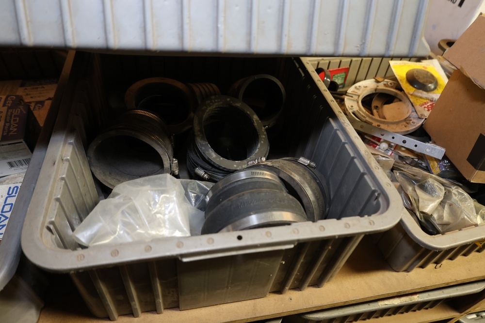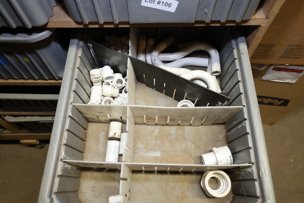 Storage Unit with Plumbing Supplies and Components. Includes large quantities of assorted plumbing materials, fittings, PVC pipe connectors, metal couplers, boxed components, and other hardware stored in gray bins on shelving. Buyer must take all.