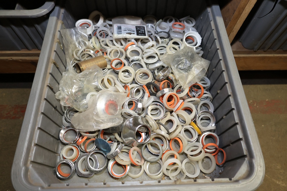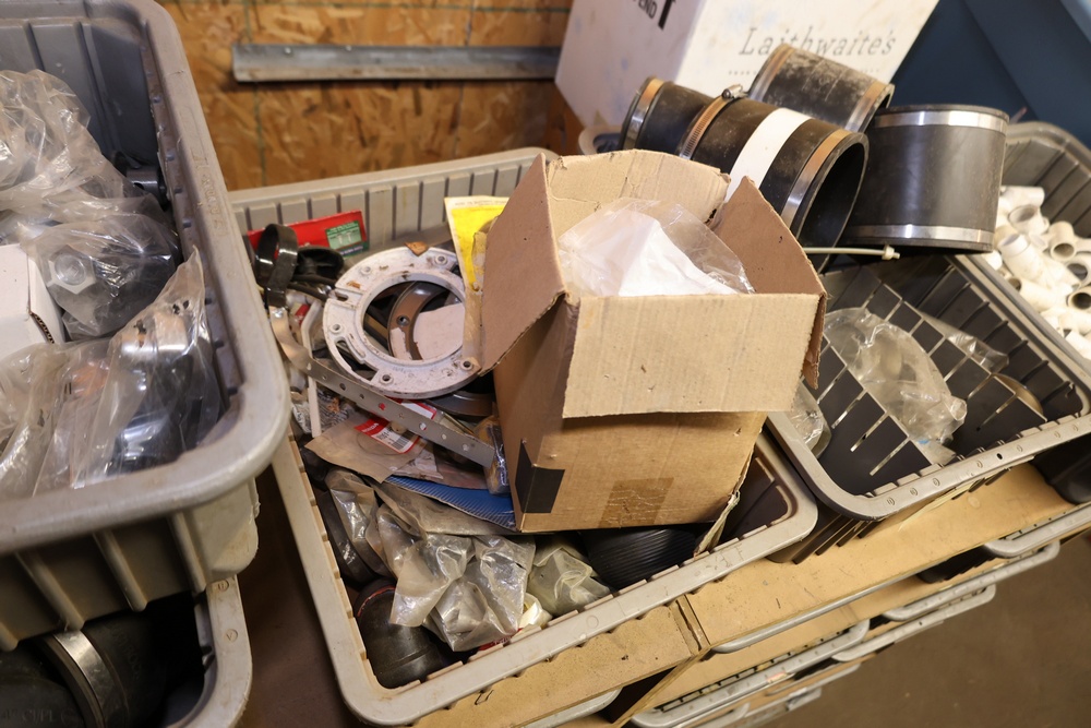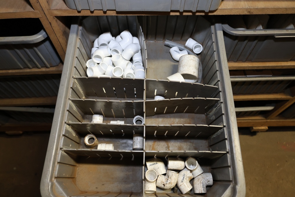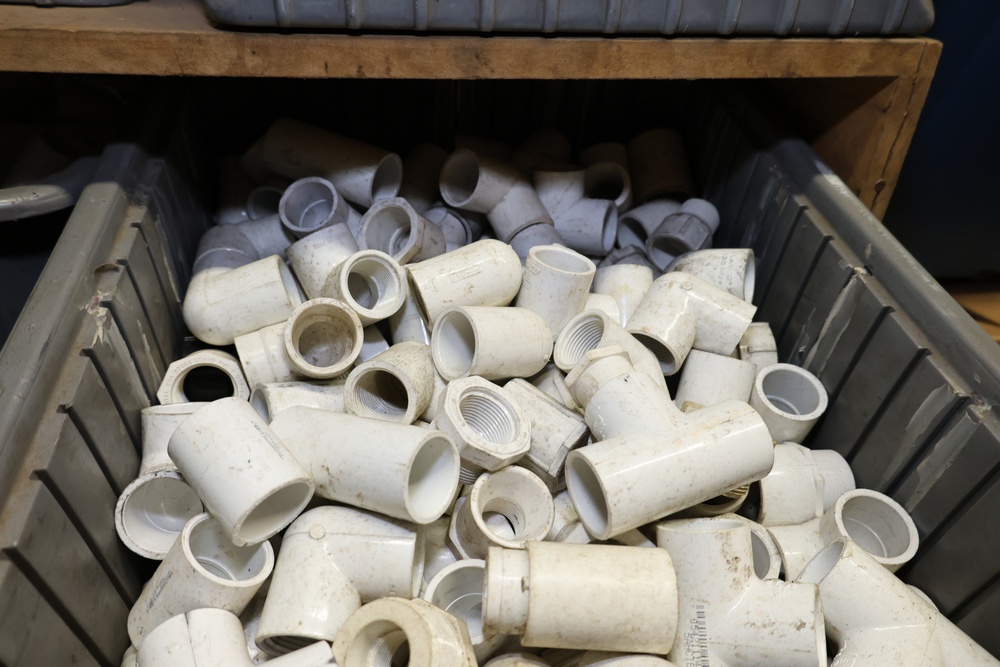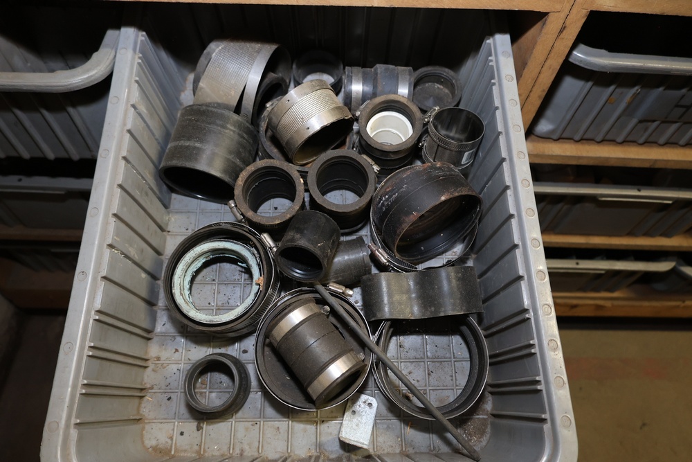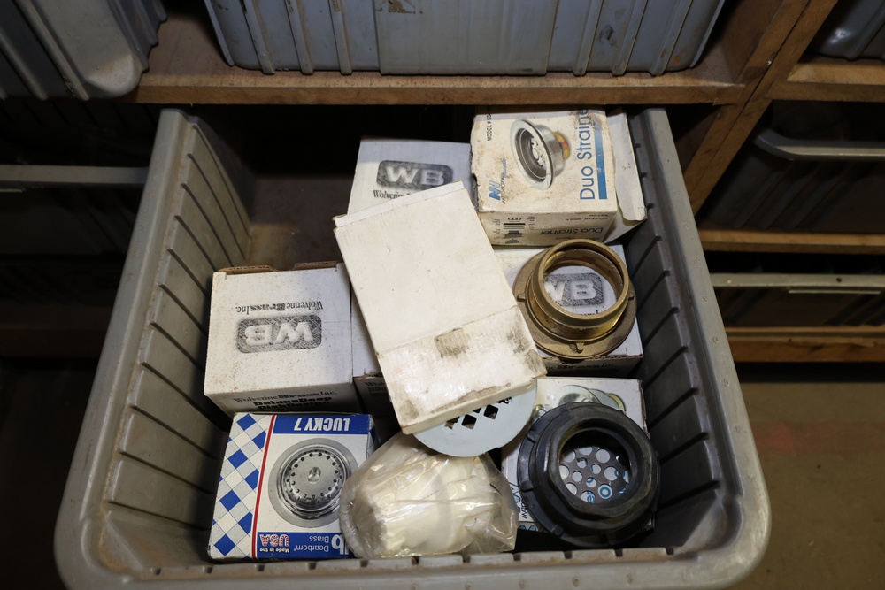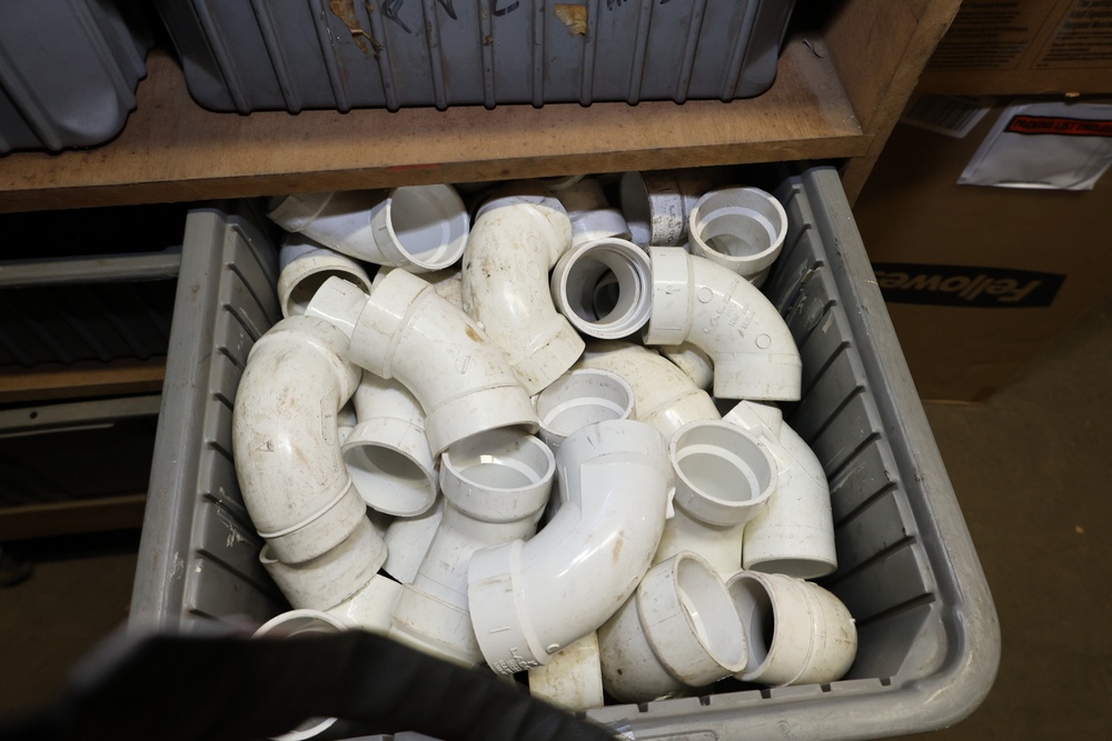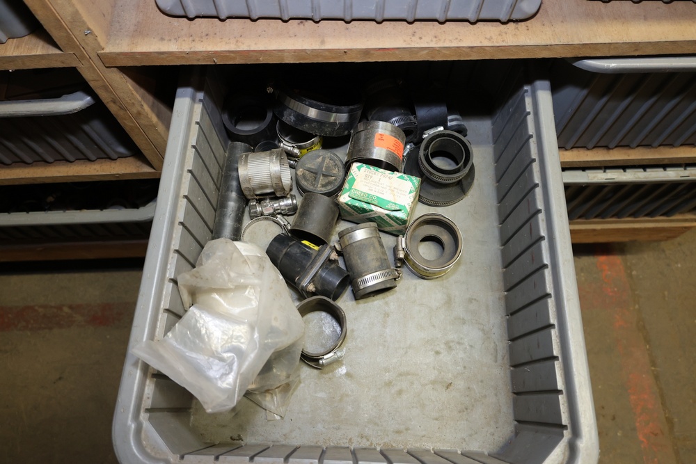 Storage Unit with Plumbing Supplies and Components. Includes large quantities of assorted plumbing materials, fittings, PVC pipe connectors, metal couplers, boxed components, and other hardware stored in gray bins on shelving. Buyer must take all.
