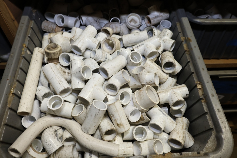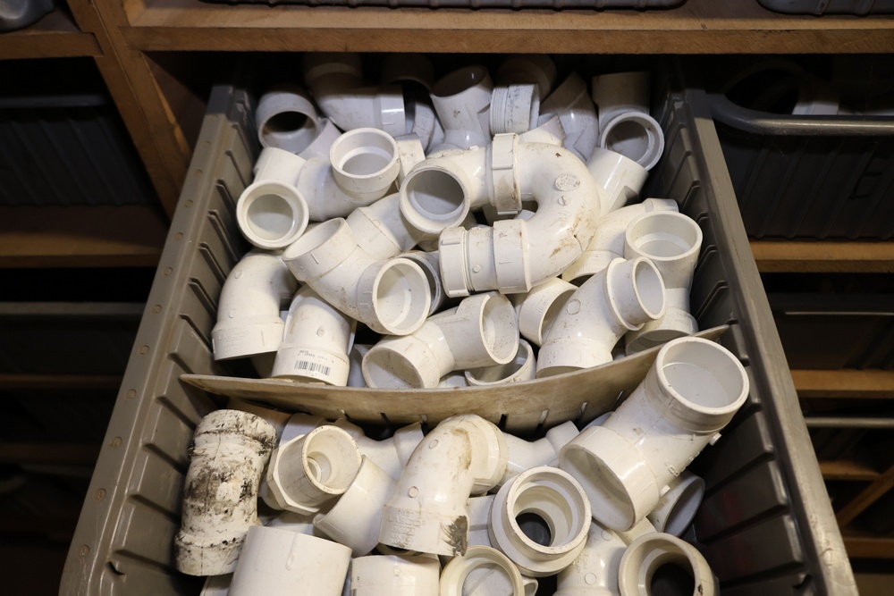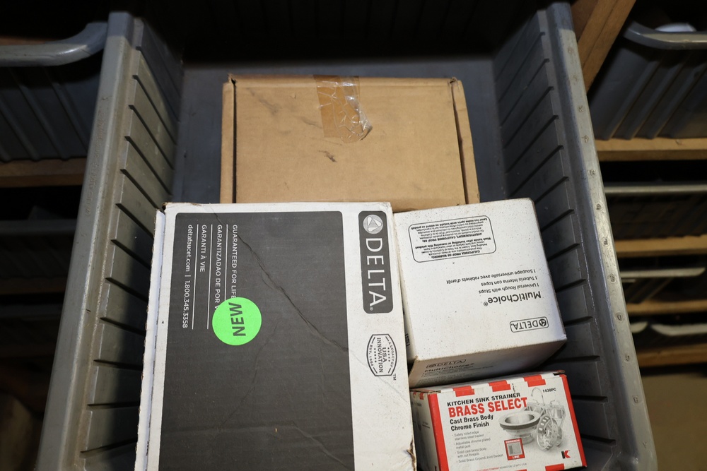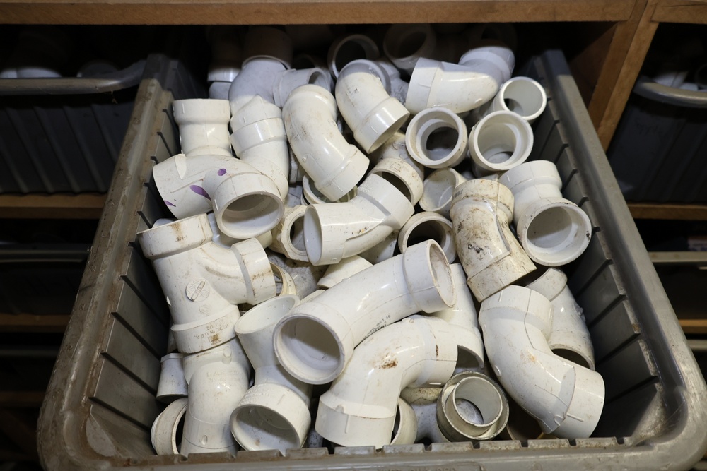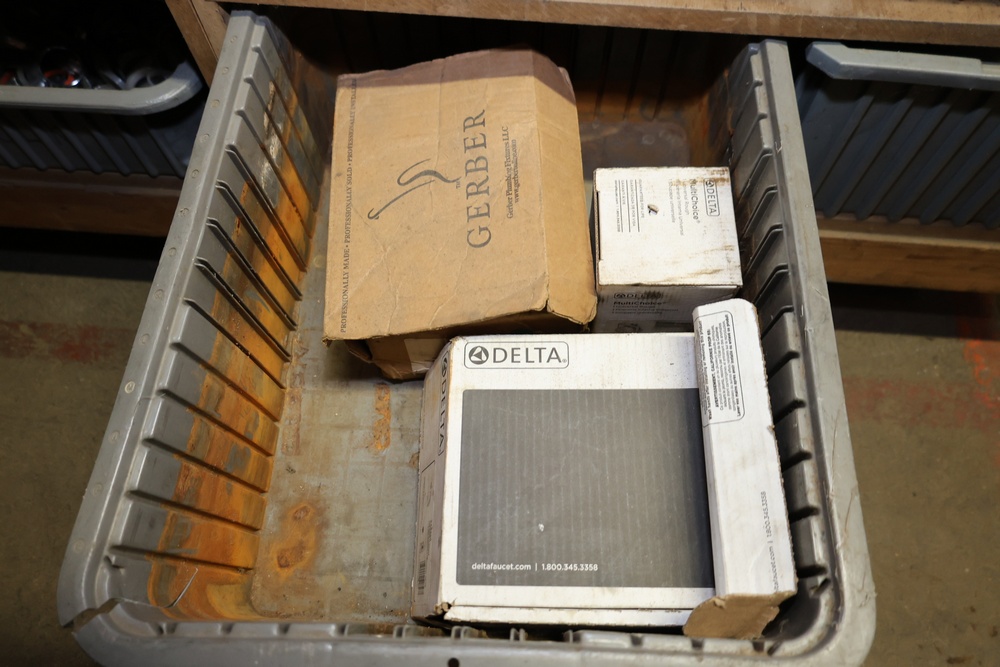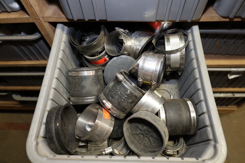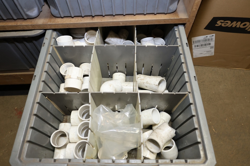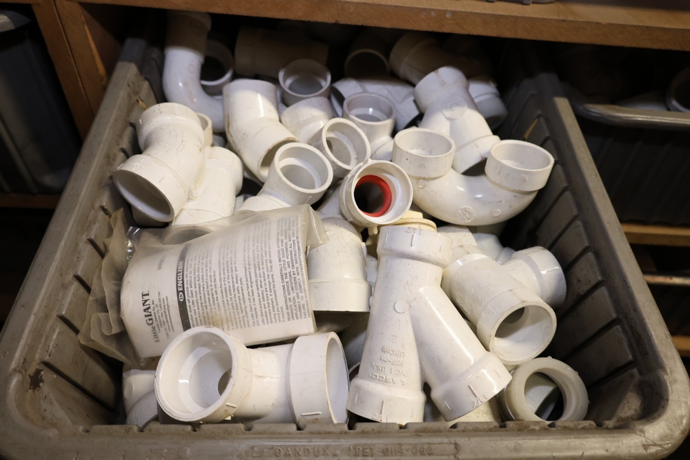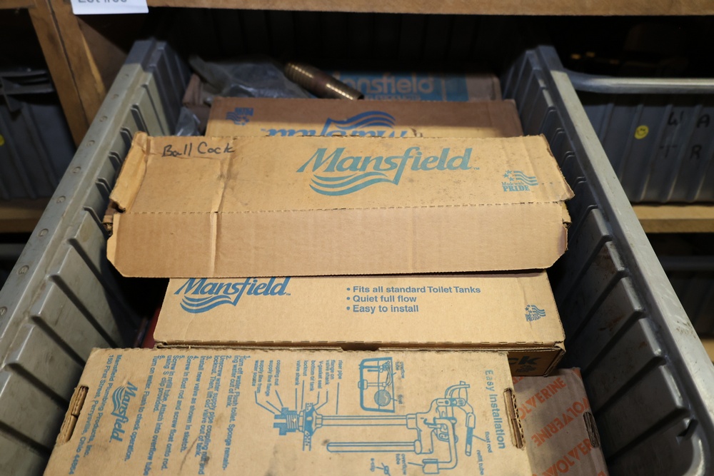 Storage Unit with Plumbing Supplies and Components. Includes large quantities of assorted plumbing materials, fittings, PVC pipe connectors, metal couplers, boxed components, and other hardware stored in gray bins on shelving. Buyer must take all.