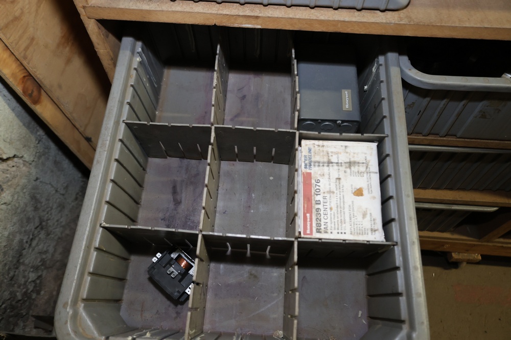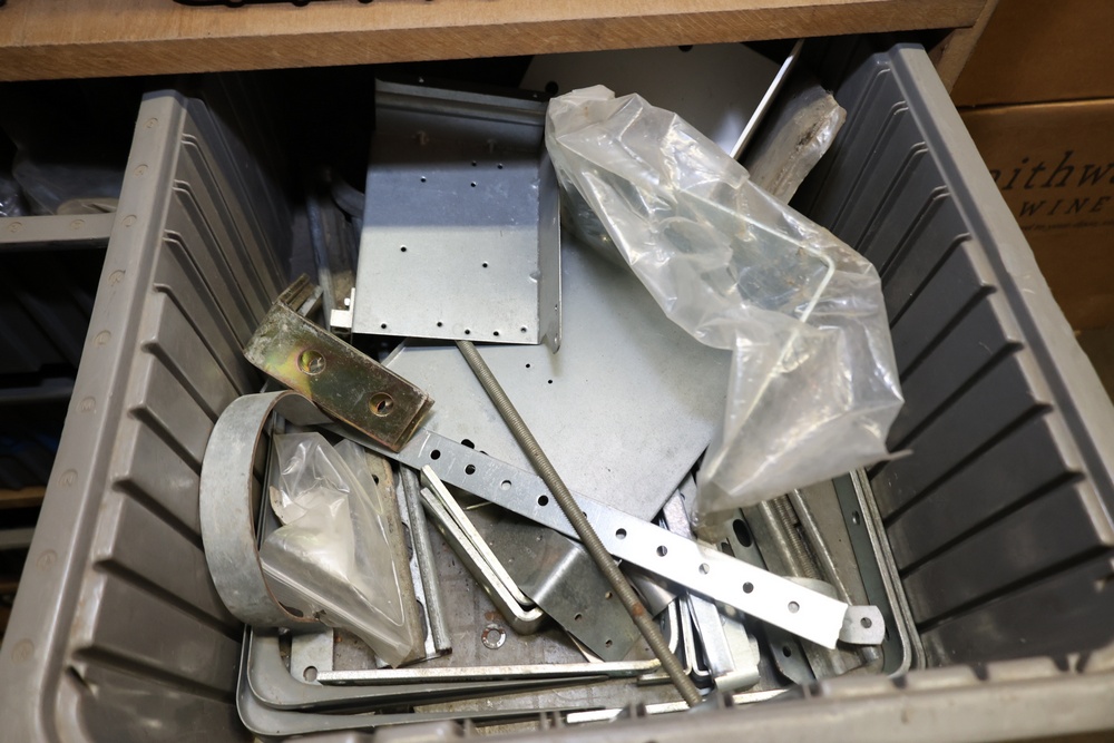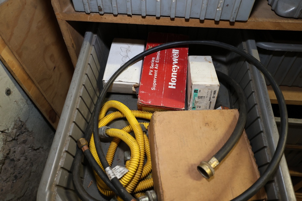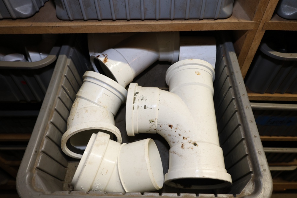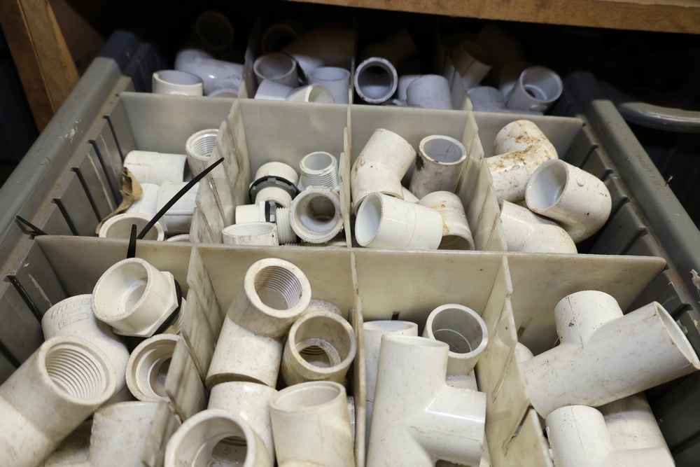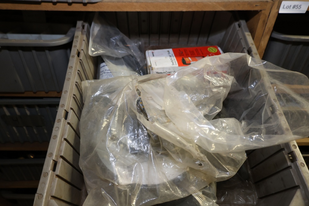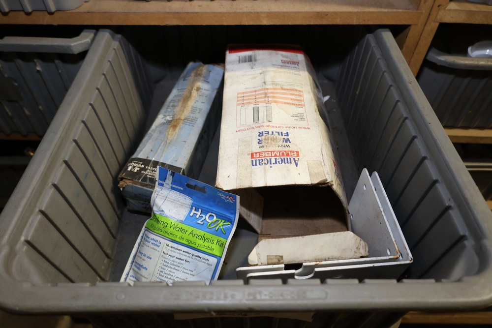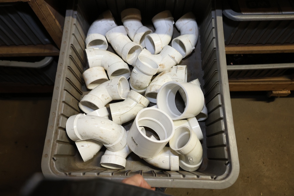 Storage Unit with Plumbing Supplies and Components. Includes large quantities of assorted plumbing materials, fittings, PVC pipe connectors, metal couplers, boxed components, and other hardware stored in gray bins on shelving. Buyer must take all.