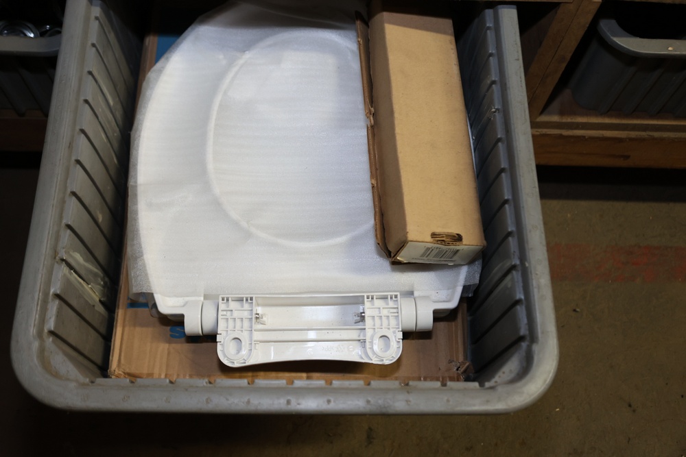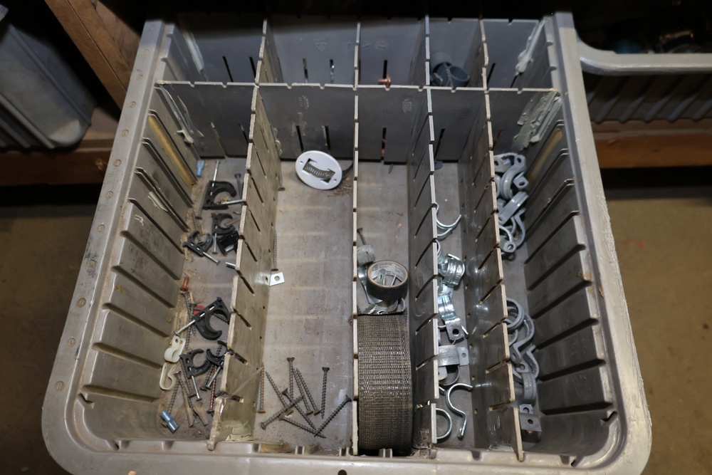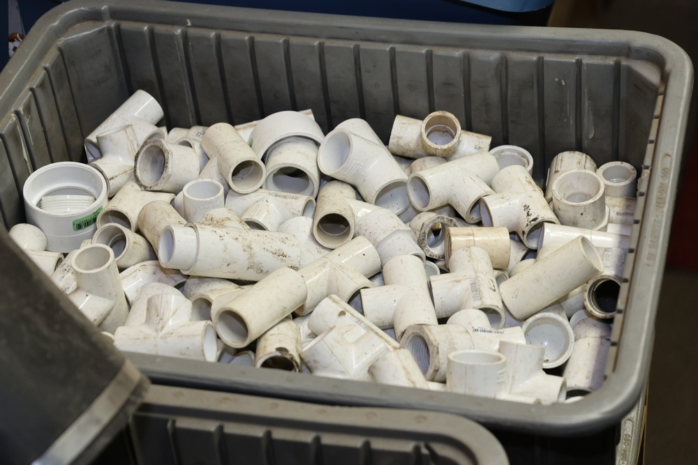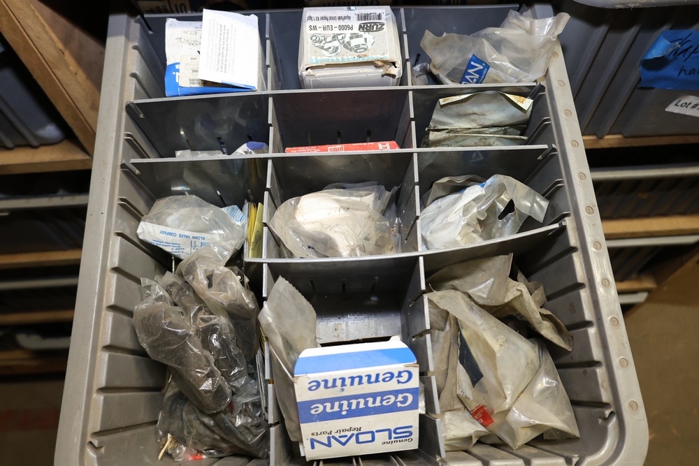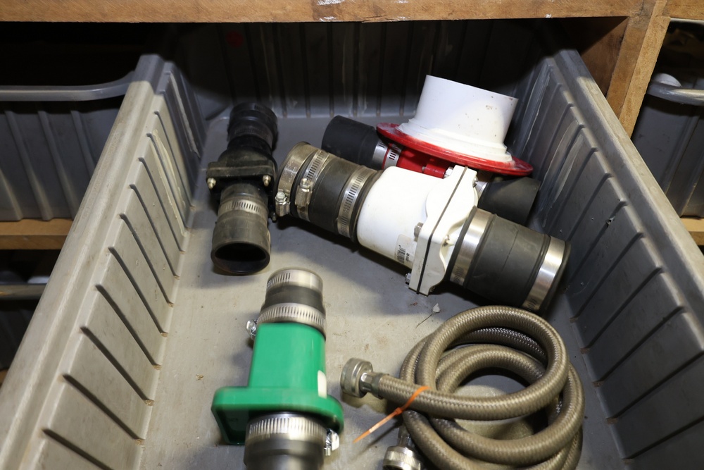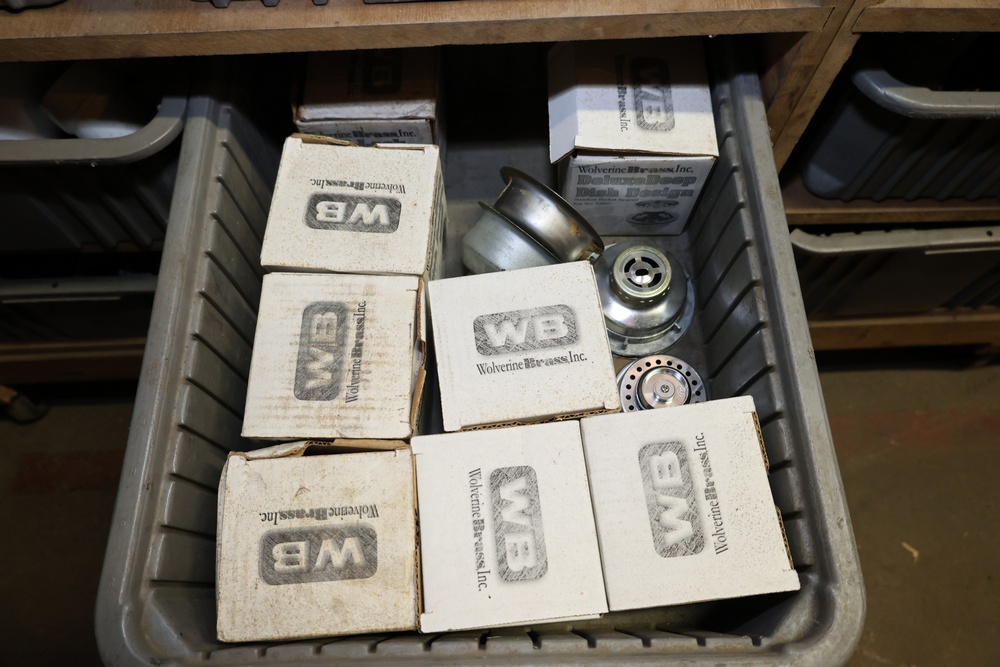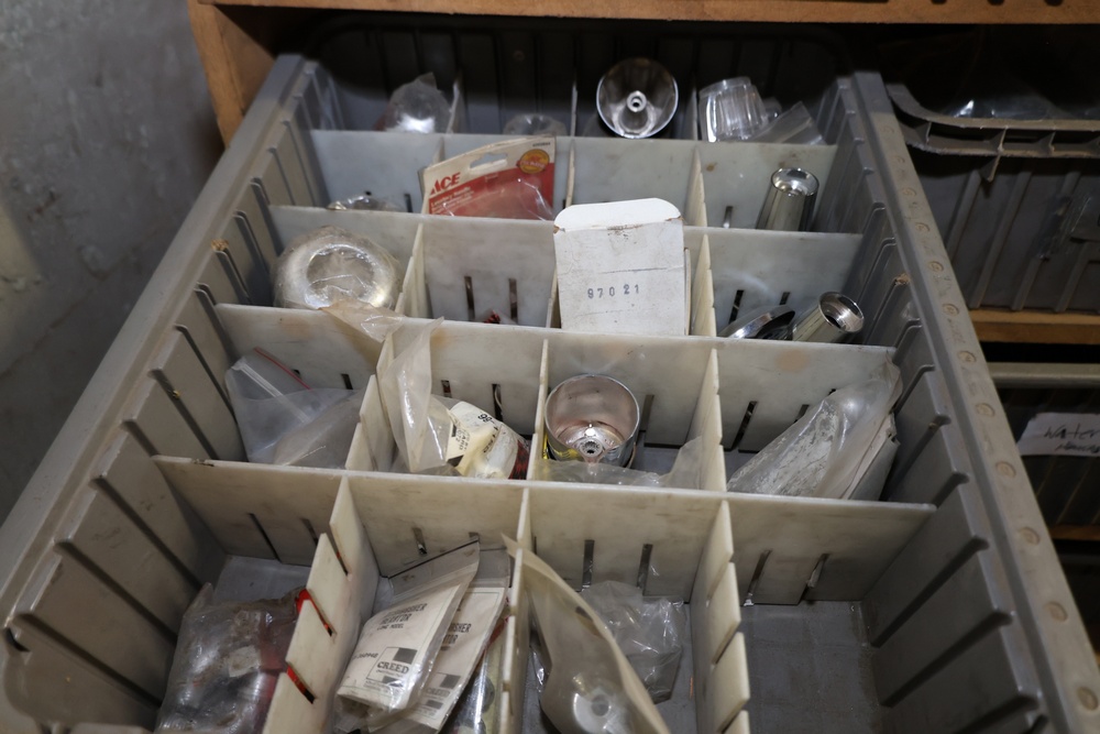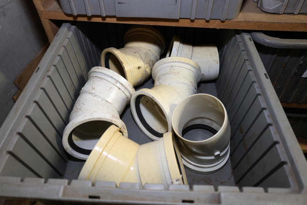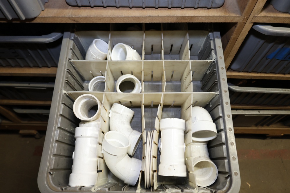 Storage Unit with Plumbing Supplies and Components. Includes large quantities of assorted plumbing materials, fittings, PVC pipe connectors, metal couplers, boxed components, and other hardware stored in gray bins on shelving. Buyer must take all.