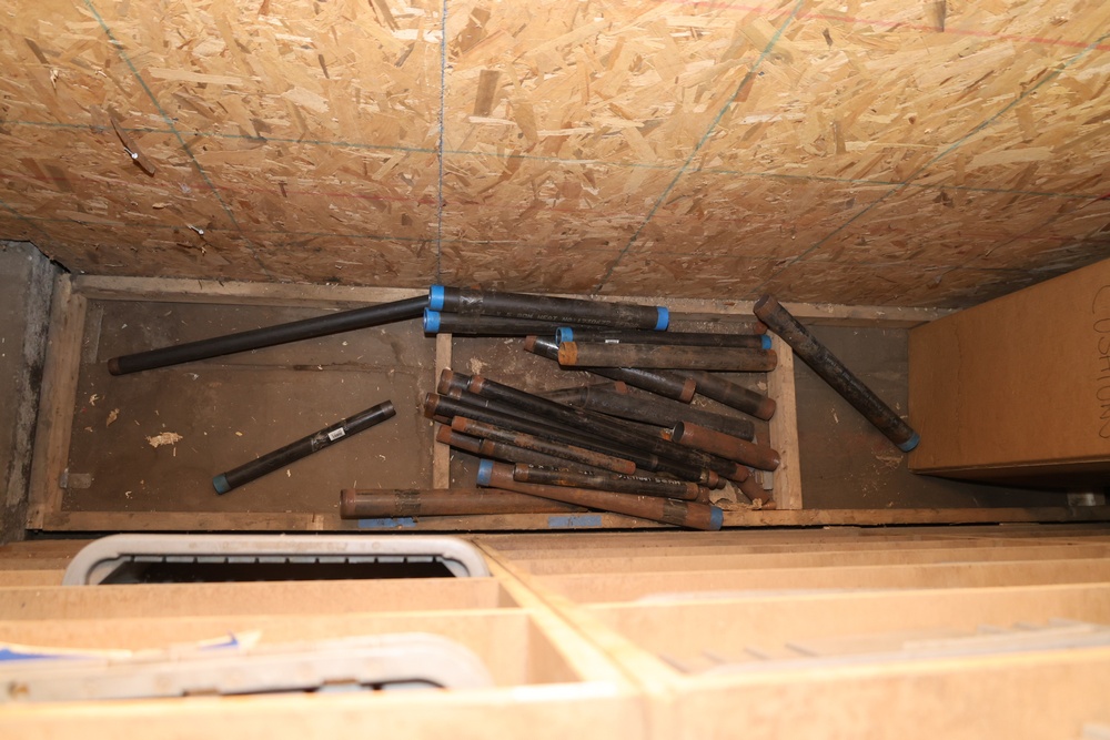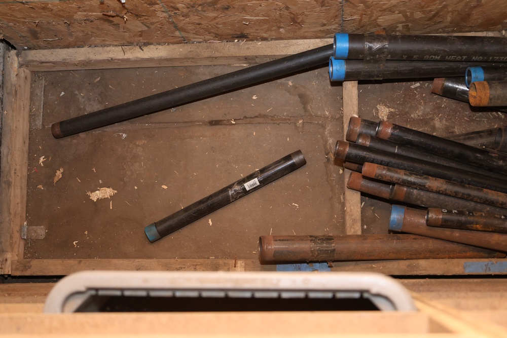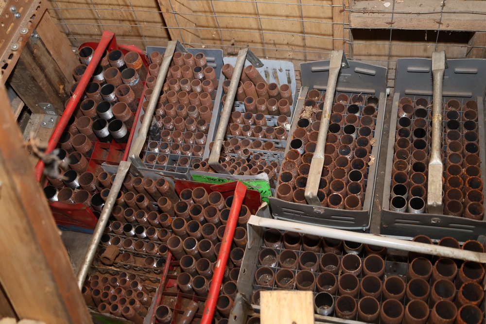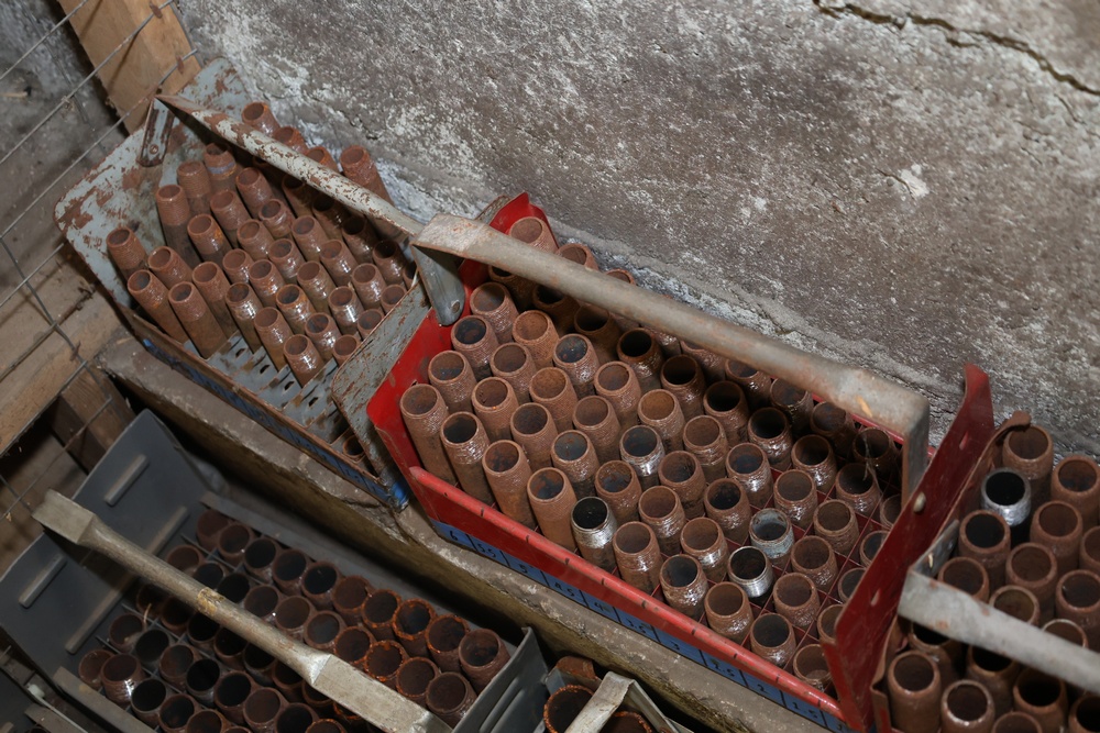 Metal Tubes and Pipes in Storage Racks. Includes multiple racks filled with cylindrical metal tubes in various diameters and lengths, alongside additional loose pipes. Some surfaces display signs of rust. Tools and other support materials are included. Buyer must take all.