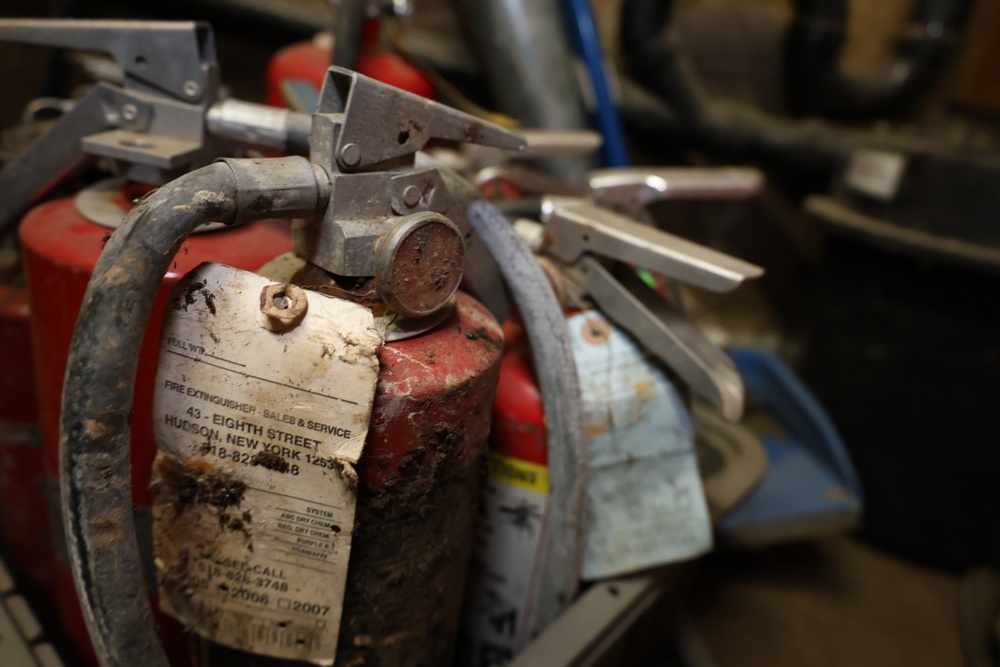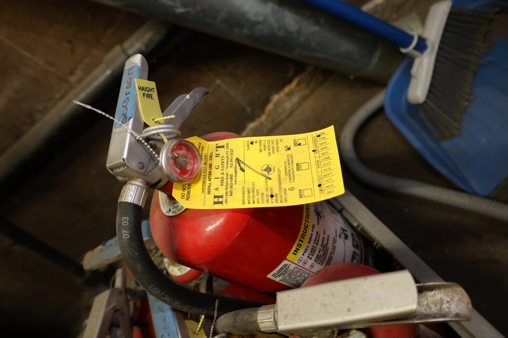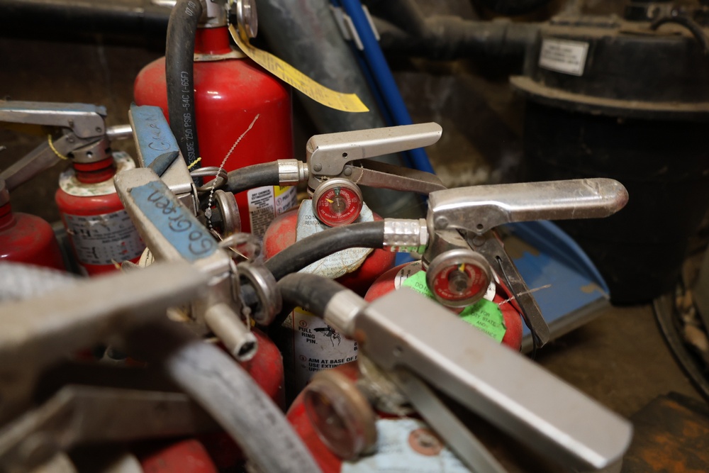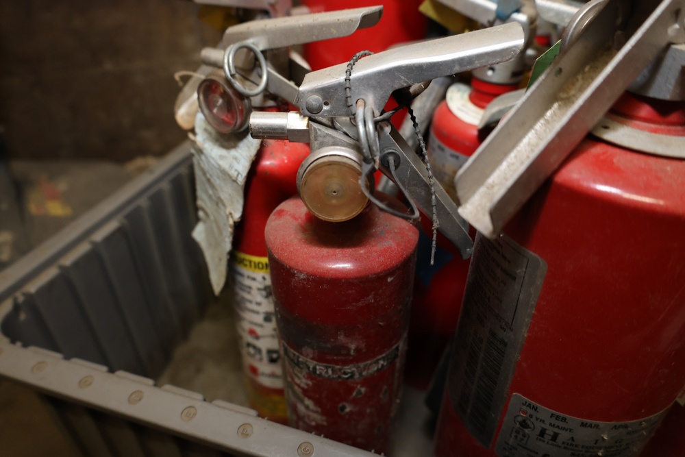 Red fire extinguishers in a plastic storage bin. Includes units with hoses, tags, and metal handles. Conditions vary, with some showing visible wear and labels intact. Items have not been tested for function.