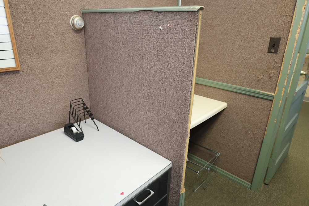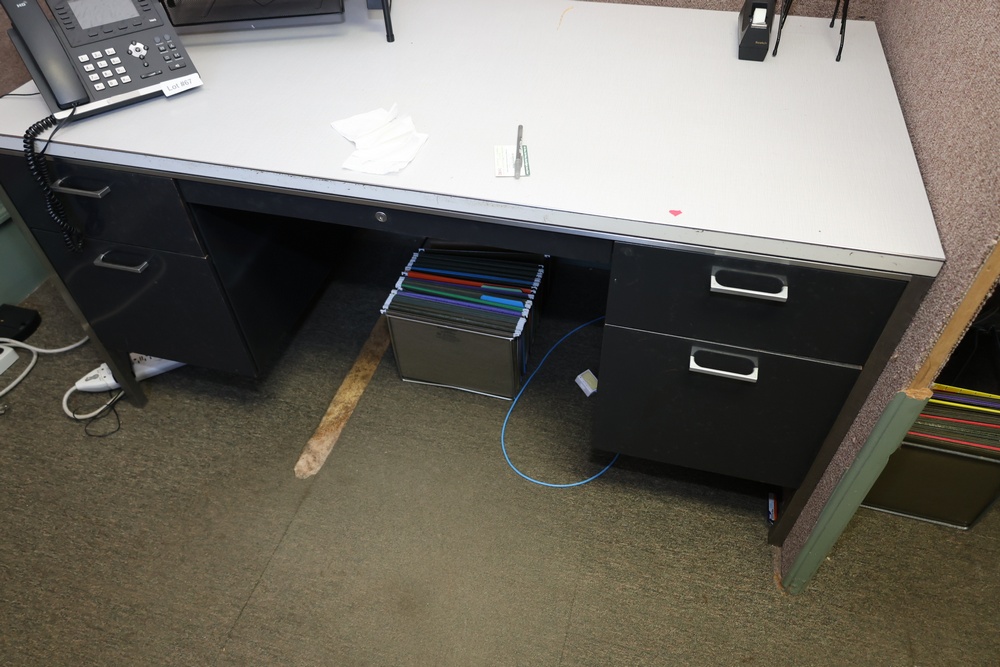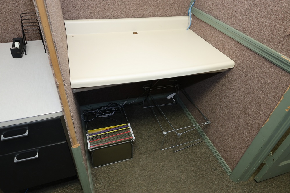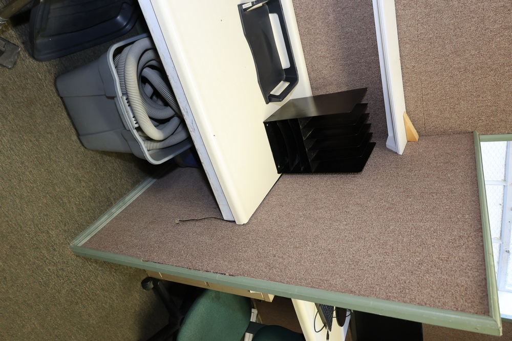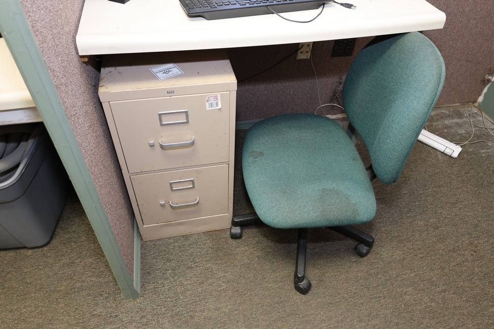 Office Furniture Set with Desks, Chairs, Shelves, and Storage Units. Includes desks, file cabinets, a whiteboard, shelves, chairs, and storage cabinets. Items show some wear consistent with use. Pickup only. Excludes other lots. Buyer must take all.