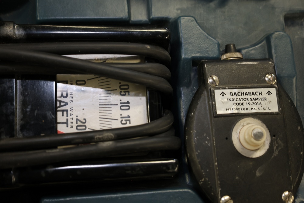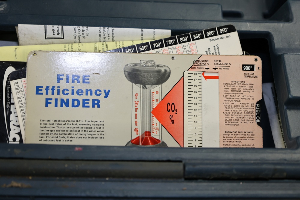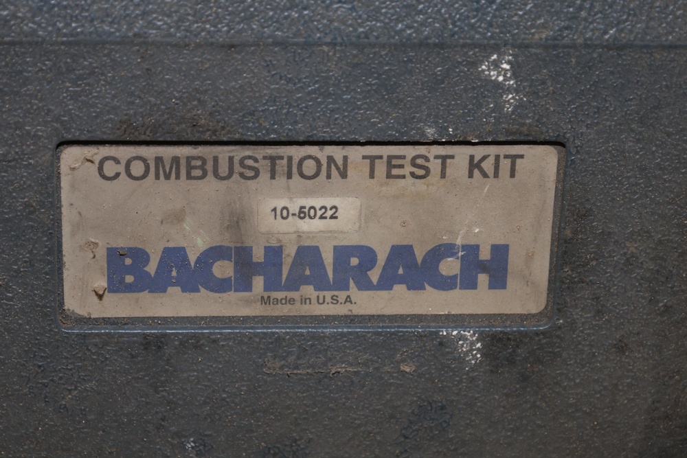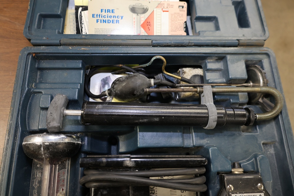 Bacharach Combustion Test Kit with case and accessories, including indicator sampler, hoses, gauge, Fire Efficiency Finder, and manuals. Stored in a hard-shell case for protection and organization.