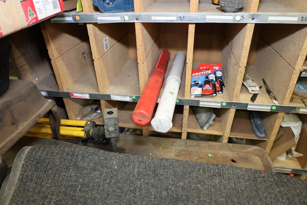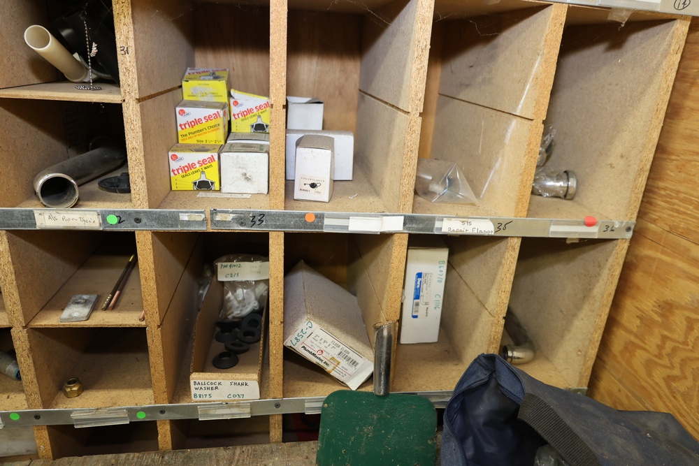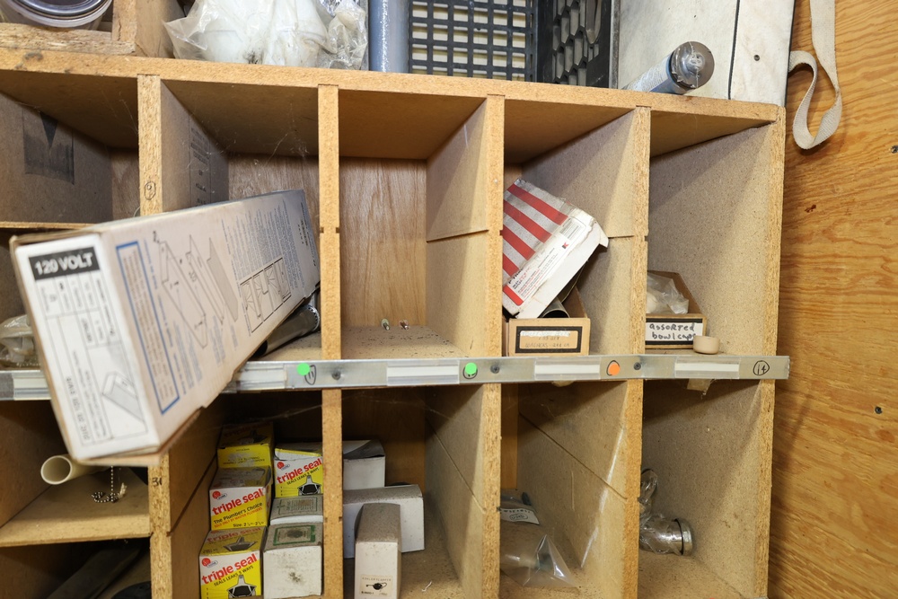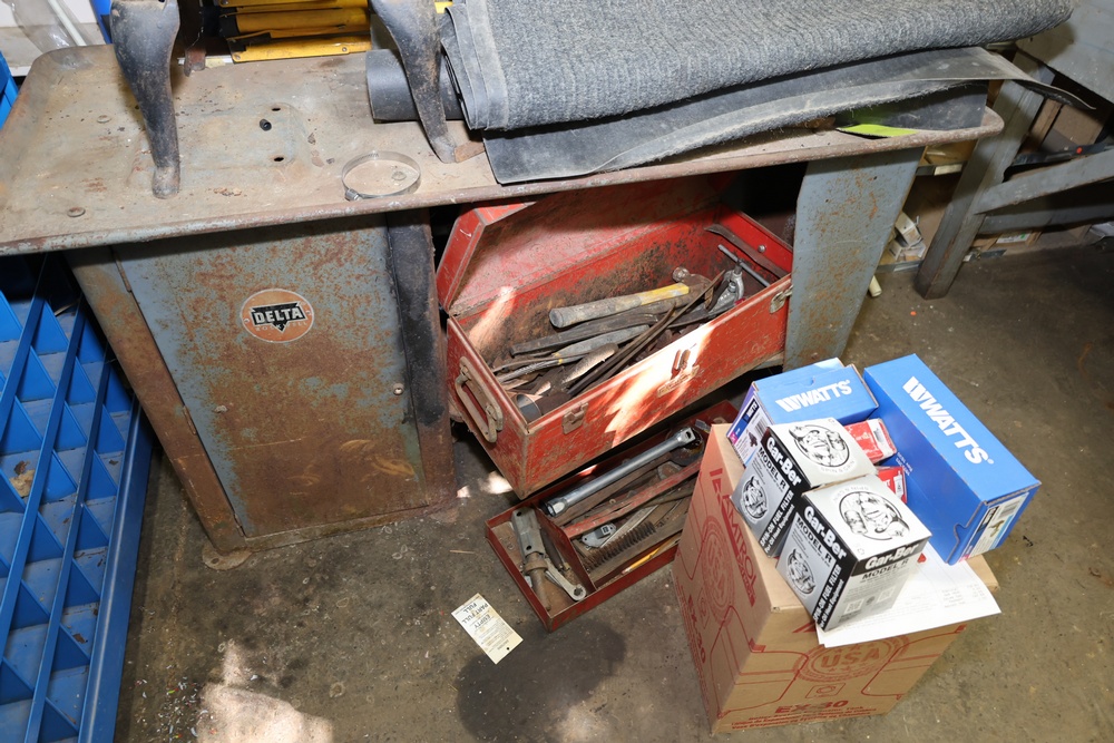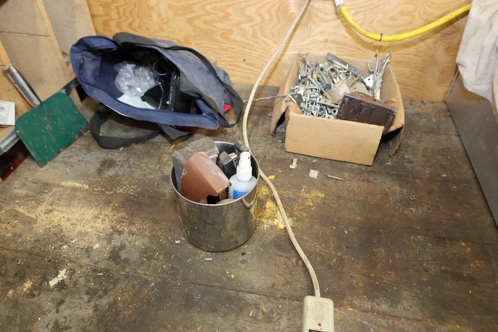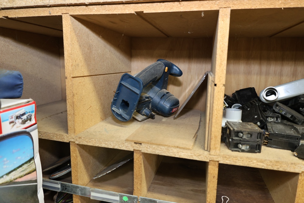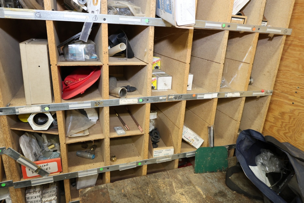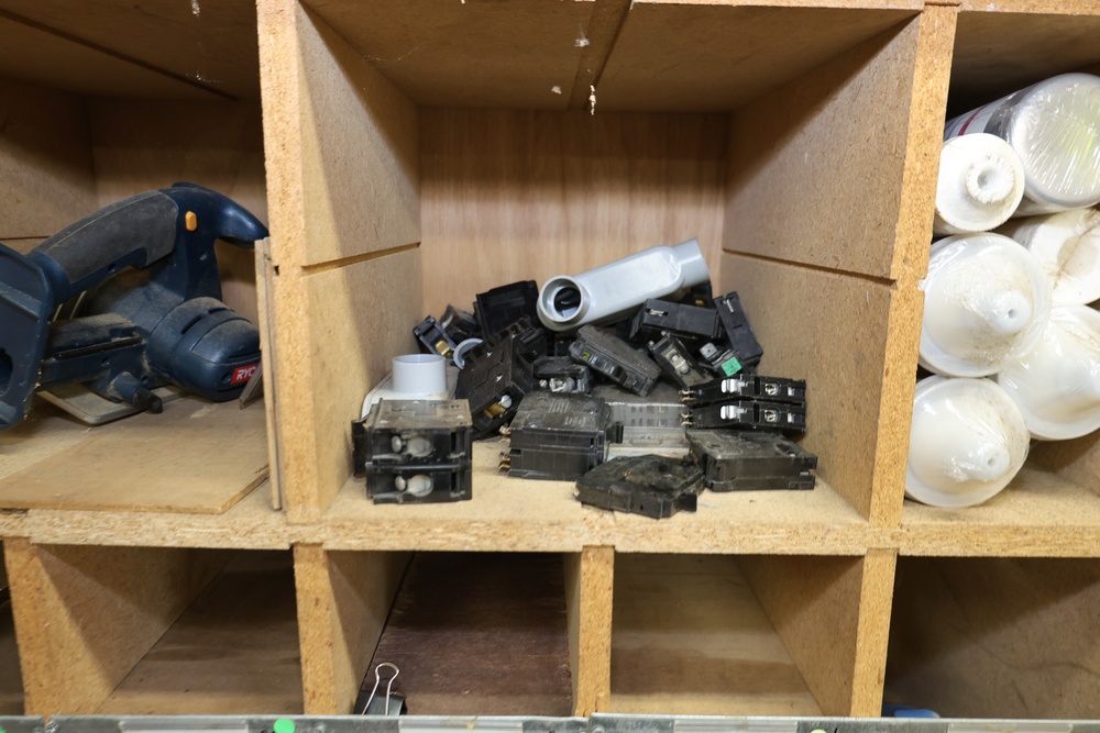 Tools and Accessories. Includes hardware, tools, and workshop accessories. Items include a Ryobi tool, ClearView side mirror box, Watts plumbing components, wiring, and other small materials. Metal drawers and toolboxes are also visible, housing tools and workshop equipment. Buyer must take all.