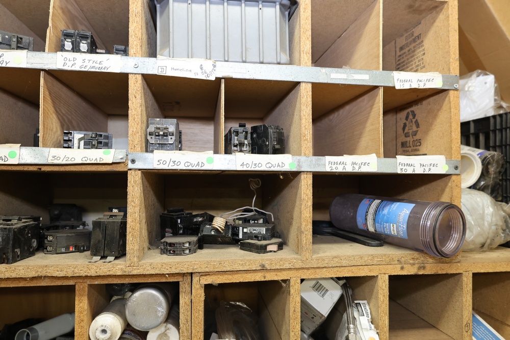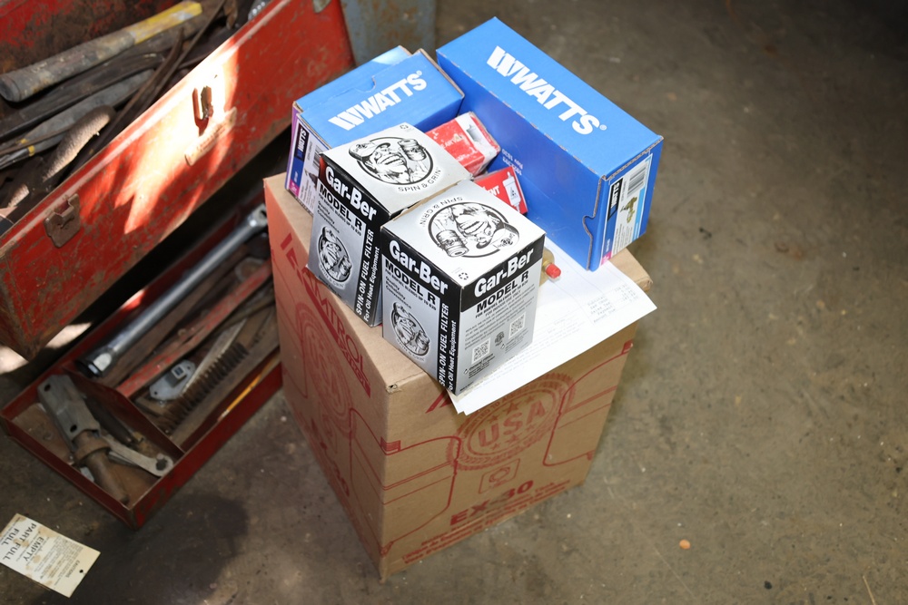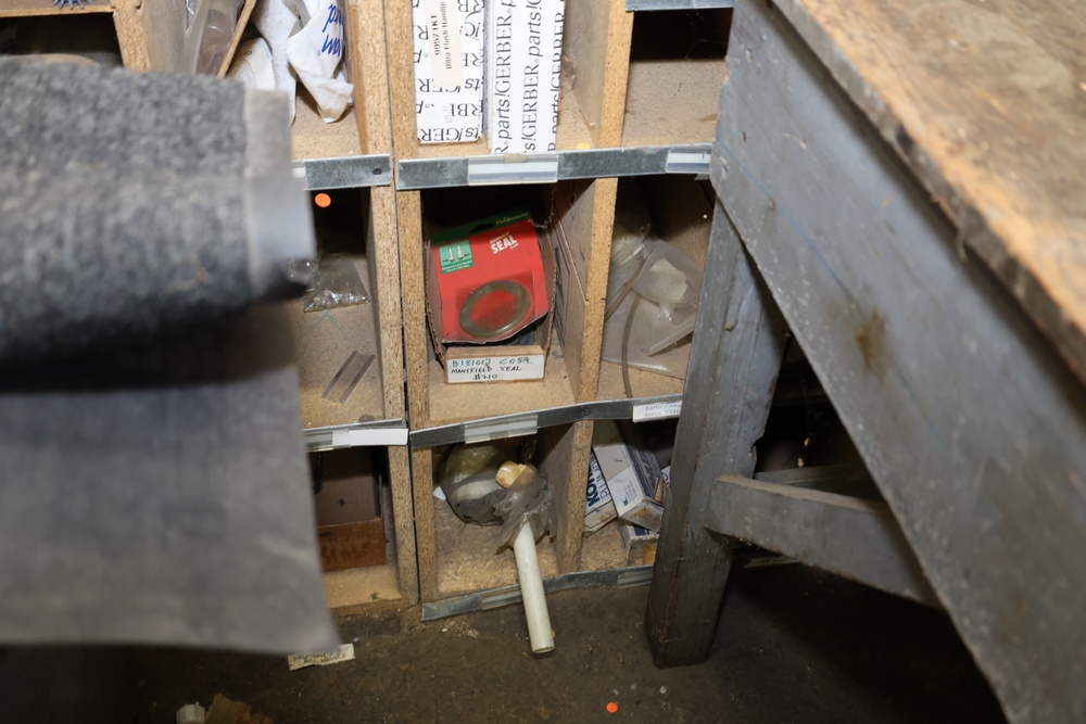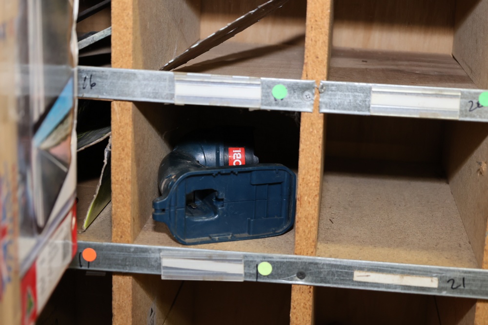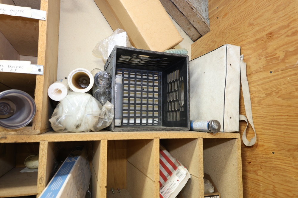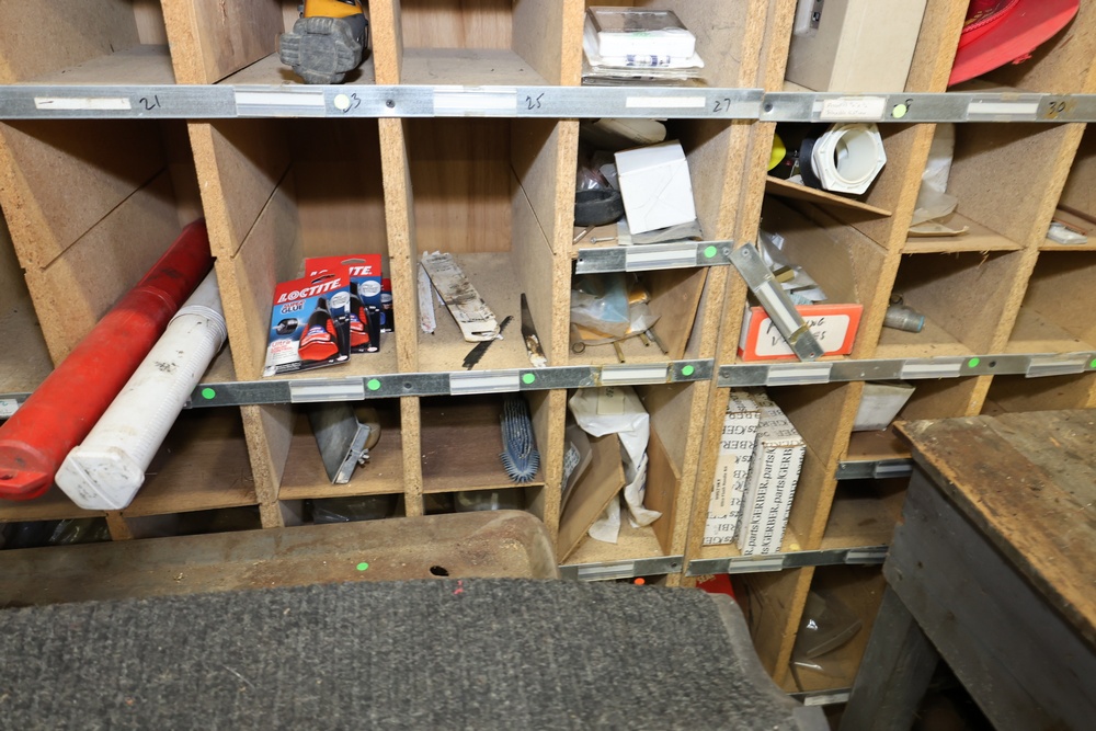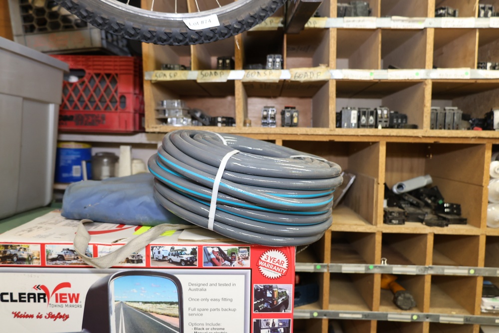 Tools and Accessories. Includes hardware, tools, and workshop accessories. Items include a Ryobi tool, ClearView side mirror box, Watts plumbing components, wiring, and other small materials. Metal drawers and toolboxes are also visible, housing tools and workshop equipment. Buyer must take all.