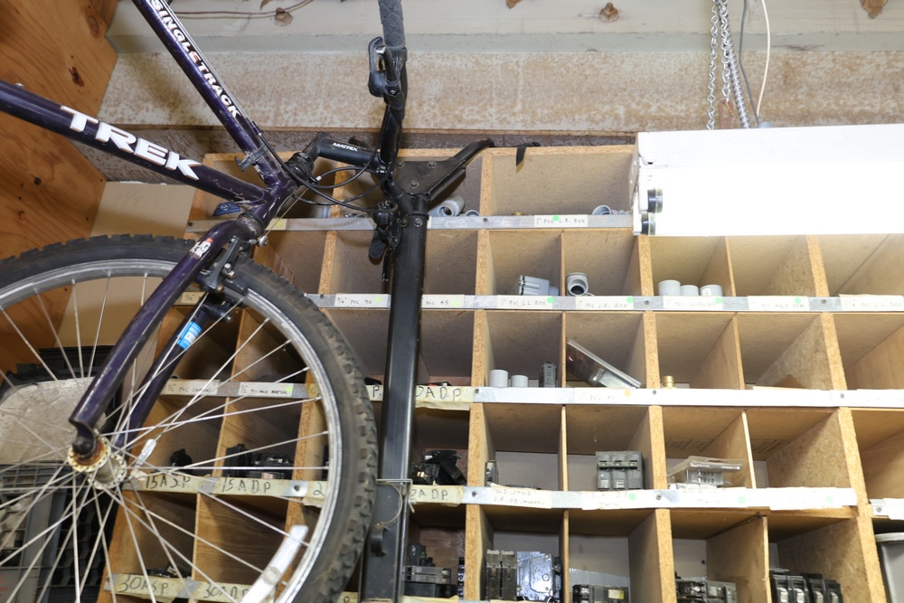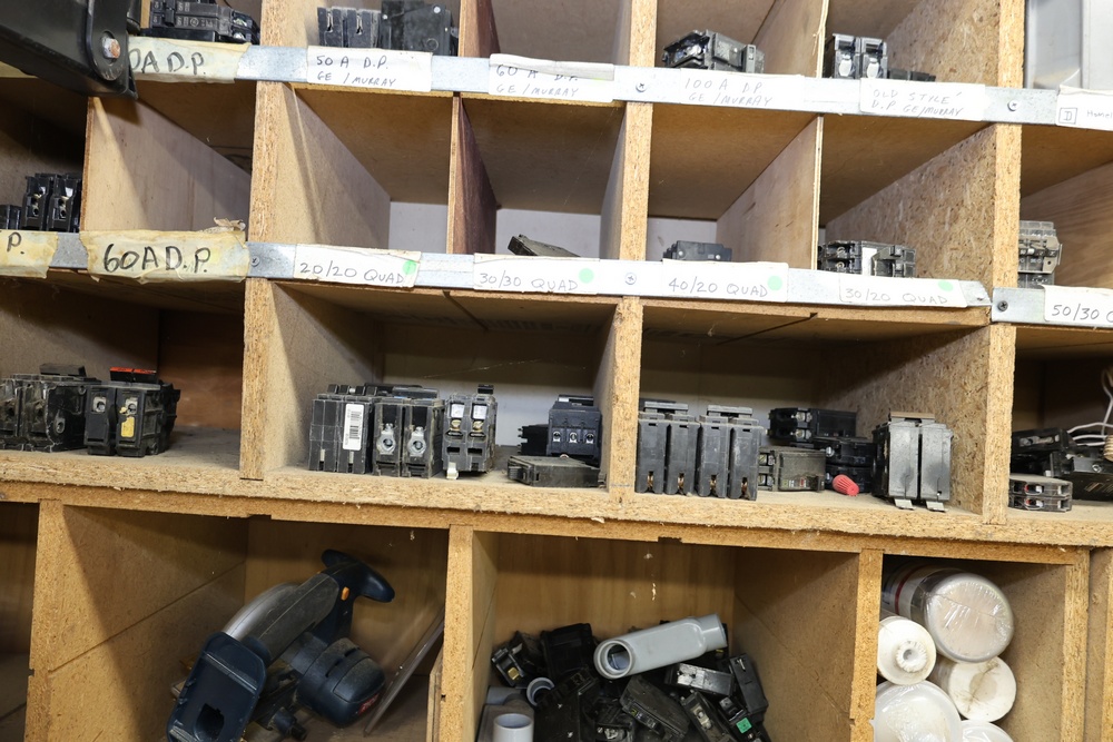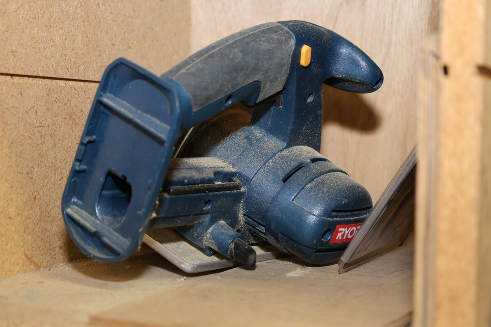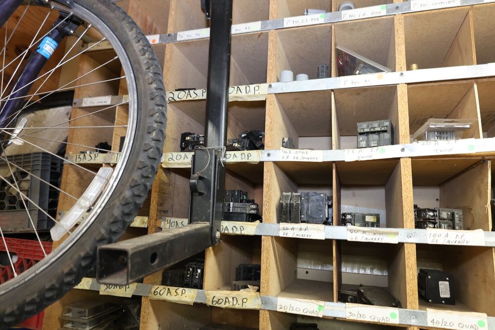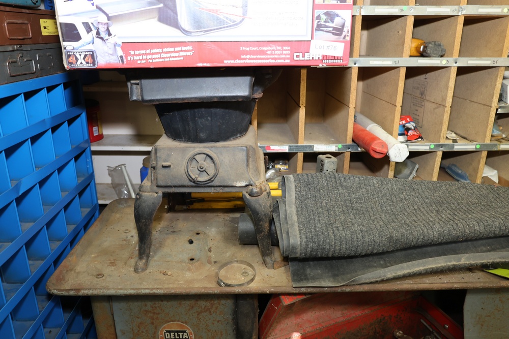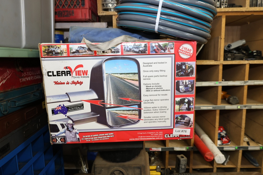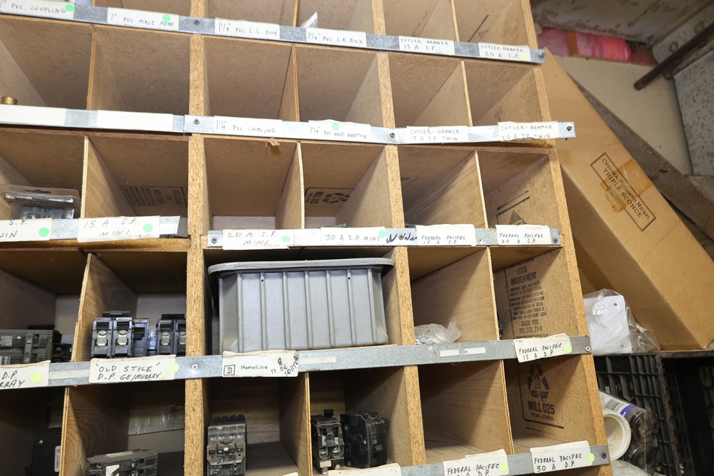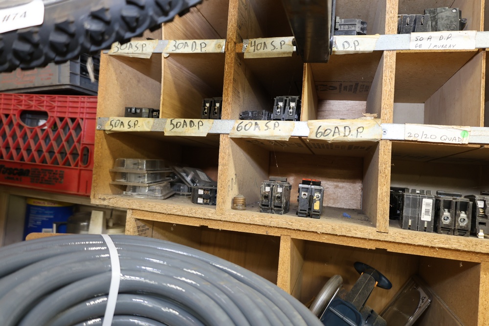 Tools and Accessories. Includes hardware, tools, and workshop accessories. Items include a Ryobi tool, ClearView side mirror box, Watts plumbing components, wiring, and other small materials. Metal drawers and toolboxes are also visible, housing tools and workshop equipment. Buyer must take all.