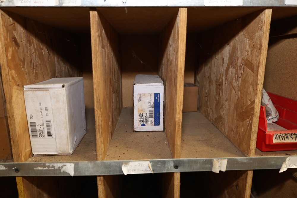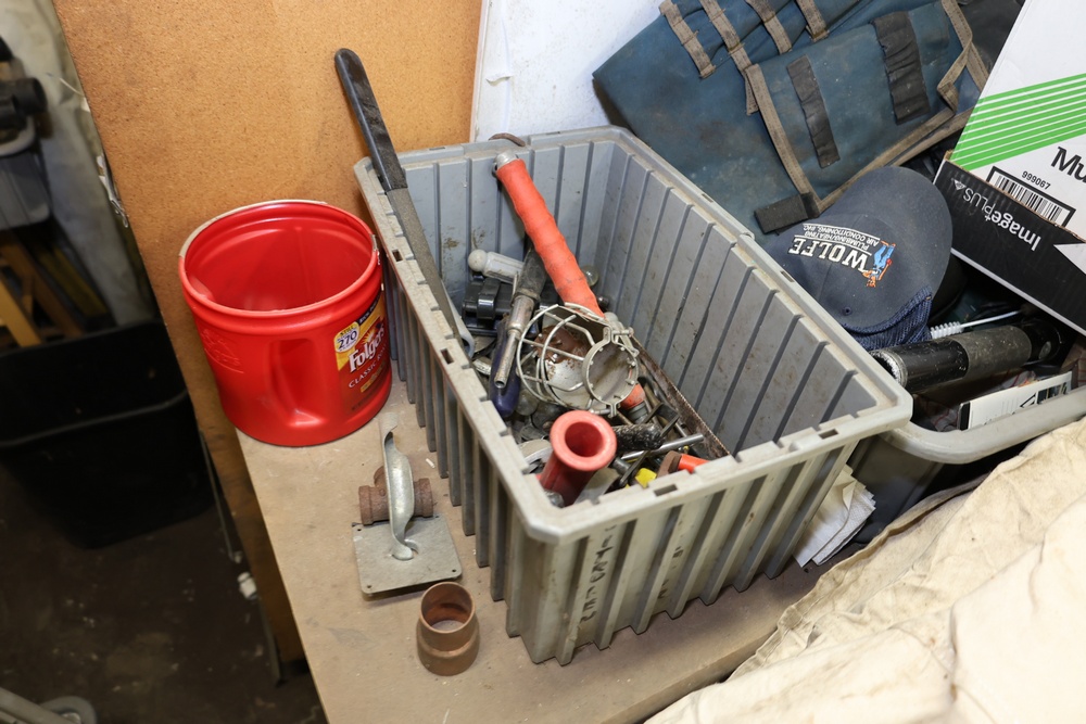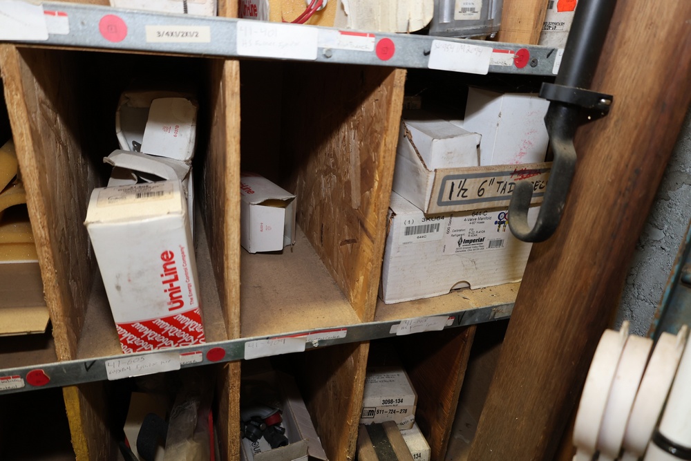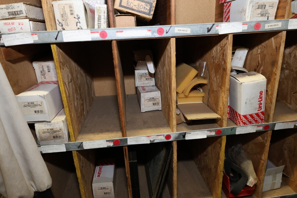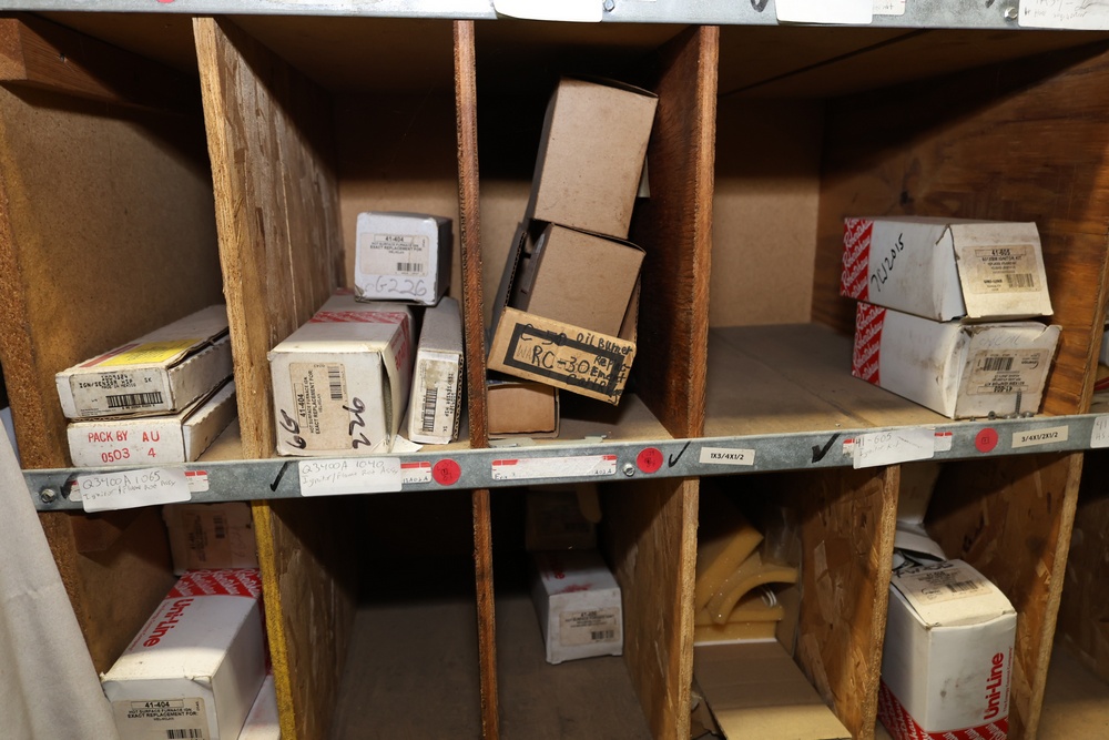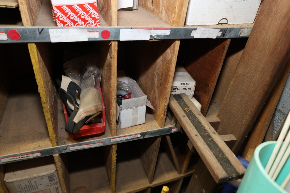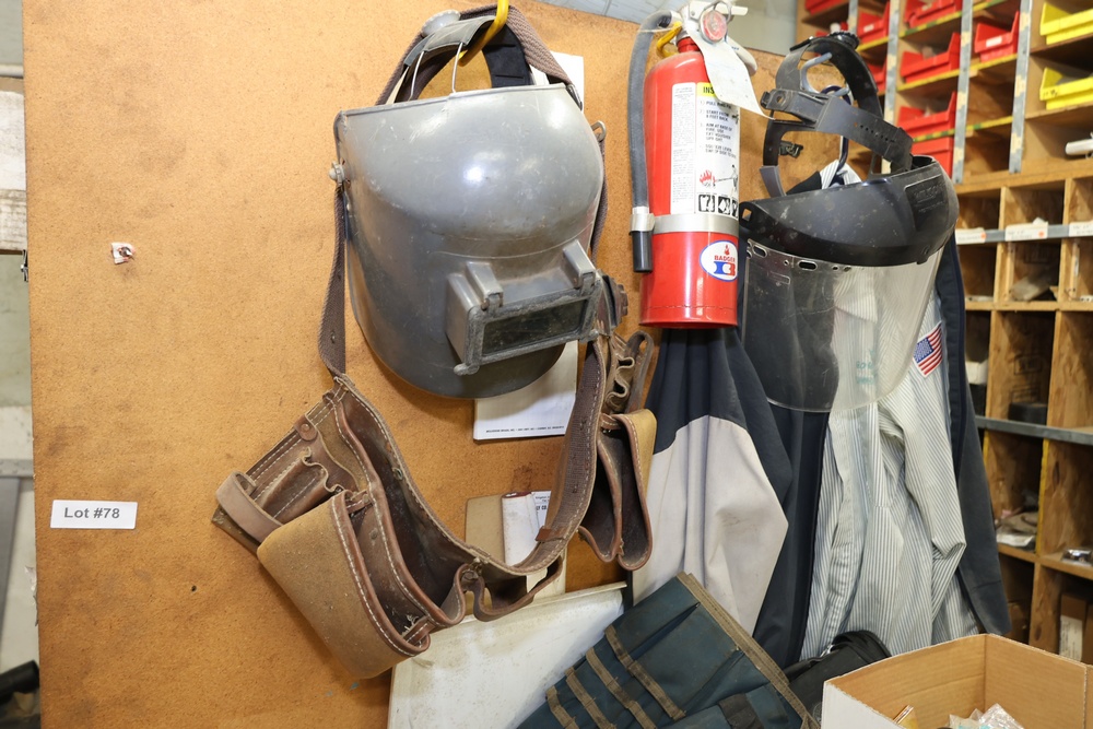 Industrial parts and supplies, bins with tools and components, protective headgear, belts, and miscellaneous equipment. Buyer must take all.