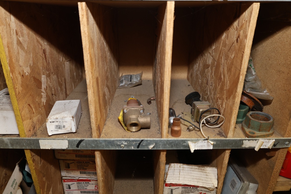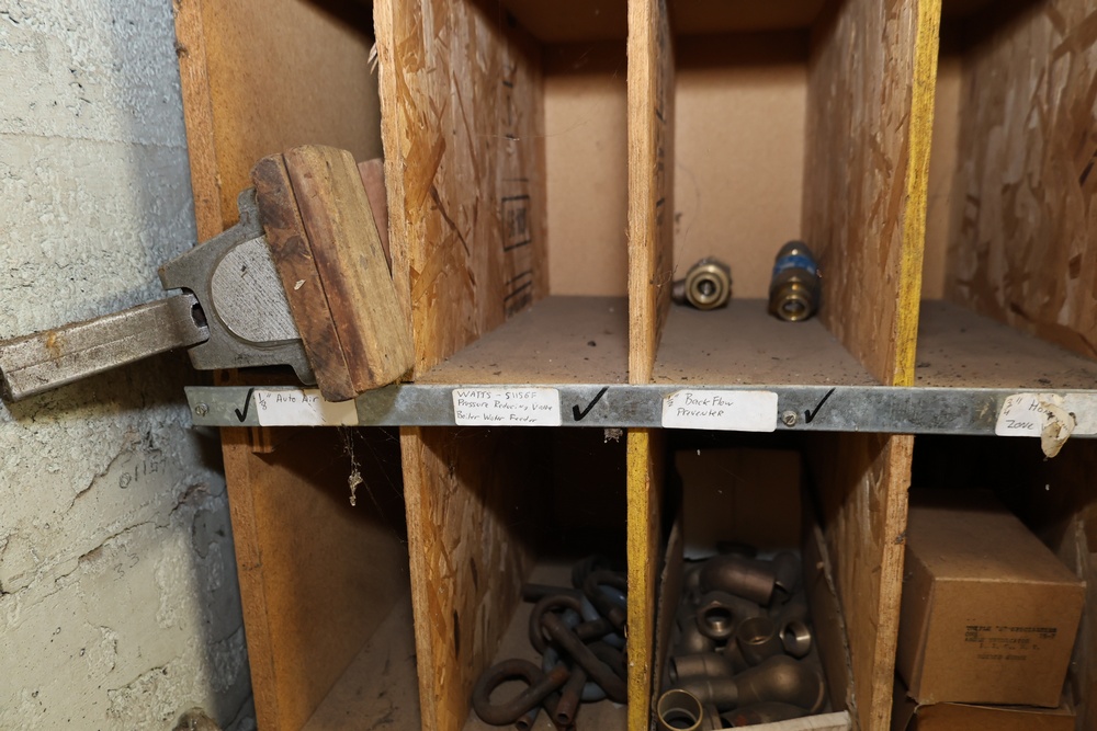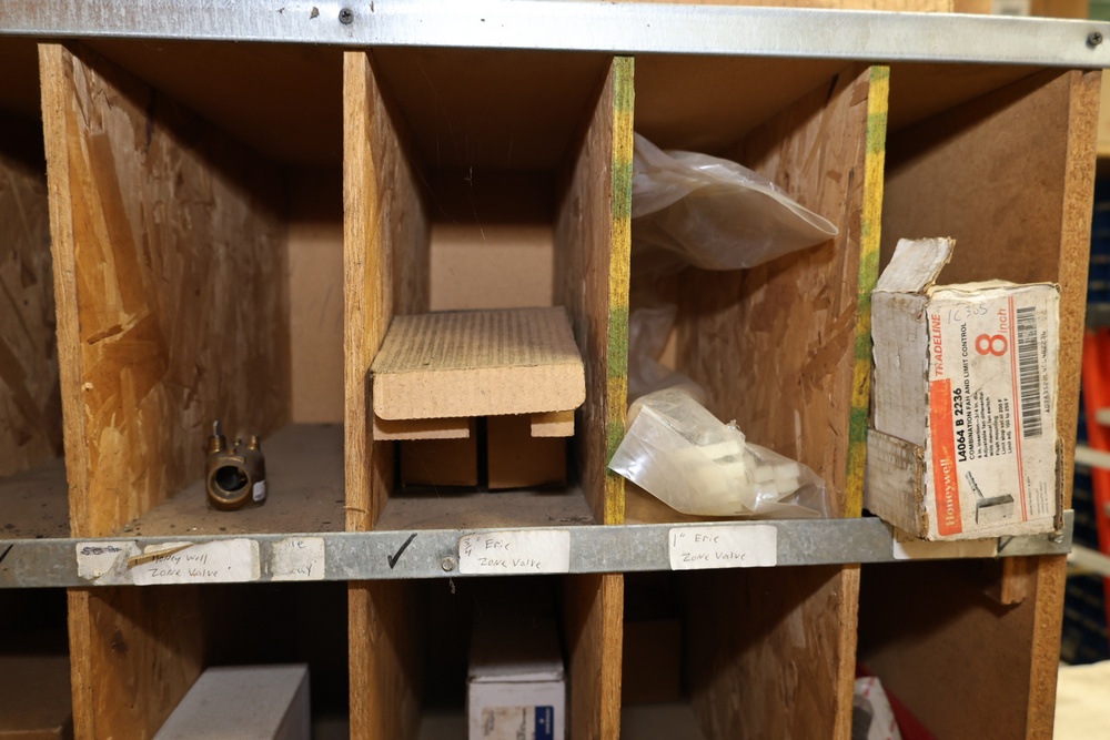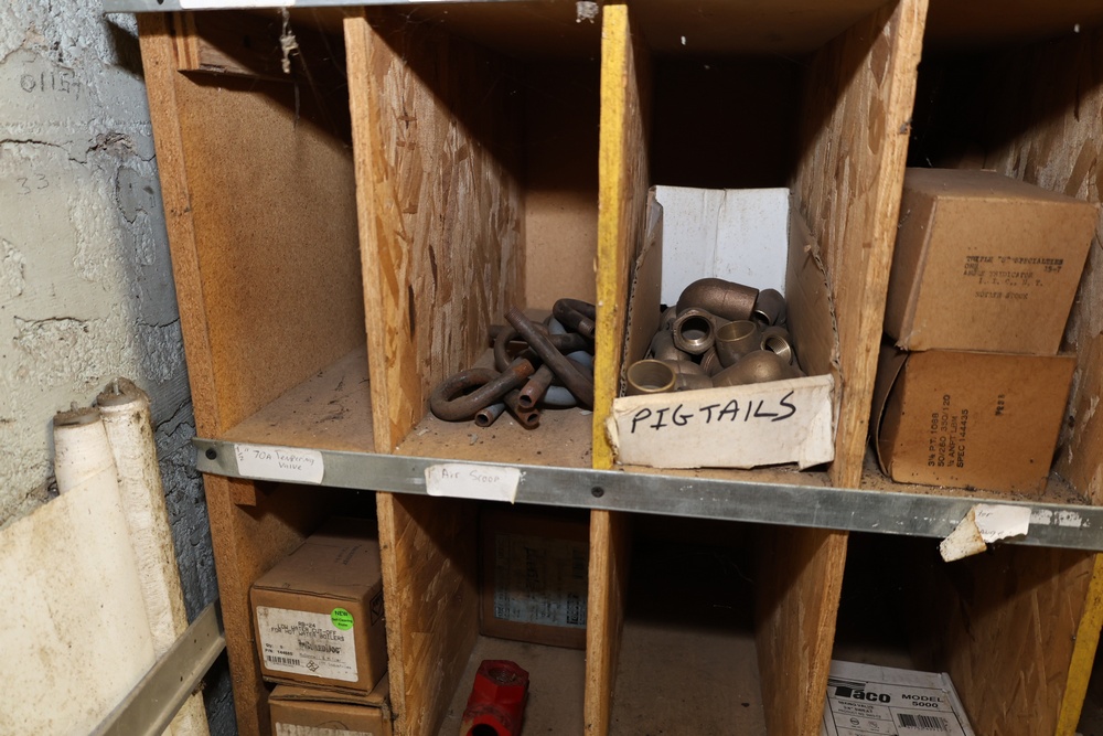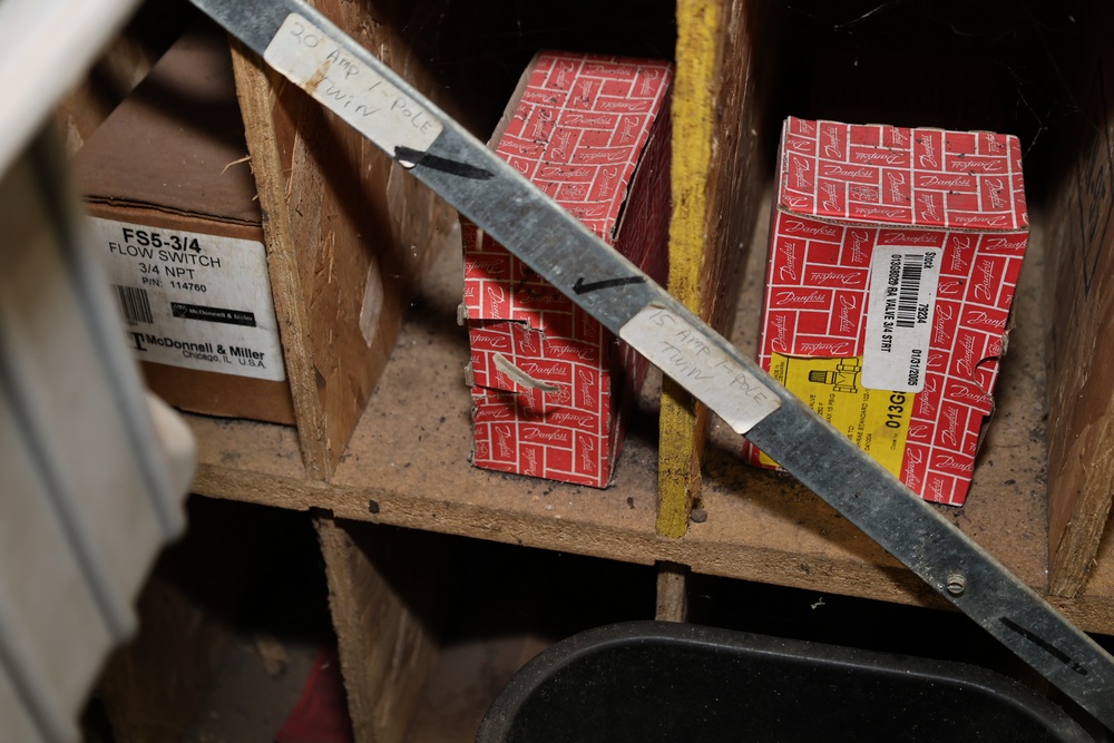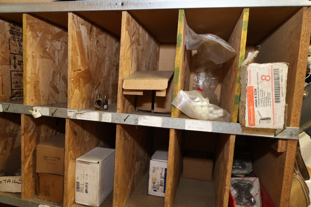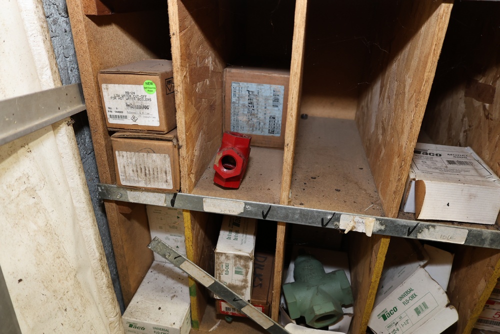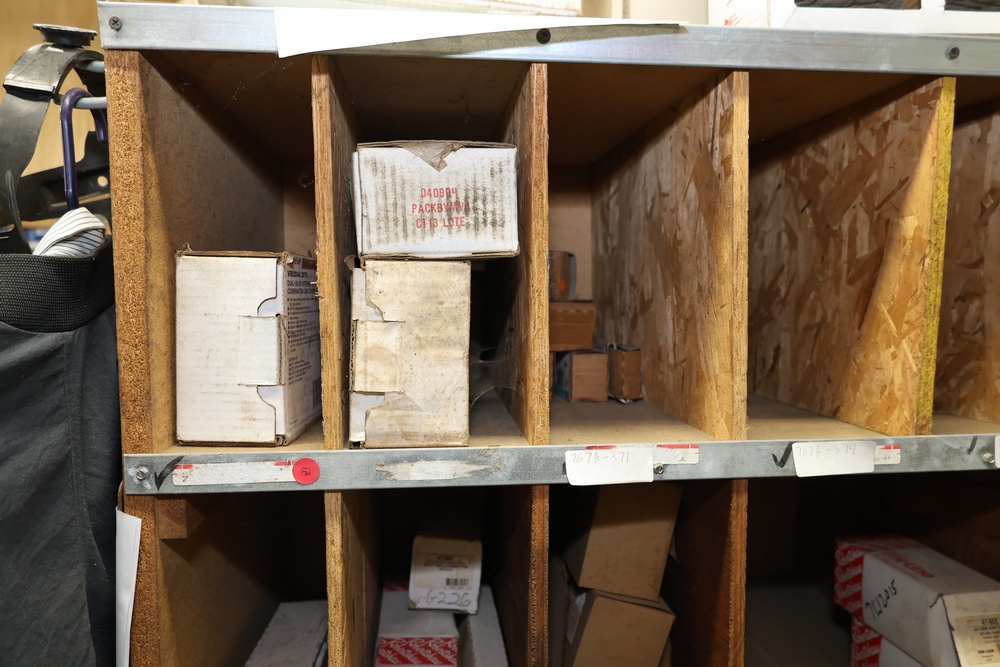 Industrial parts and supplies, bins with tools and components, protective headgear, belts, and miscellaneous equipment. Buyer must take all.