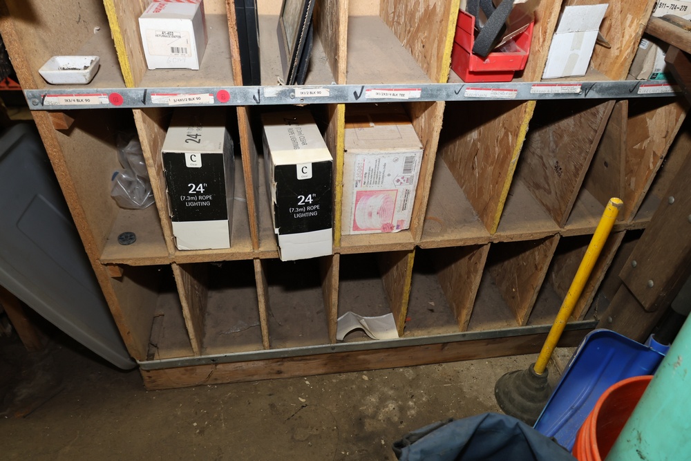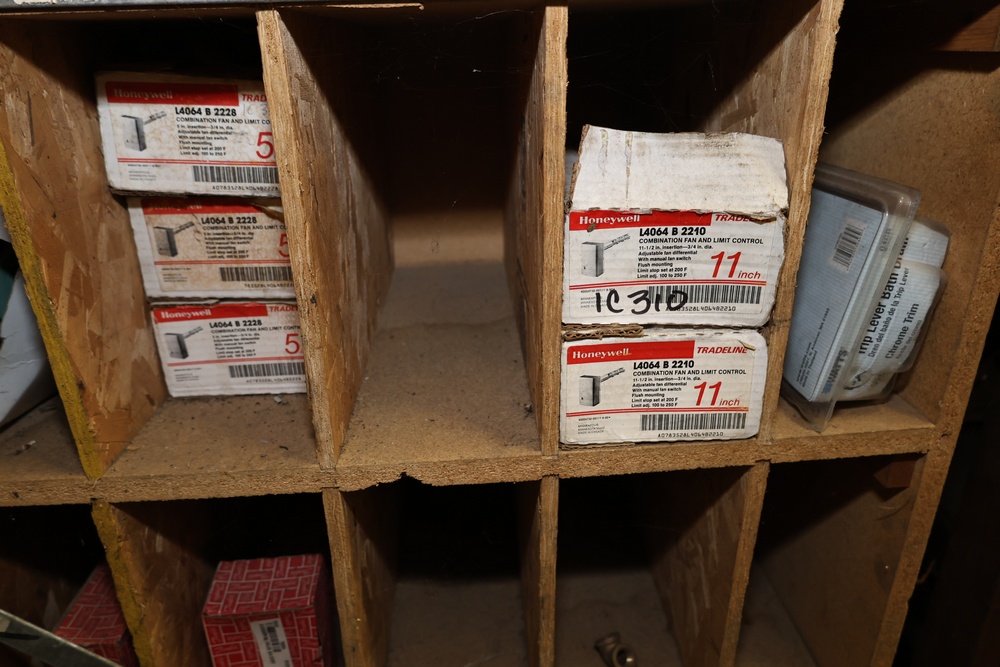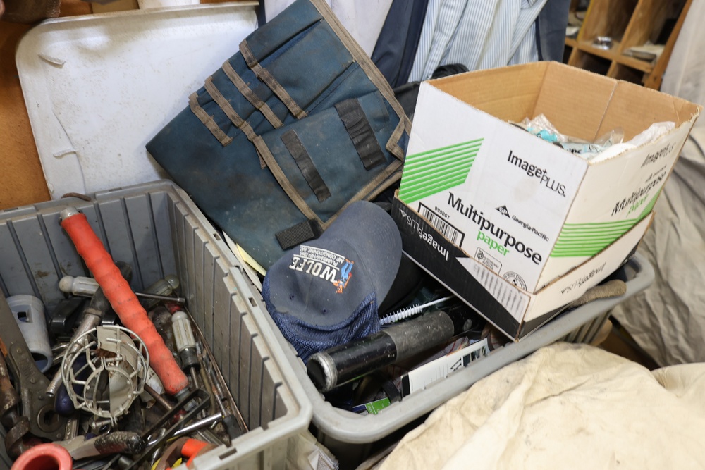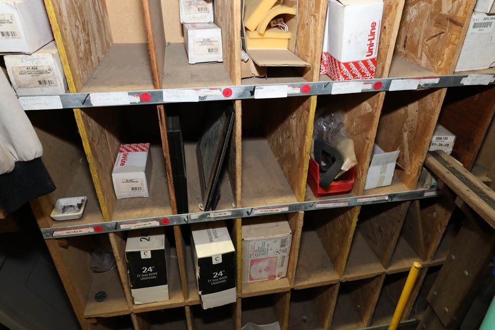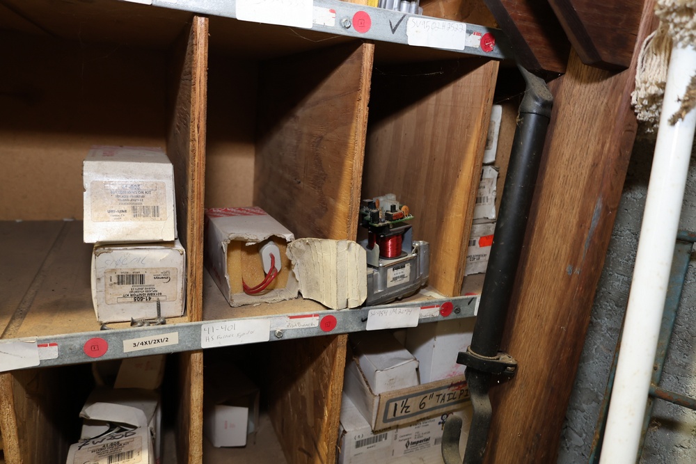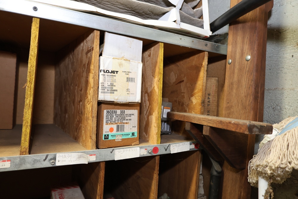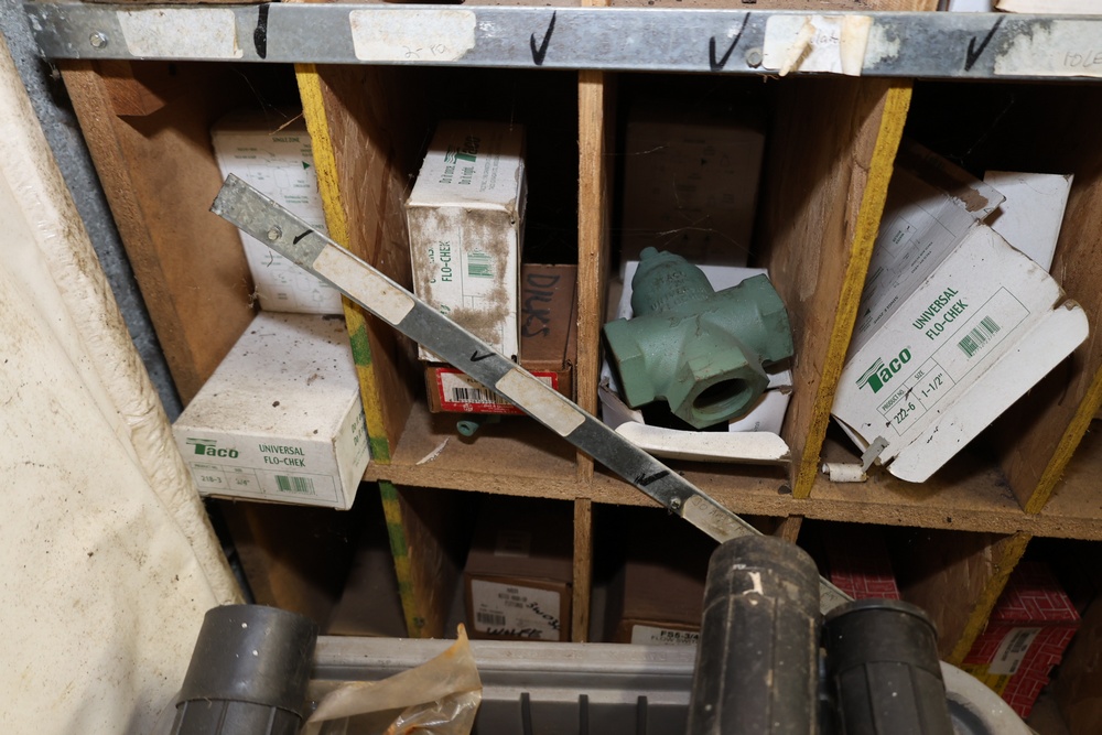 Industrial parts and supplies, bins with tools and components, protective headgear, belts, and miscellaneous equipment. Buyer must take all.