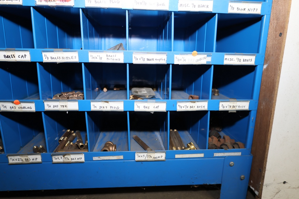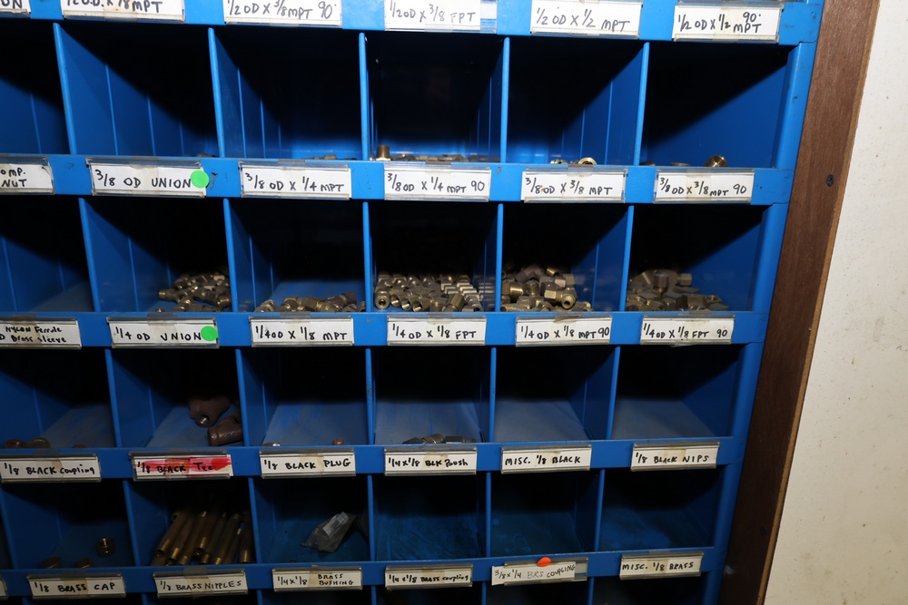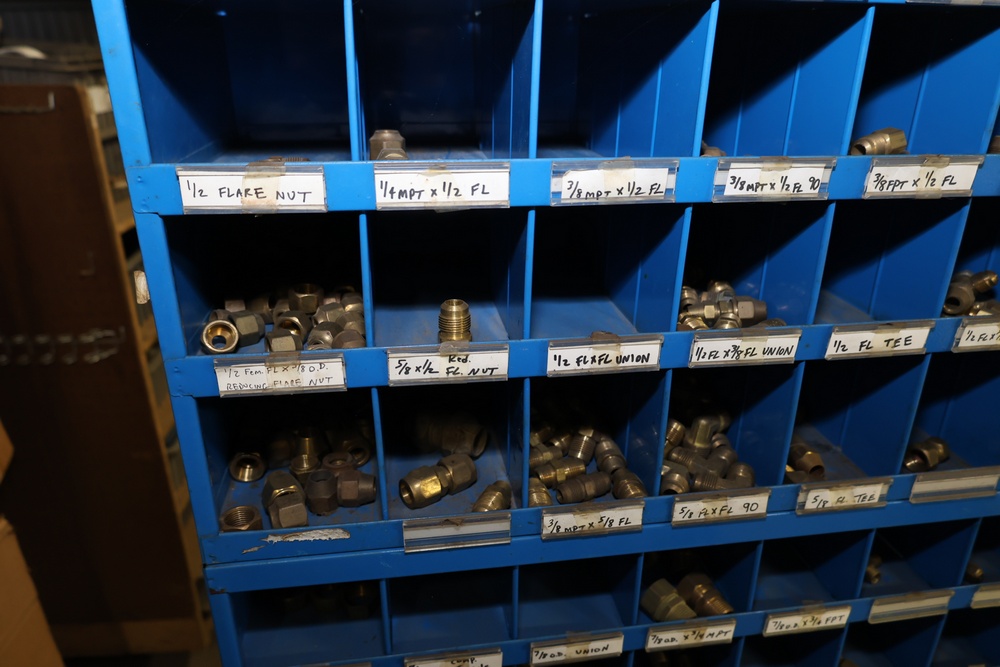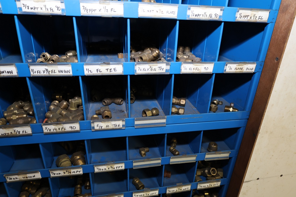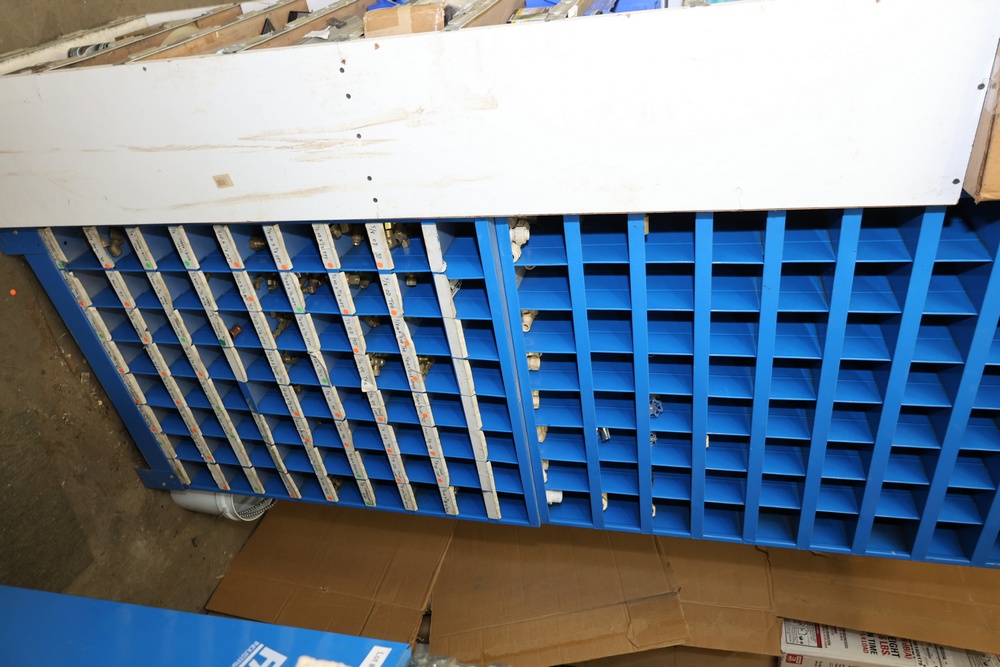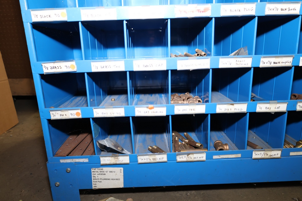 Blue Fastenal Metal shelving unit containing numerous compartments, labeled and stocked with assorted brass fittings and hardware. Items include various sizes and types of fittings. Shelving unit is tall and designed for organized storage. Buyer must take all.