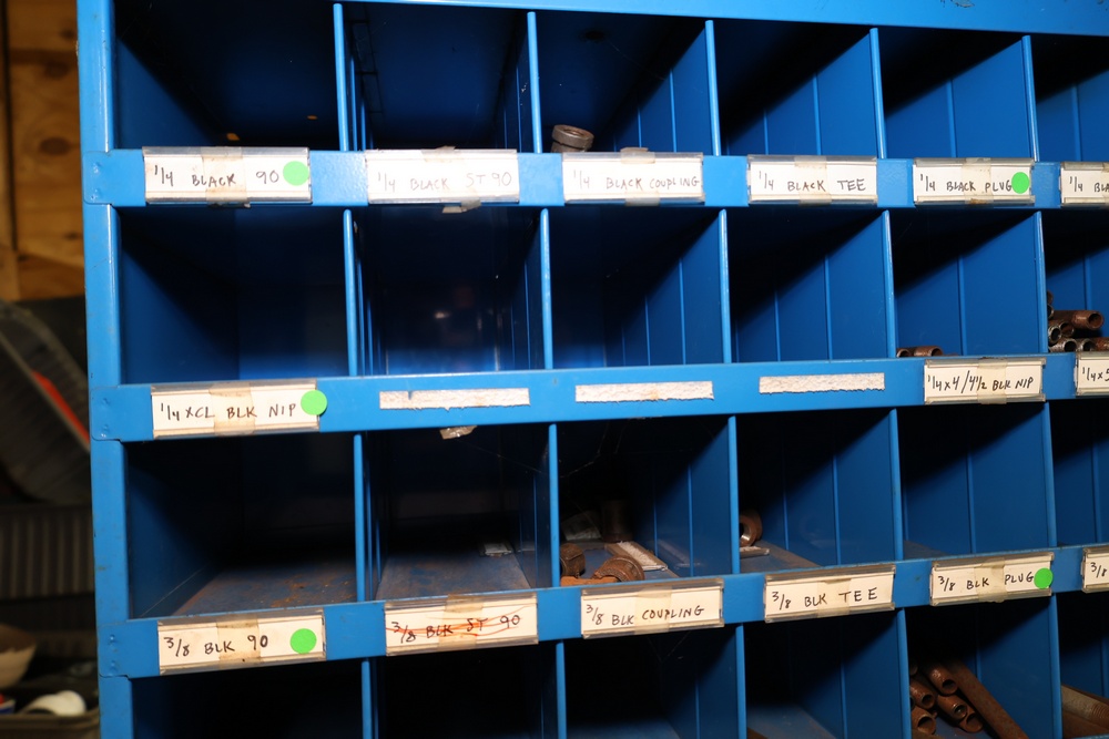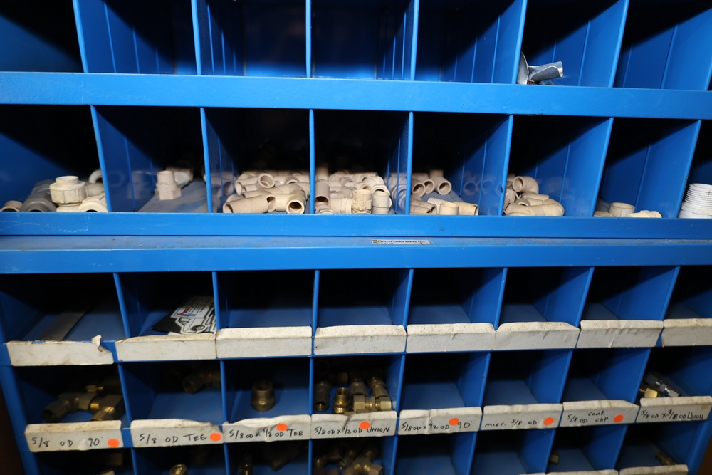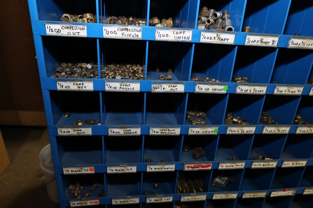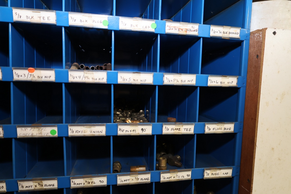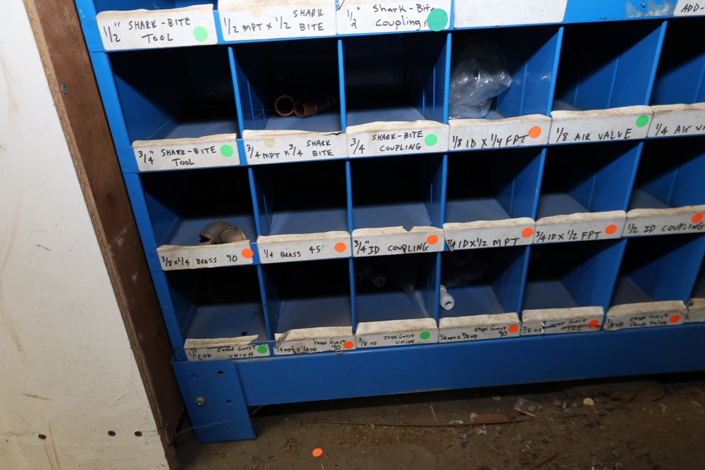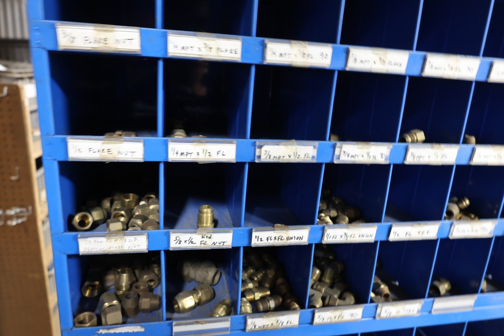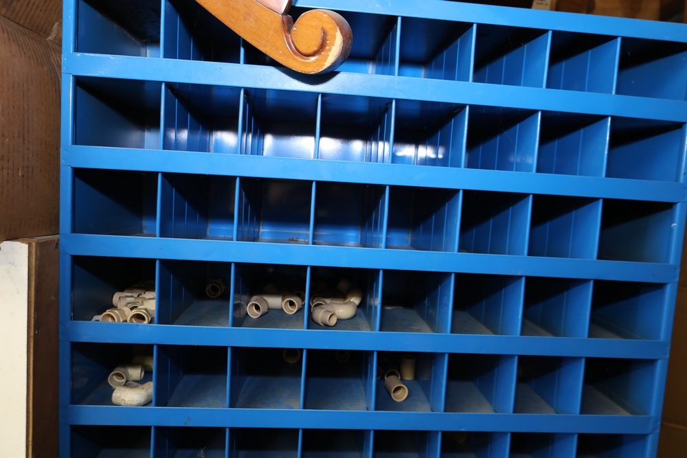 Blue Fastenal Metal shelving unit containing numerous compartments, labeled and stocked with assorted brass fittings and hardware. Items include various sizes and types of fittings. Shelving unit is tall and designed for organized storage. Buyer must take all.