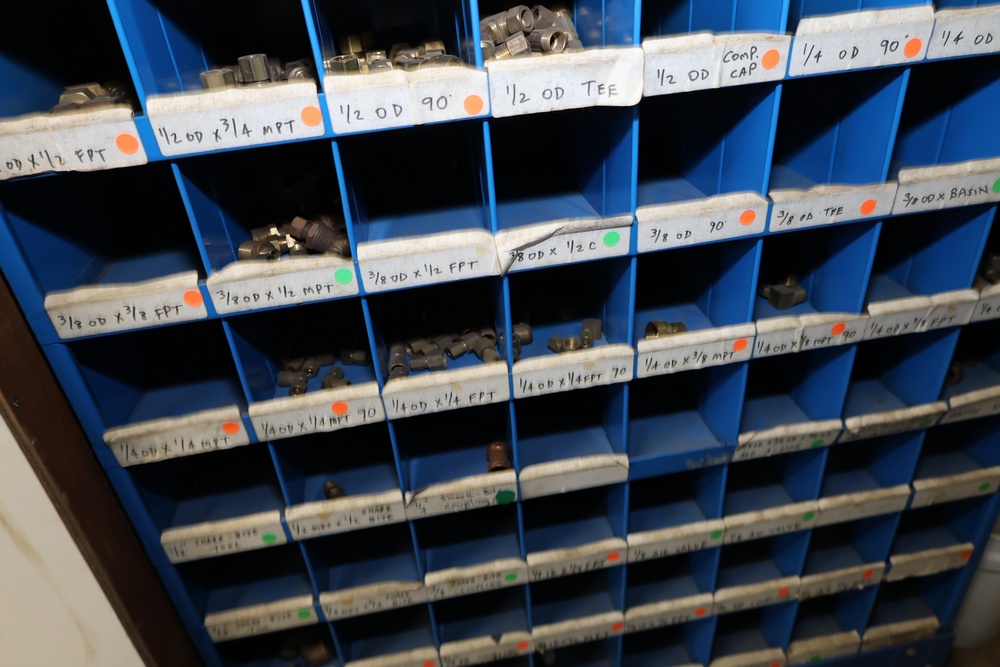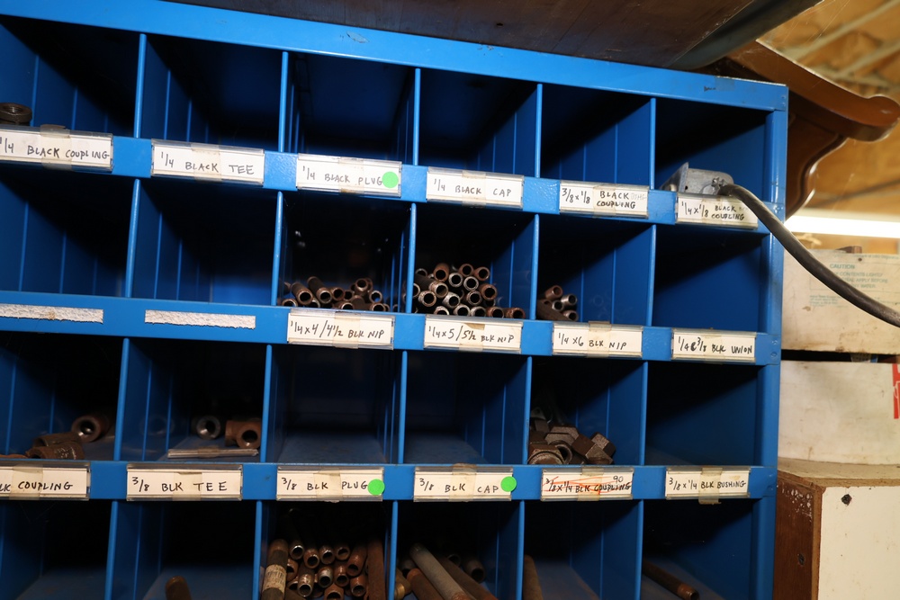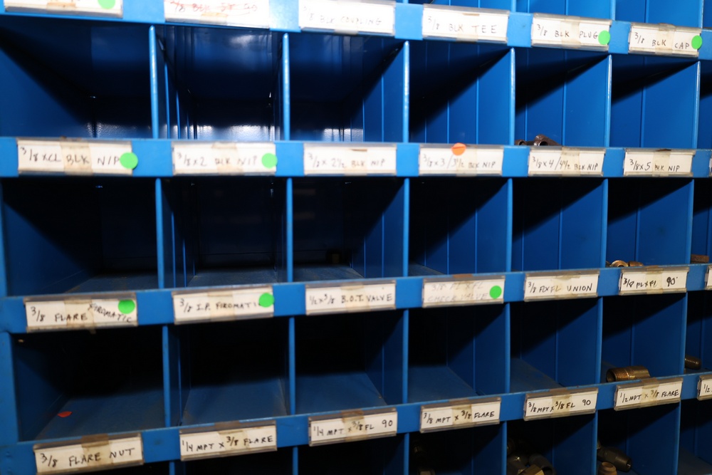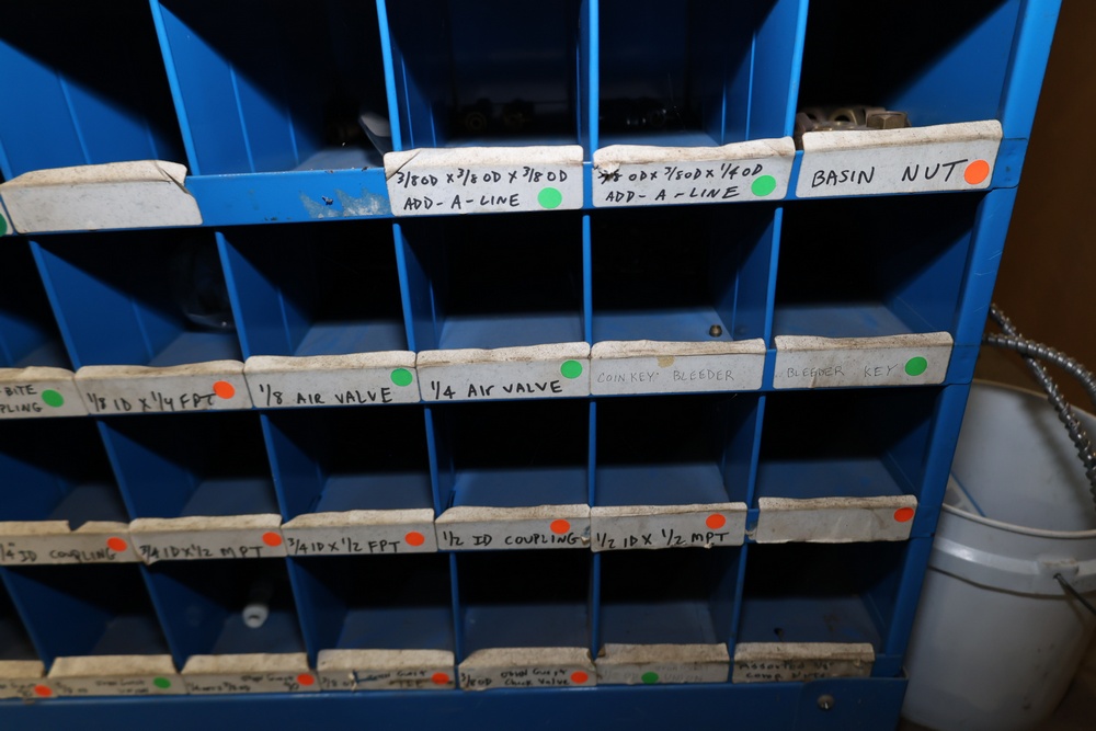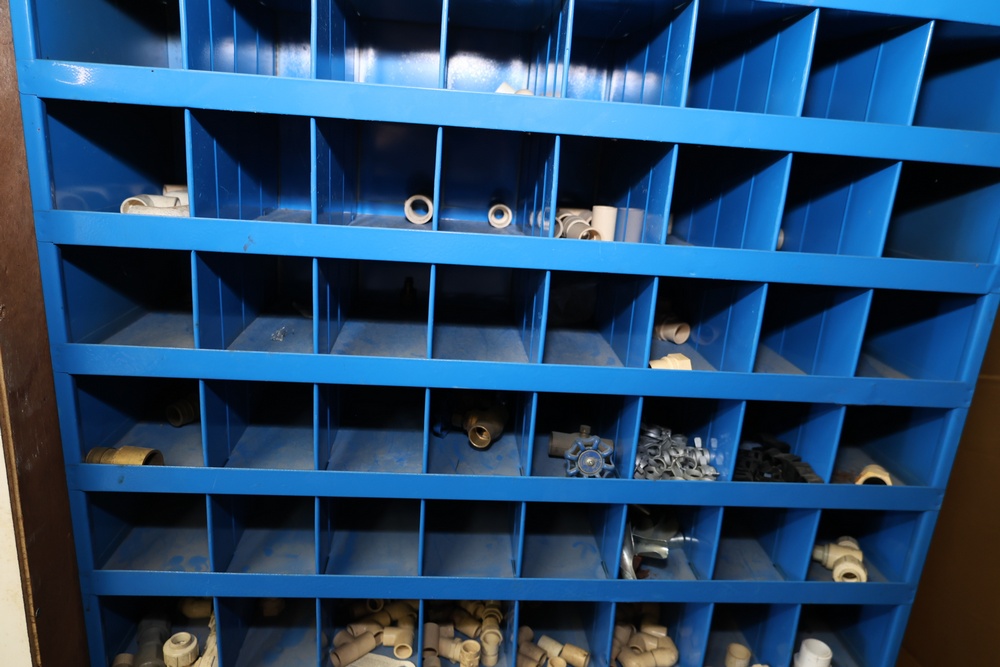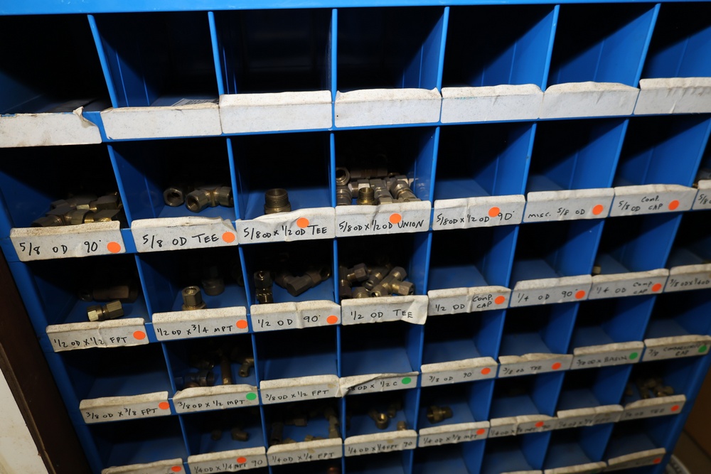 Blue Fastenal Metal shelving unit containing numerous compartments, labeled and stocked with assorted brass fittings and hardware. Items include various sizes and types of fittings. Shelving unit is tall and designed for organized storage. Buyer must take all.