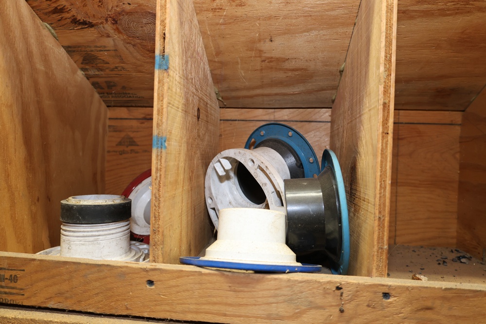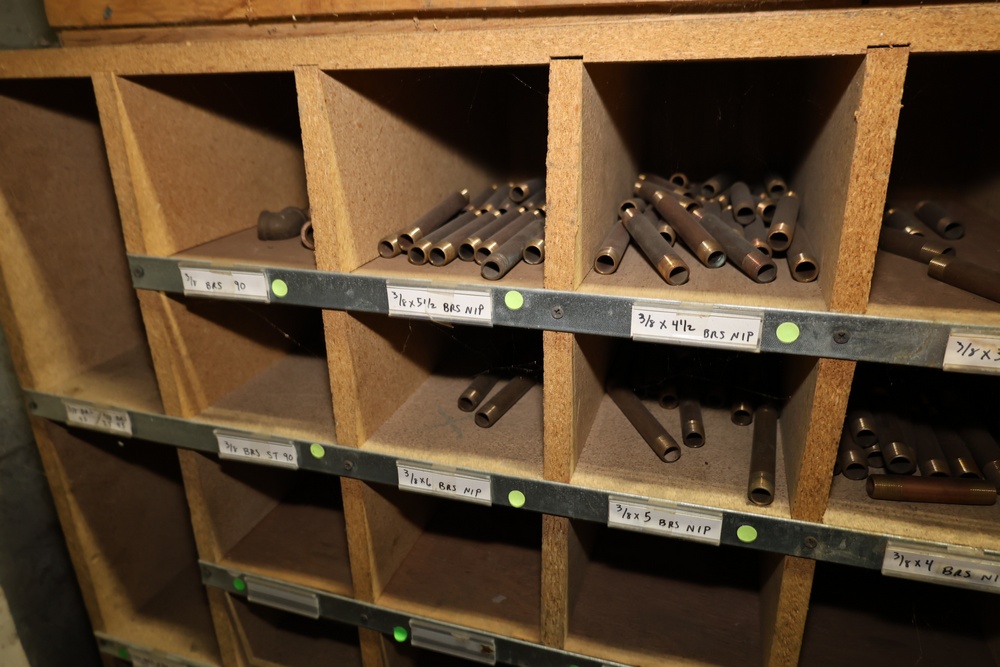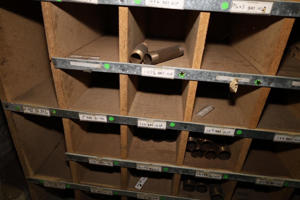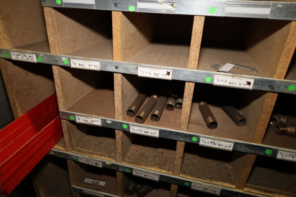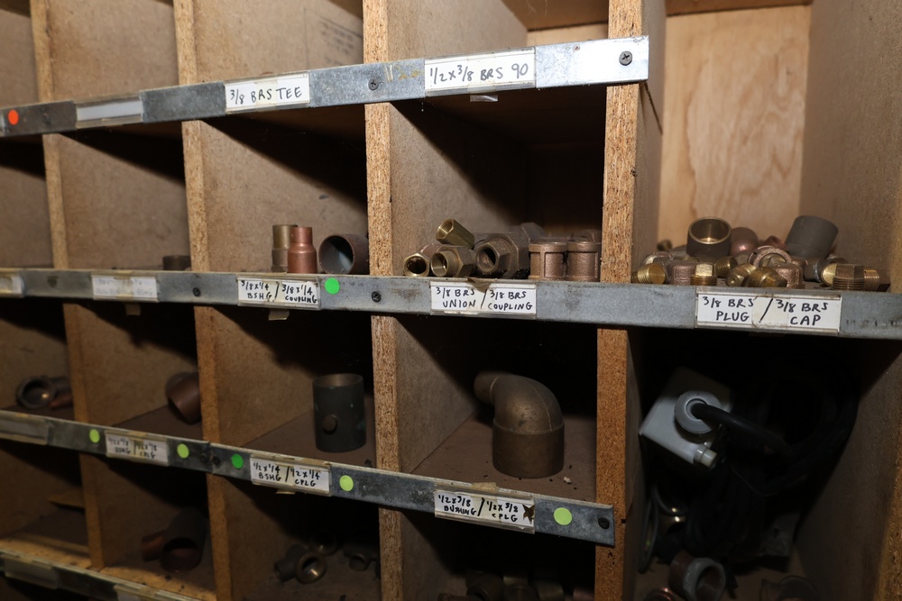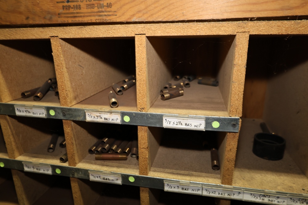 Plumbing and Hardware Components in Wooden Storage Bins. Includes various fittings, pipes, valves, and other hardware components. Buyer must take all.