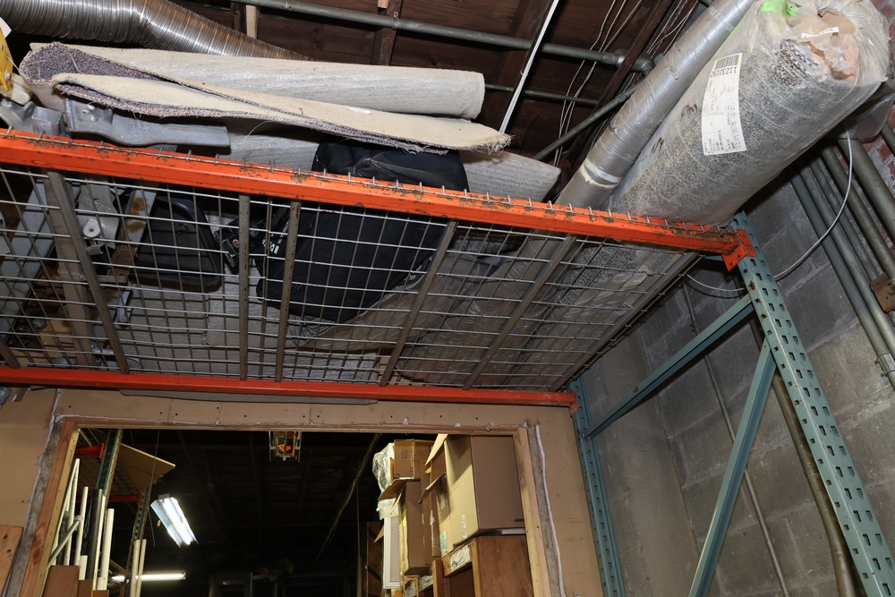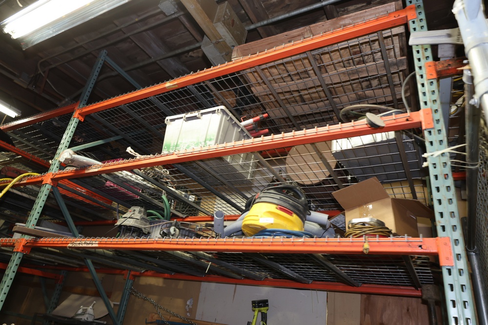 Pallet racks including six uprights and nine shelves. This is not bolted to the floor. Excludes all contents. NOTE - This lot must be picked up on Saturday October 25th at 9AM no exceptions.