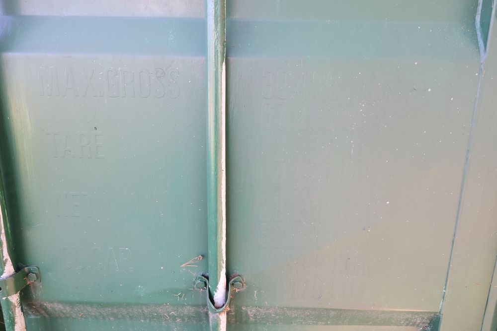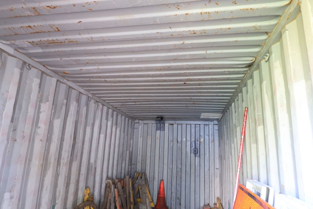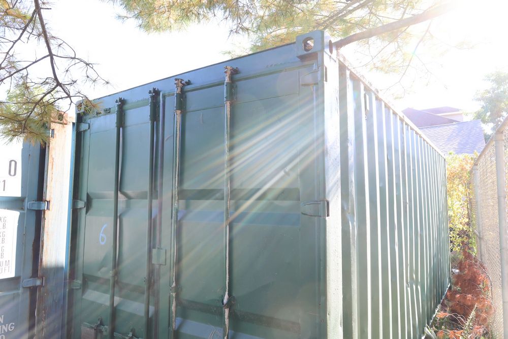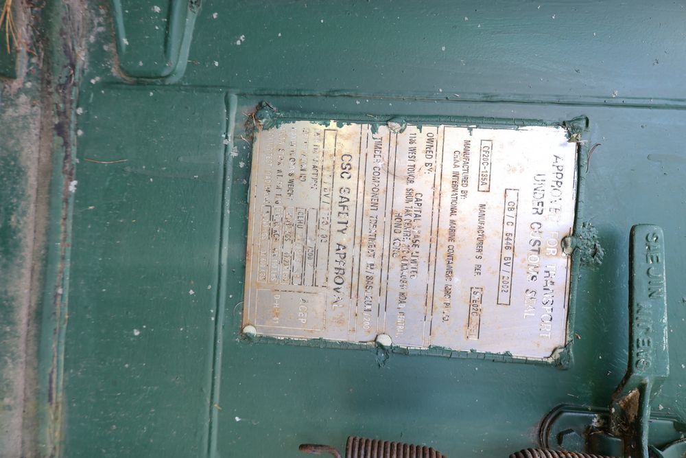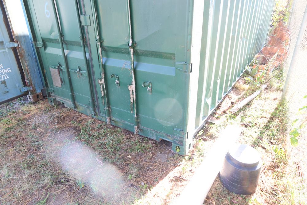 Green Conex container measuring 20'L x 8'W x 102"T. Features exterior and interior visible wear, including dents on the sides and some surface rust. The interior has a wooden floor with signs of use. Pickup only. Buyer responsible for finding third party transport company to load and move, if necessary. Contents not included.