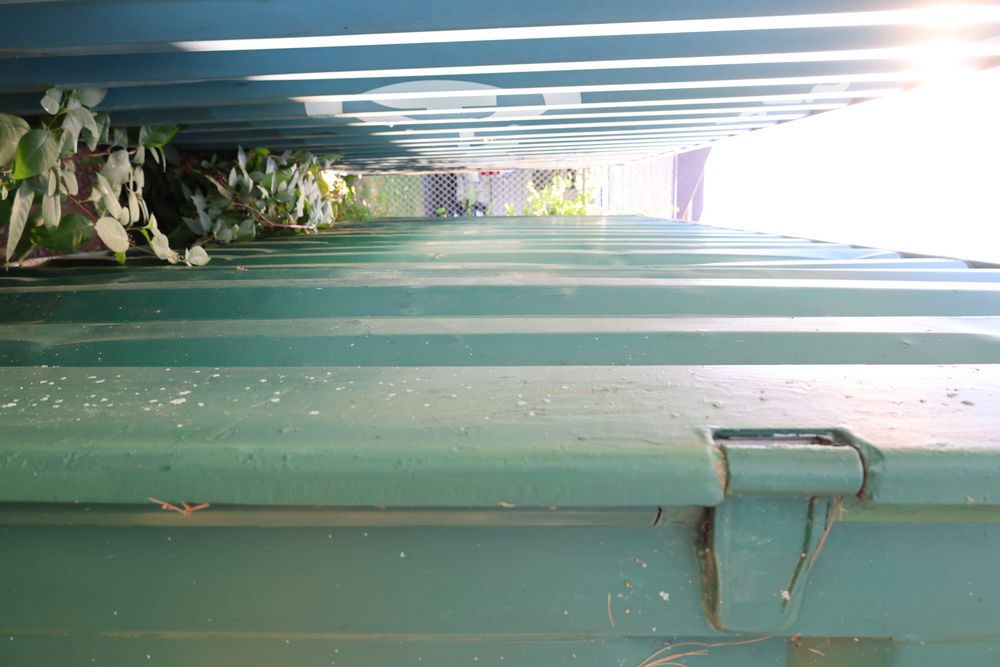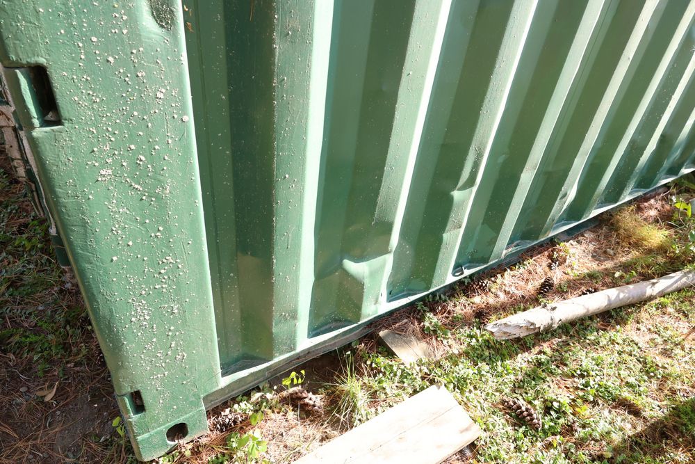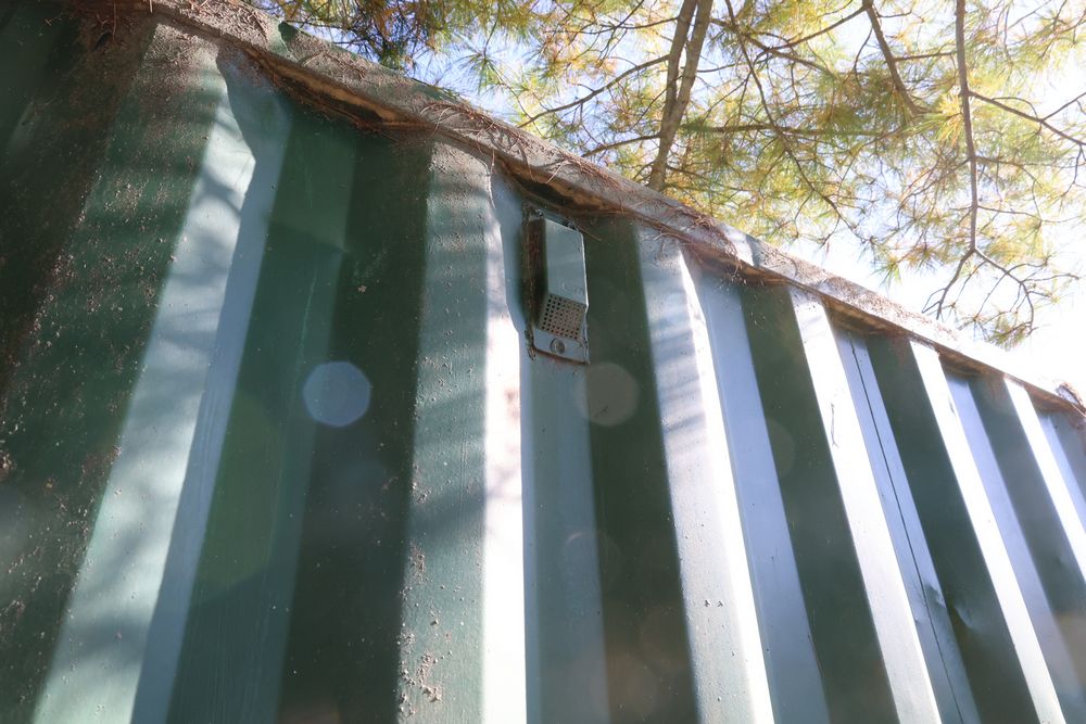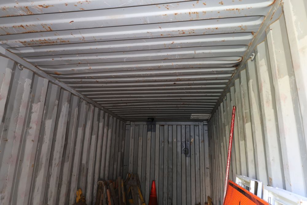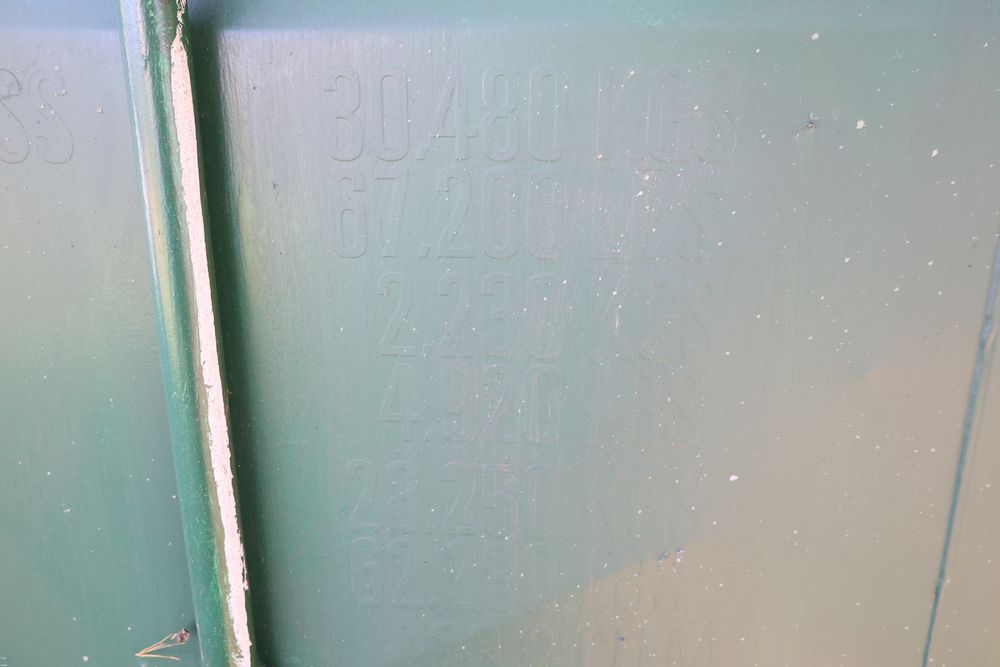 Green Conex container measuring 20'L x 8'W x 102"T. Features exterior and interior visible wear, including dents on the sides and some surface rust. The interior has a wooden floor with signs of use. Pickup only. Buyer responsible for finding third party transport company to load and move, if necessary. Contents not included.