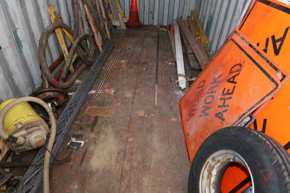 Items include Clark Bobcat Model 825 Hydrostatic Skid Steer Loader, Portable metal-sided office trailer, Conex containers, Micro-Grade Laser System, building materials, tools, tires, and more. Items are located in Beacon, NY.