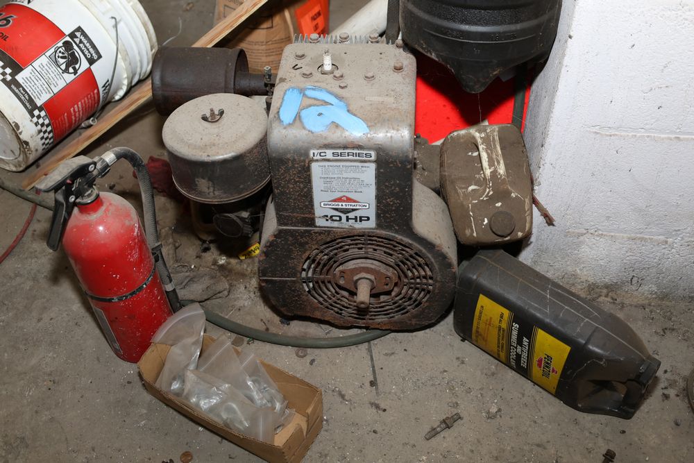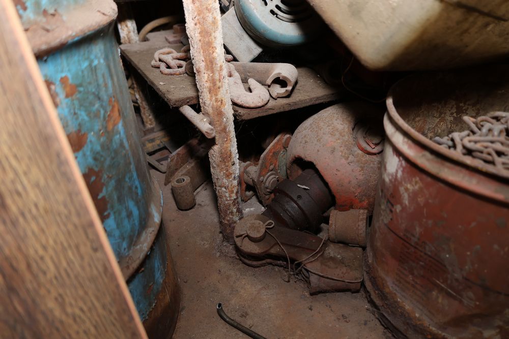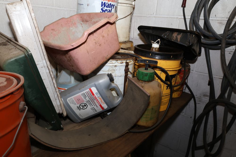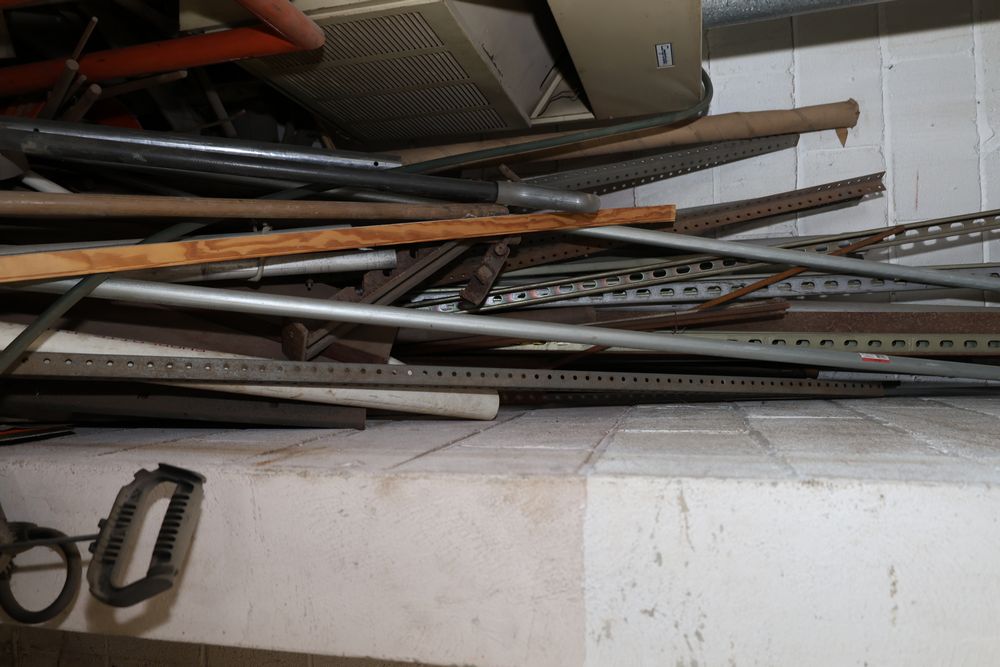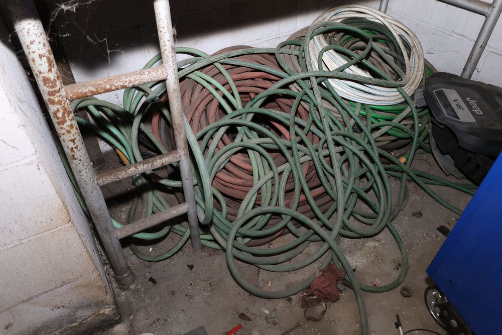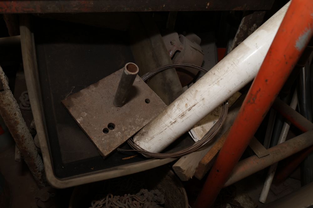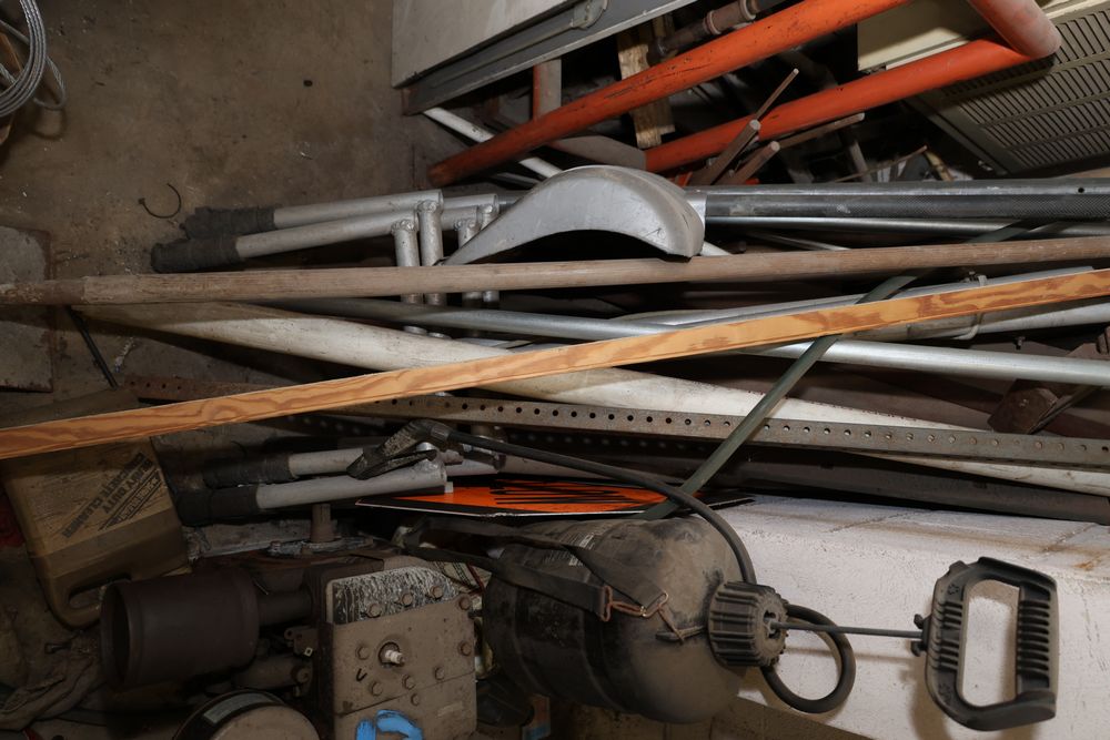 Contents under air filtration system including all contents extending from the air filtration system area to the corner wall. Items include scrap metal, filters, wheel blocks, pistons, hoses, jack stands, couplers, motors, waterproofing material, and various tools and supplies. Buyer must take all. Pickup only.