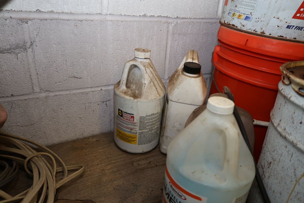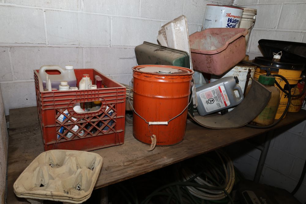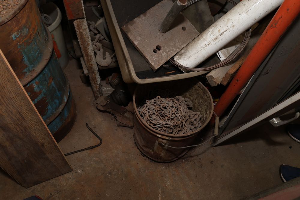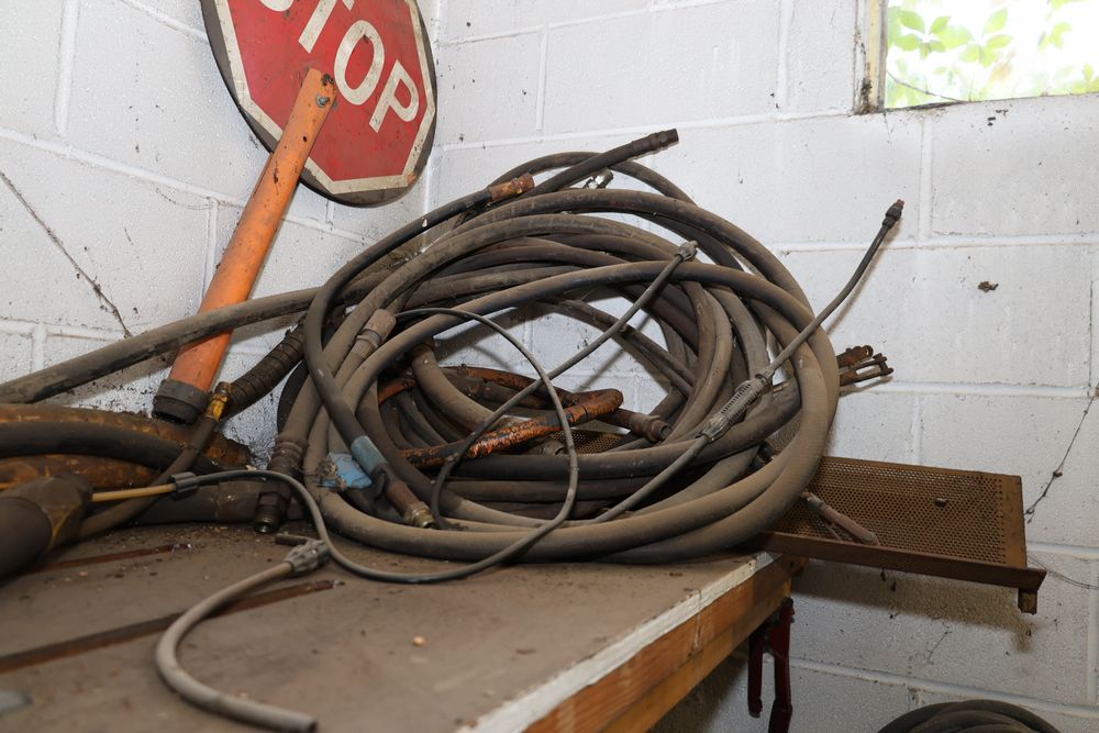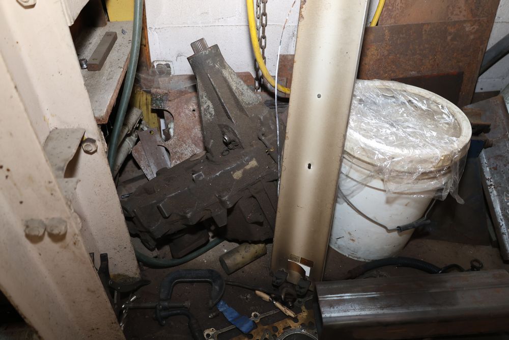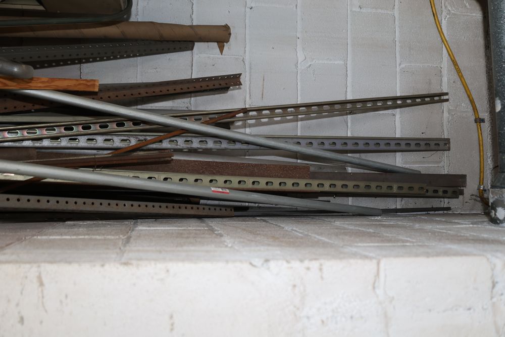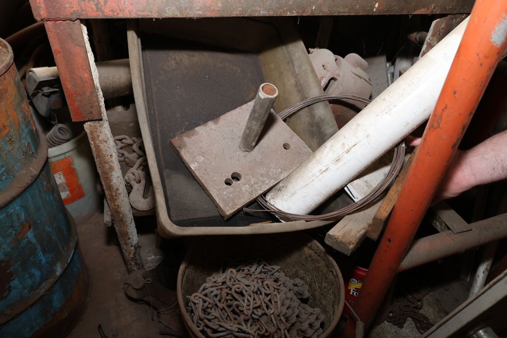 Contents under air filtration system including all contents extending from the air filtration system area to the corner wall. Items include scrap metal, filters, wheel blocks, pistons, hoses, jack stands, couplers, motors, waterproofing material, and various tools and supplies. Buyer must take all. Pickup only.