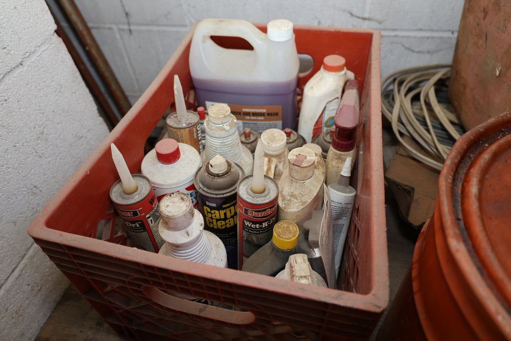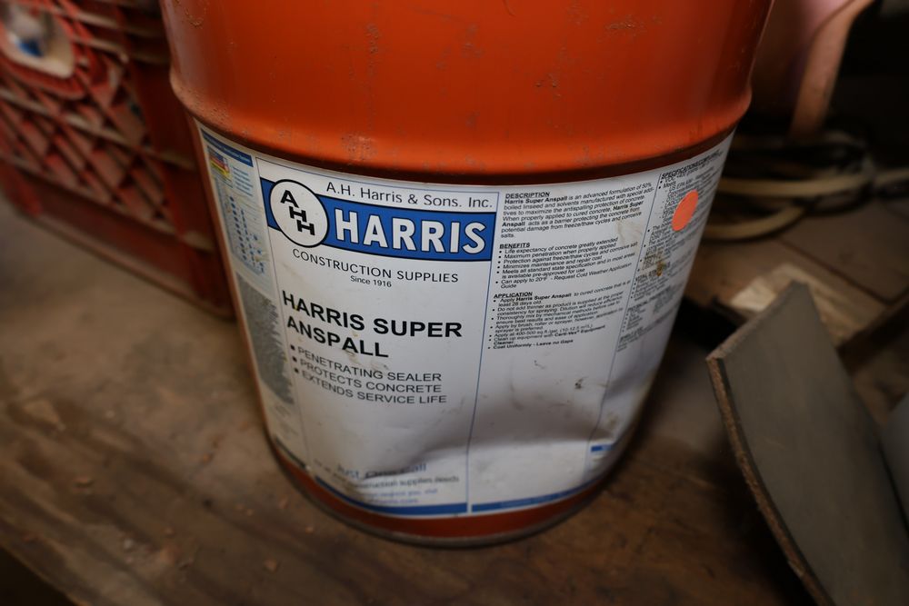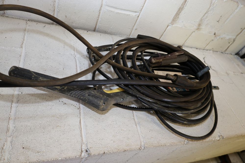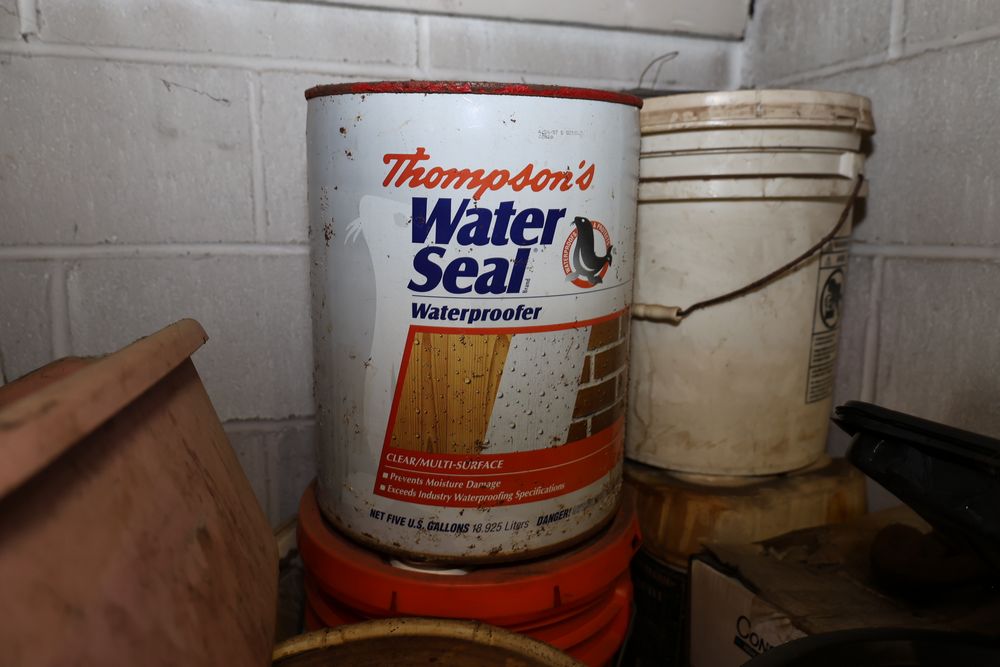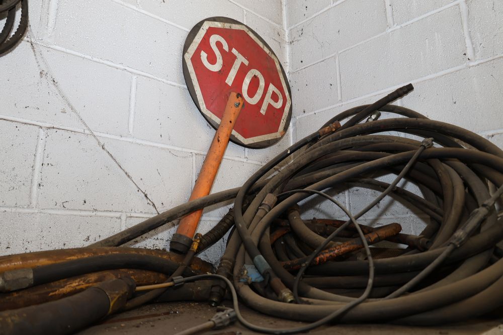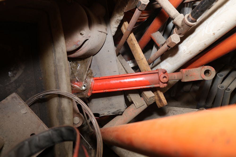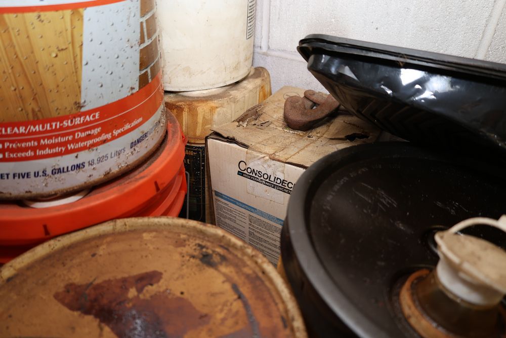 Contents under air filtration system including all contents extending from the air filtration system area to the corner wall. Items include scrap metal, filters, wheel blocks, pistons, hoses, jack stands, couplers, motors, waterproofing material, and various tools and supplies. Buyer must take all. Pickup only.