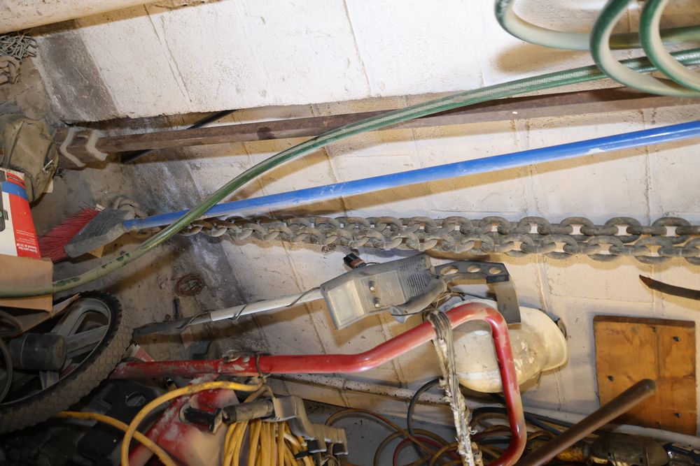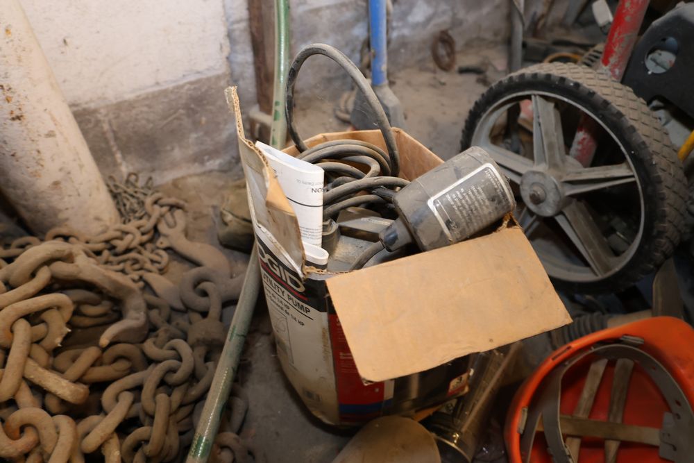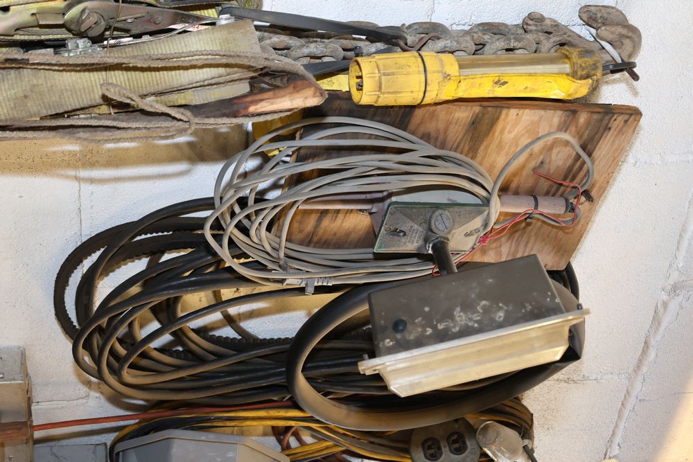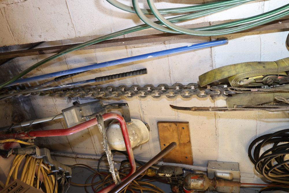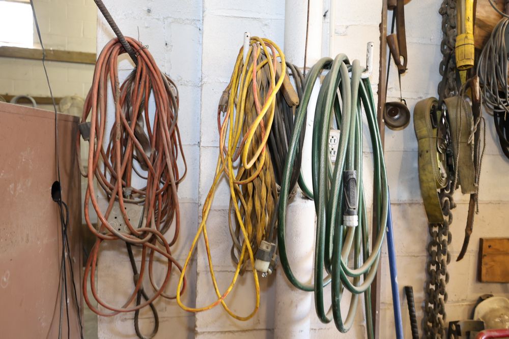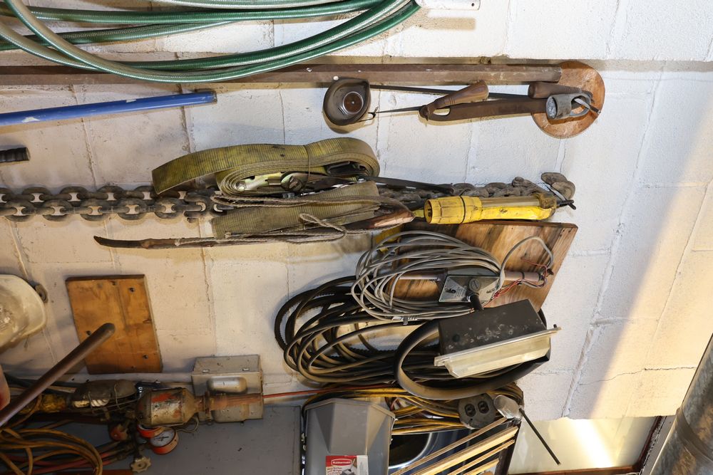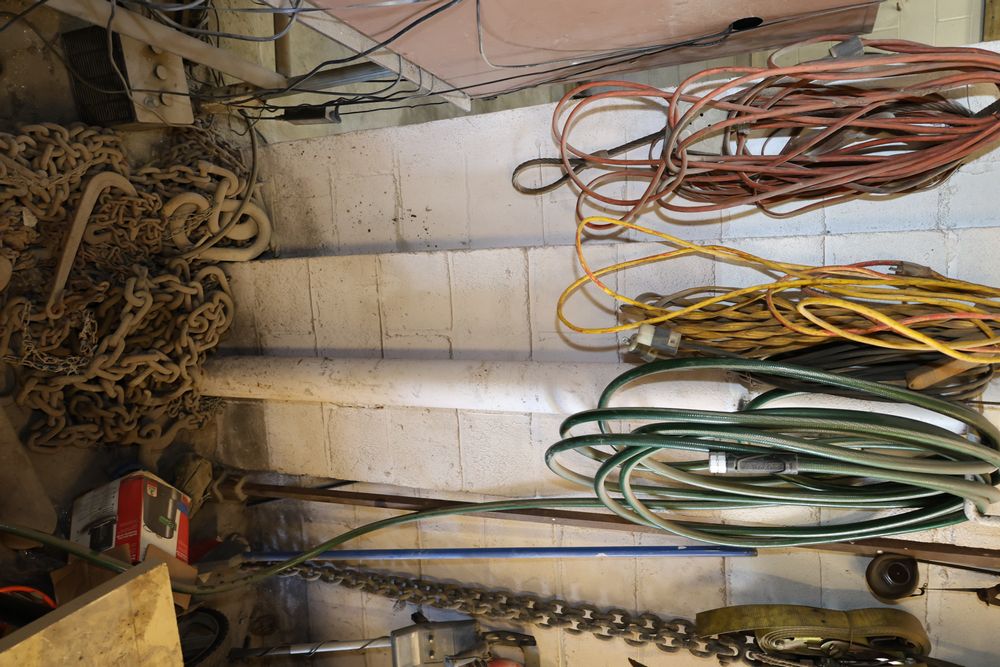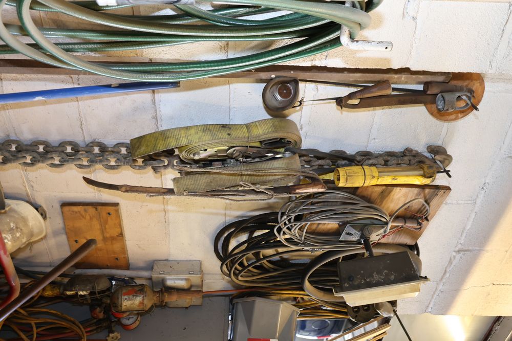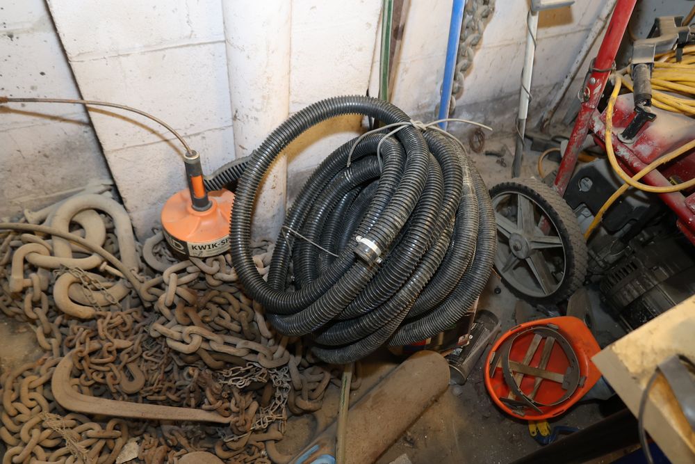 Contents of wall including pile of chains, hoses, extension cords, ratchet straps, excavator pin, and more. Includes items such as coiled hoses, hanging extension cords, multiple chains, a utility pump in the original box, and related tools and equipment. Buyer must take all. Pickup only.