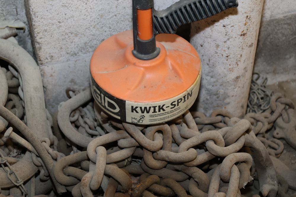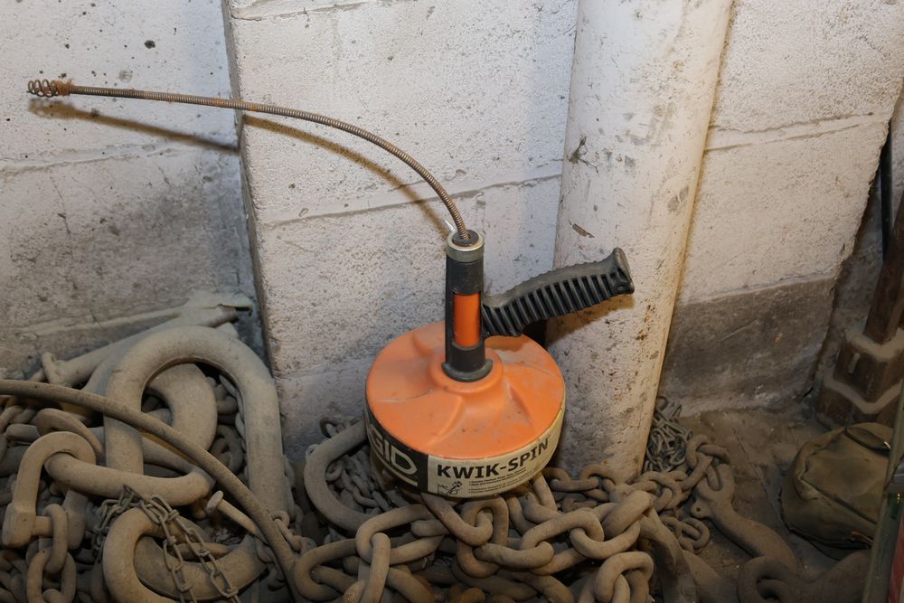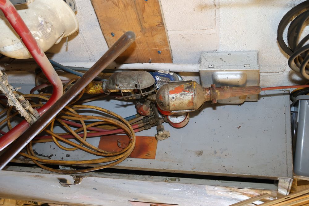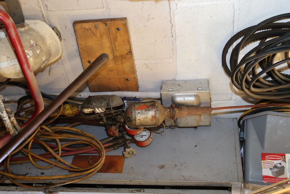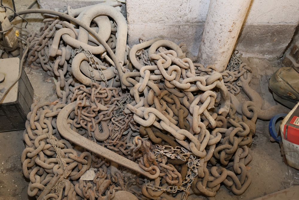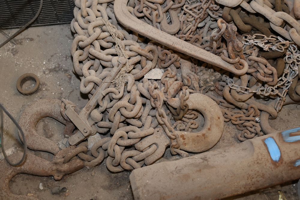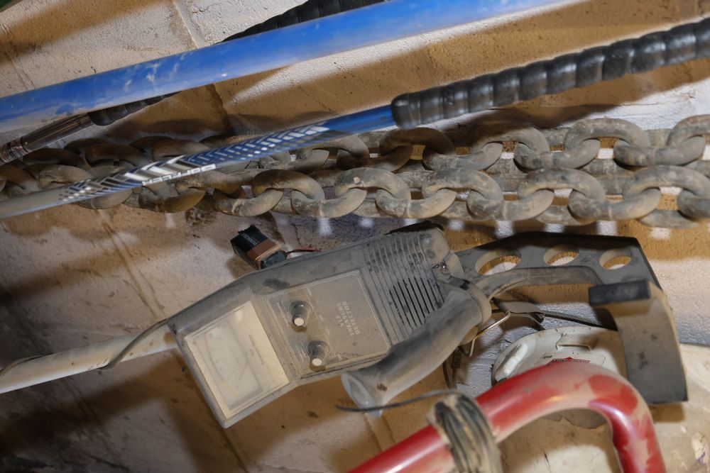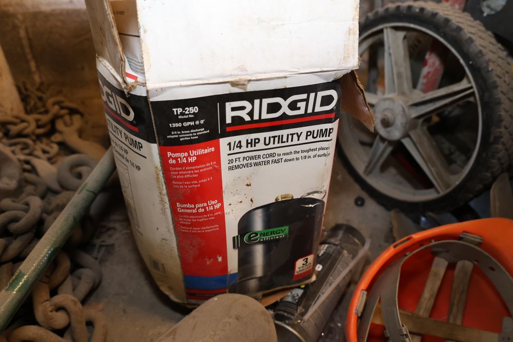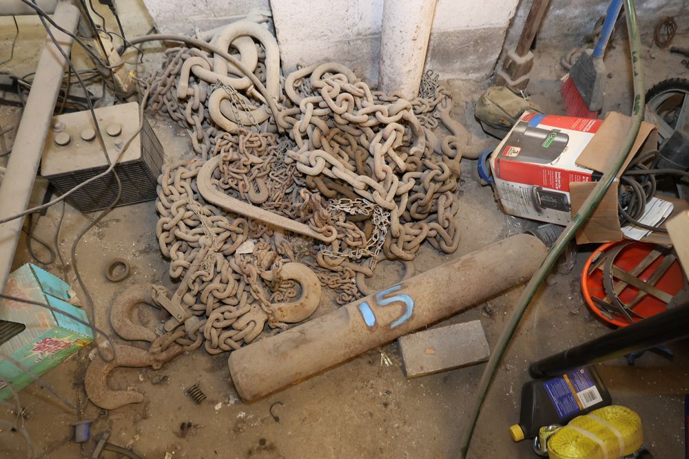 Contents of wall including pile of chains, hoses, extension cords, ratchet straps, excavator pin, and more. Includes items such as coiled hoses, hanging extension cords, multiple chains, a utility pump in the original box, and related tools and equipment. Buyer must take all. Pickup only.