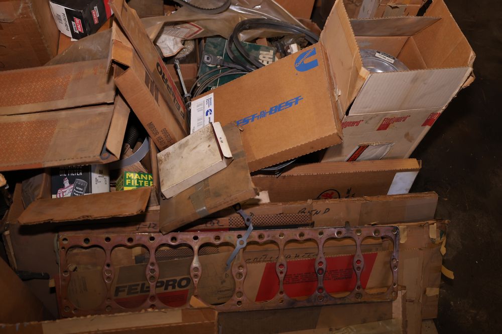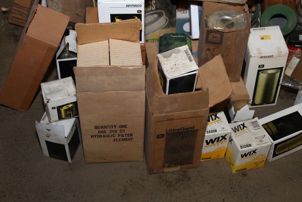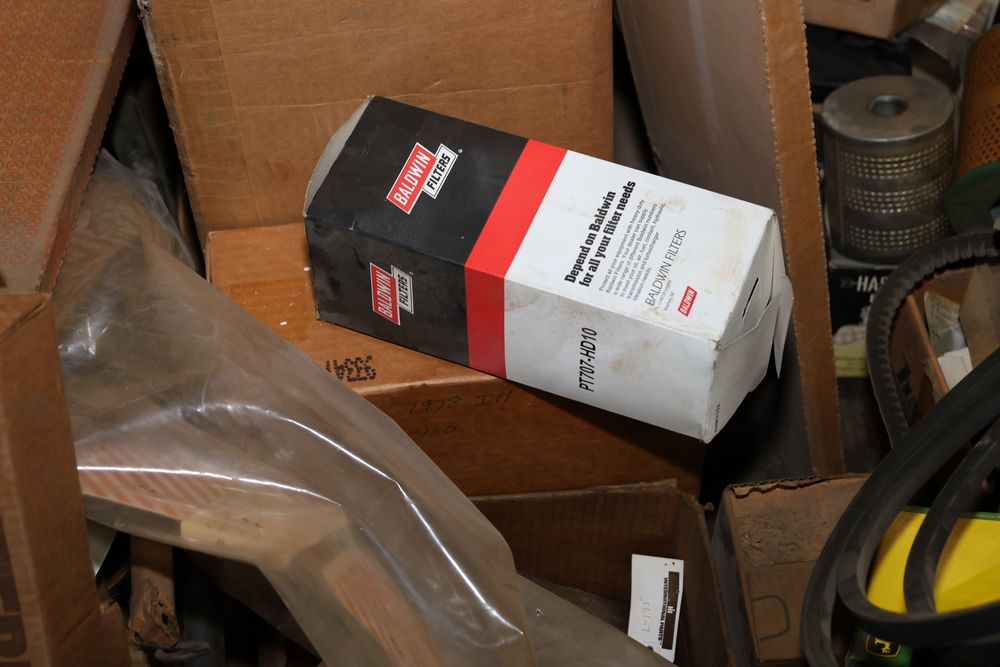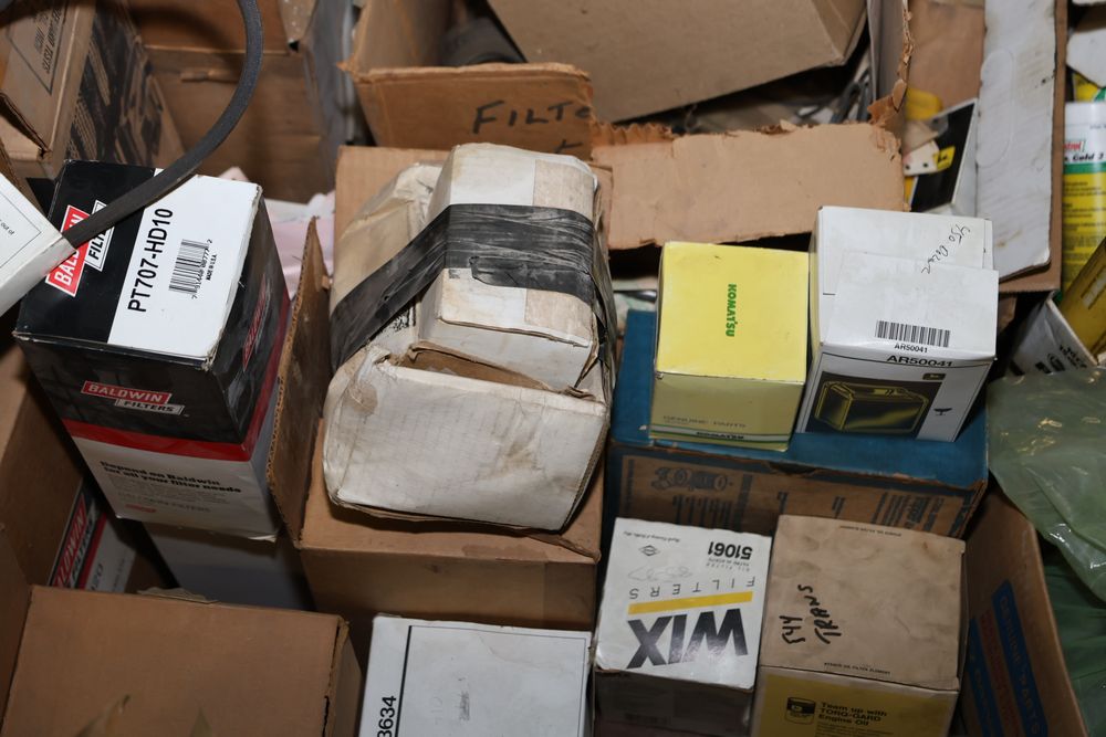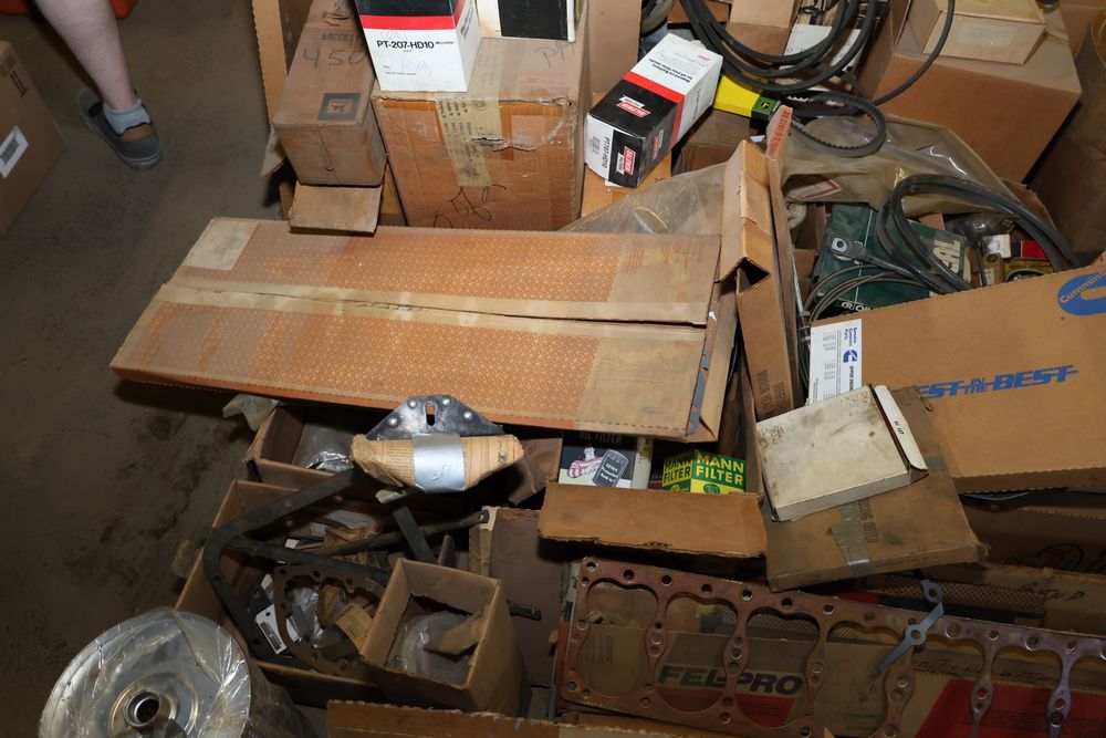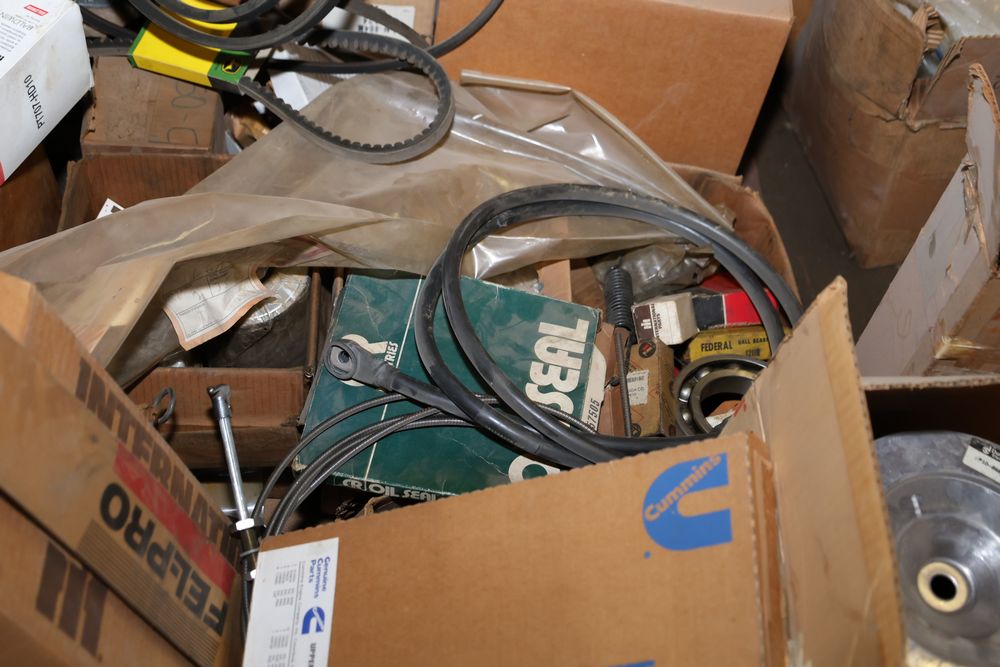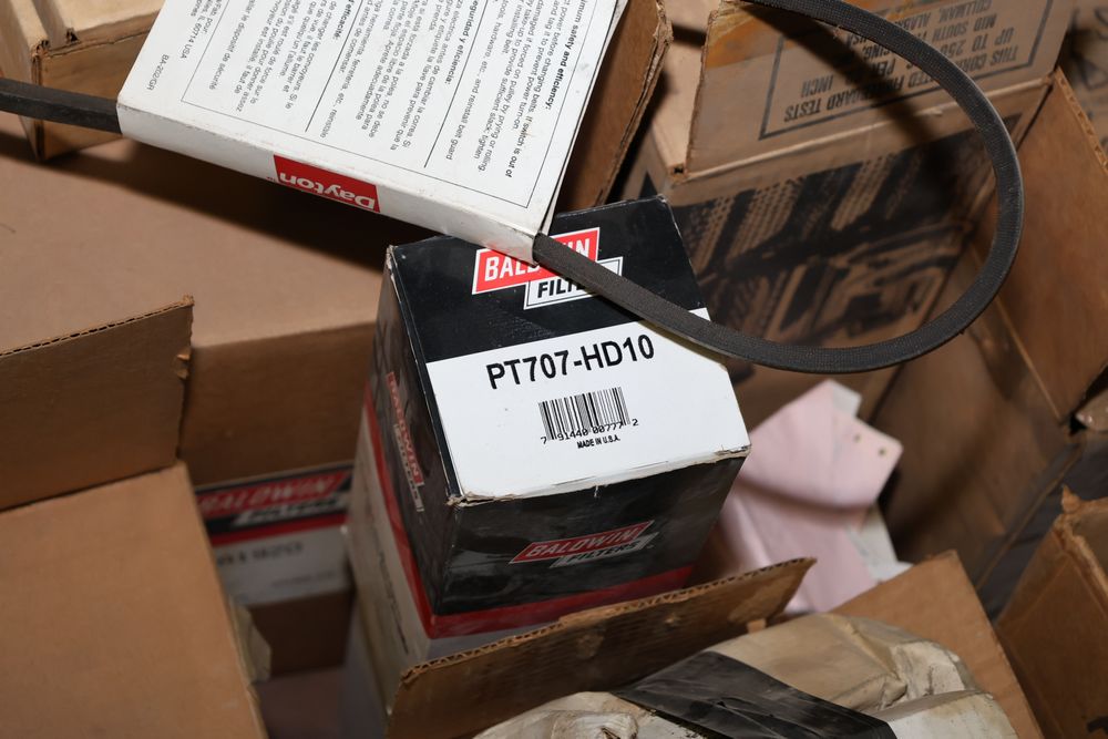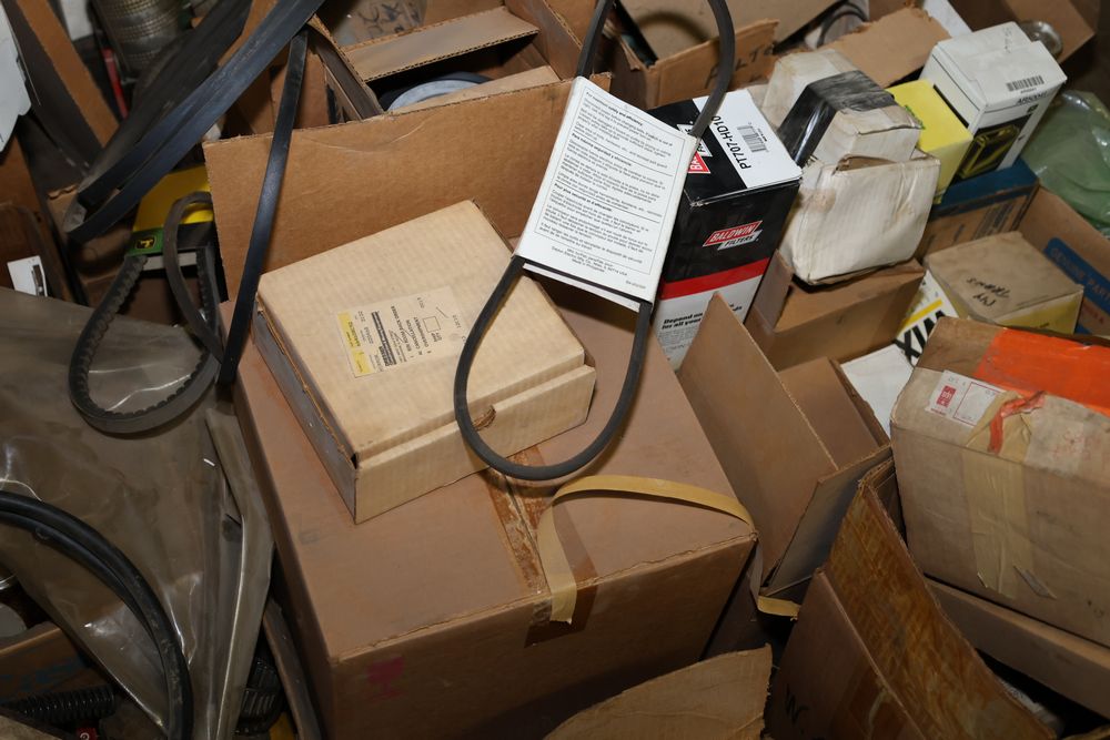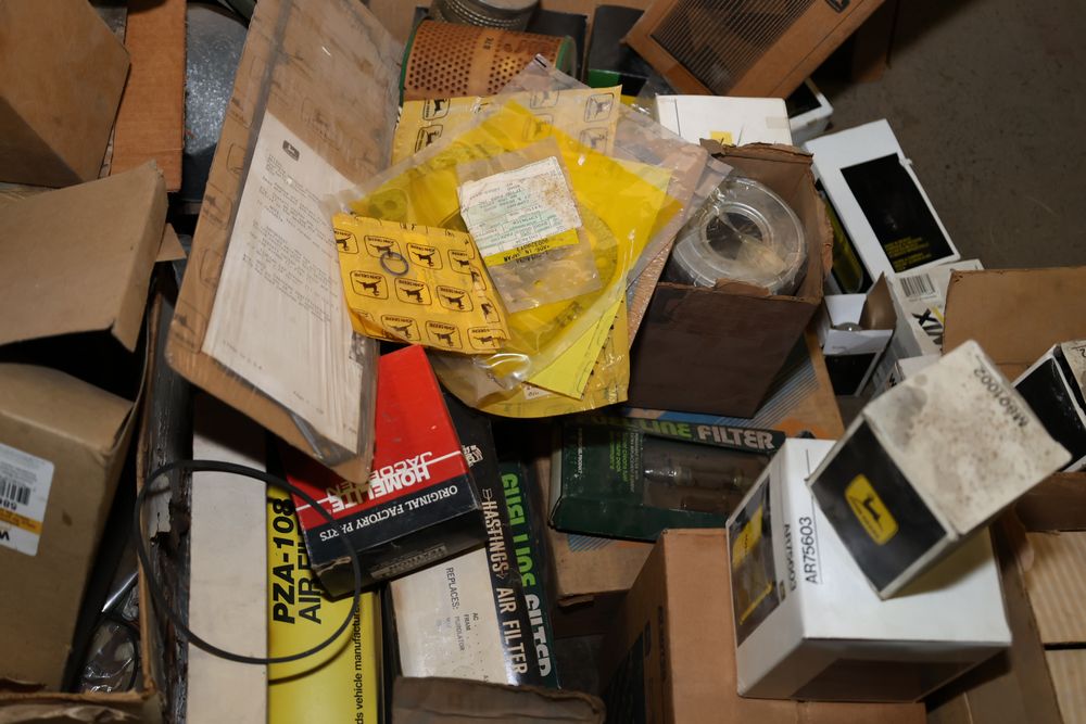 Automotive and equipment parts including filters, seals, bearings, hoses, and more. The assortment includes boxed and loose items from various manufacturers and brands. The inventory features gaskets, belts, and other replacement parts suitable for machinery and automotive use. Buyer must take all. Pickup only.