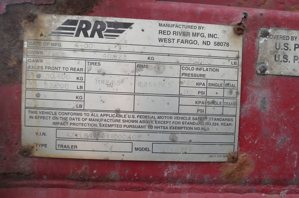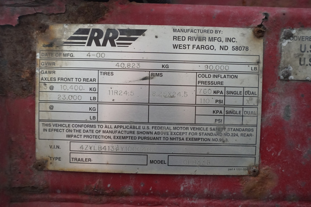 2000 Red River Flowboy; VIN: 4ZYLB4134Y1000403; Mileage: N/A, GVWR 90,000 lbs. Rust. Seller States; In operation this year.