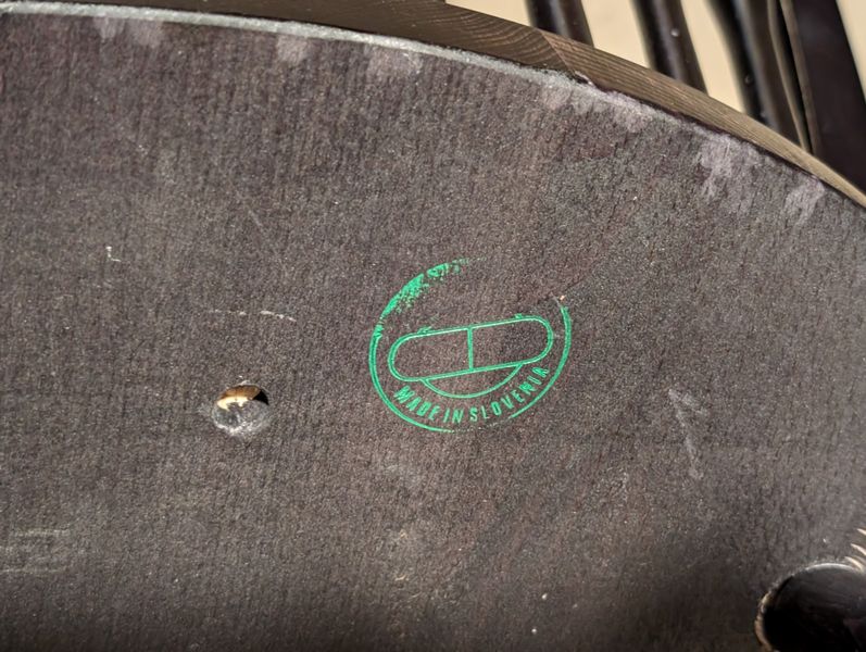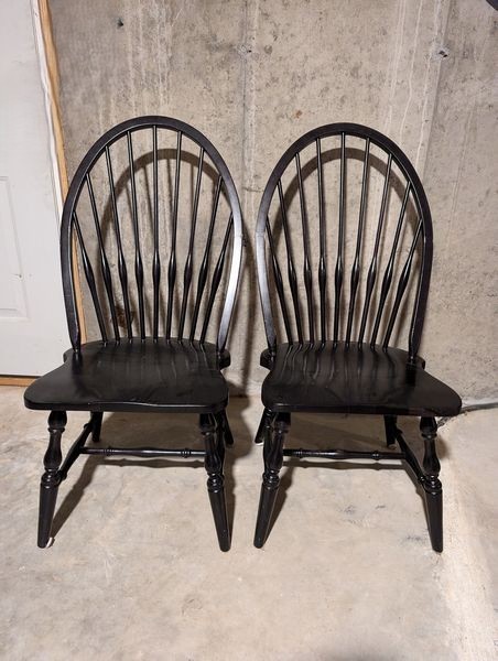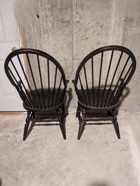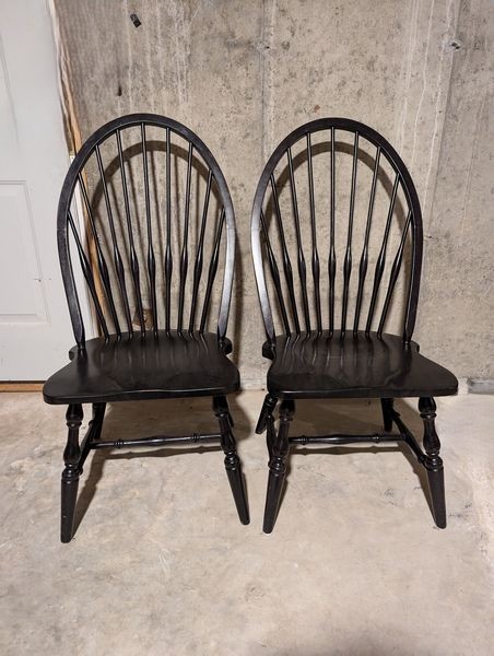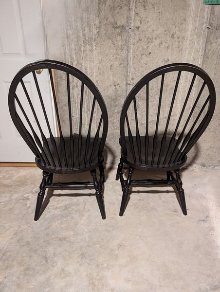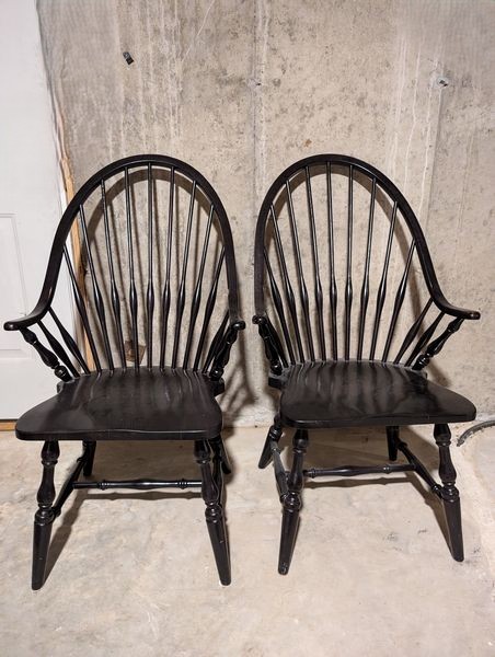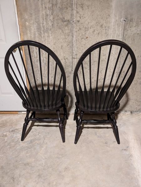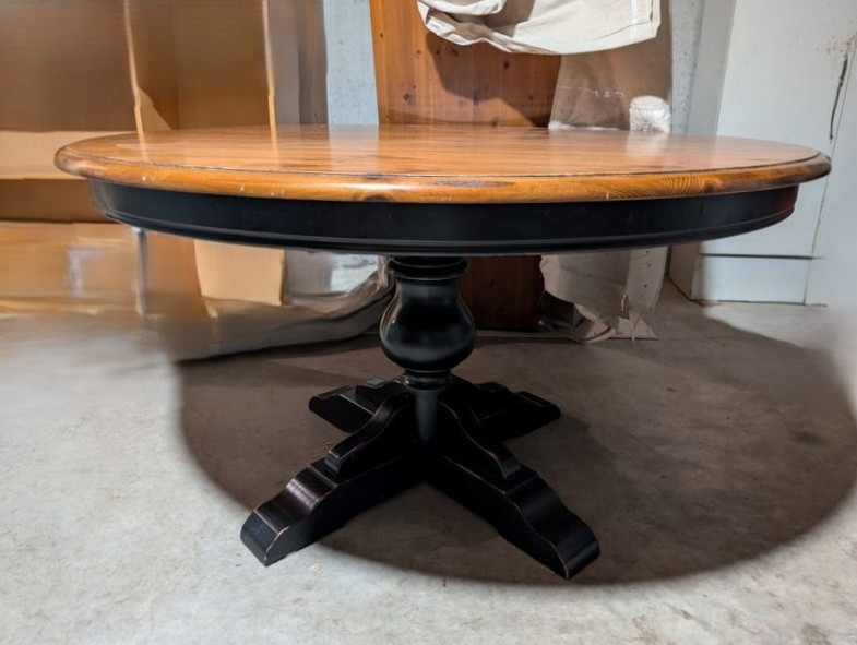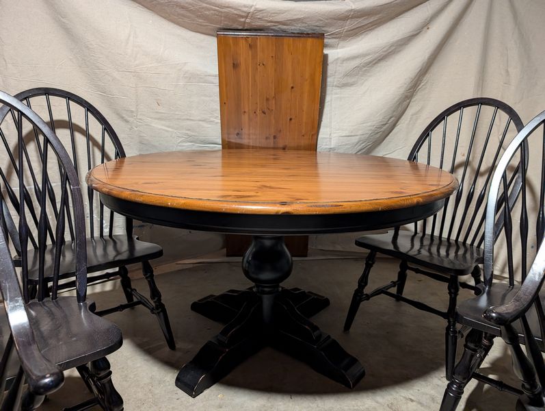 Modern Dinette Set. Two-toned round dining table with natural wood top, 54"diam x21"H plus 21"table insert on blk stained pedestal base (detached with screws incl); set/6 blk stained oversized Windsor-style chairs, ea. 18.5"Wx18"Dx40"H. Loc in basement with exit through hatchway.
