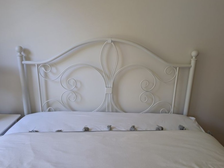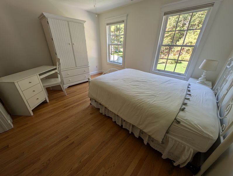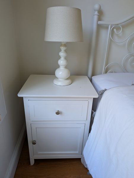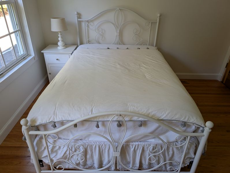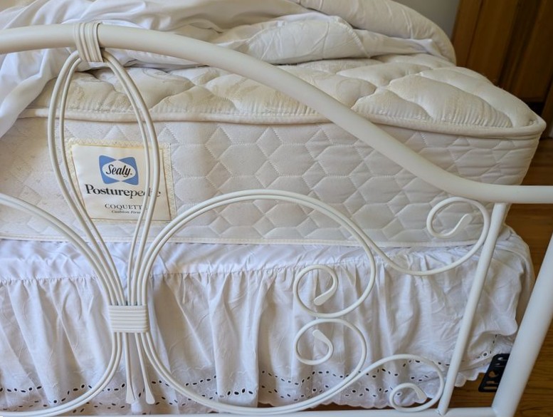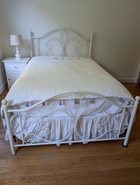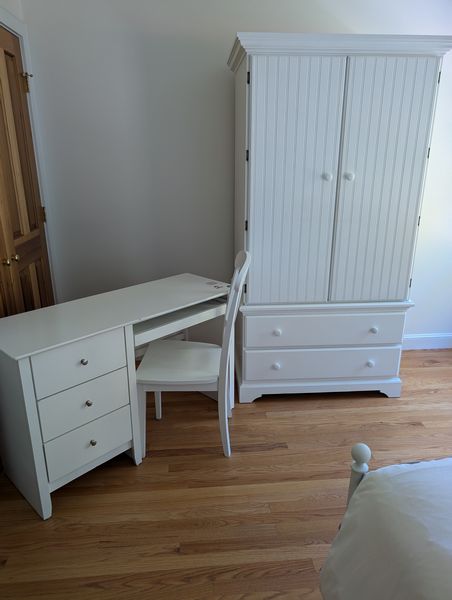 Vermont White Bedroom Furniture, featuring Armoire. Vermont Tubbs white armoire cab with crown molding, beadboard doors, adj inside shelf, two dovetailed drawers, 42"Wx25.5Dx77.5"H; full-sized white metal bed frame, HB 54"Wx4'H, FB 30.5"H with opt Sealy mattress set; white desk with three left side drawers & pullout center tray (see stickers on surf) with white desk chair; white nightstand with single drawer & cab storage; white table lamp. Loc on 2nd fl.