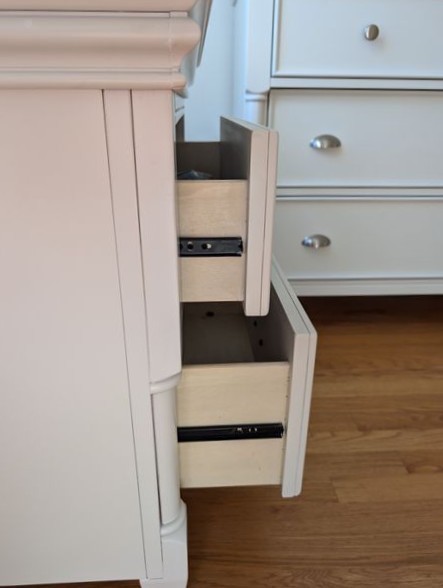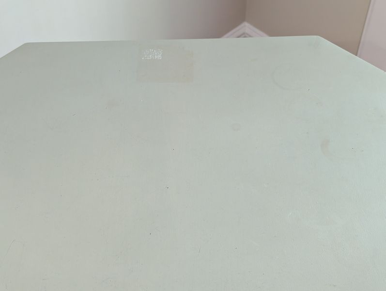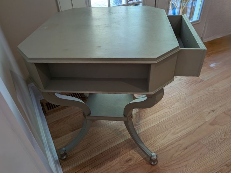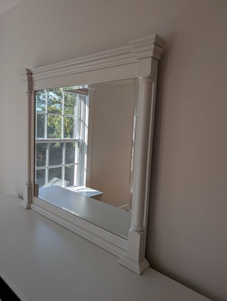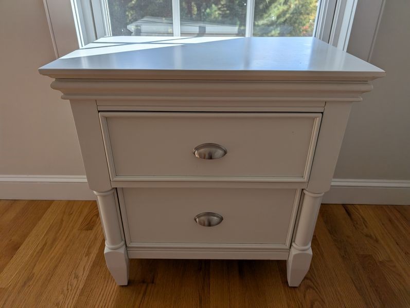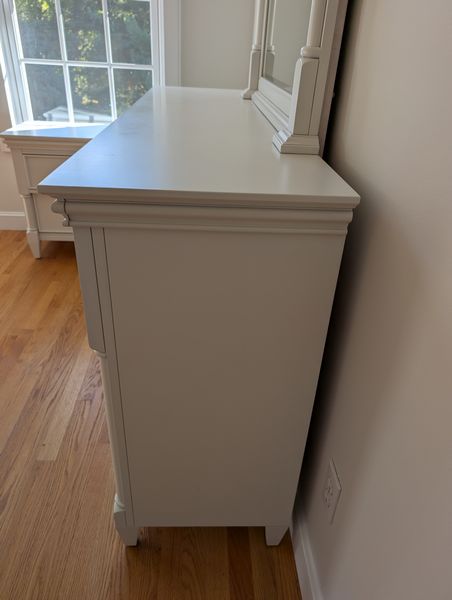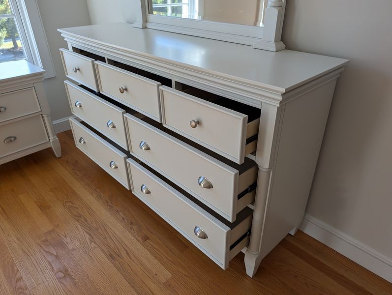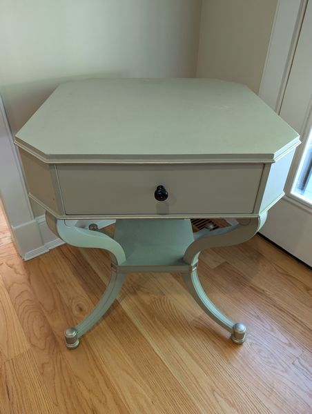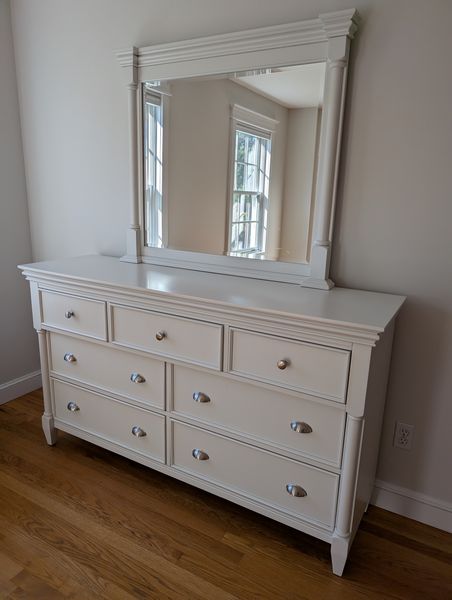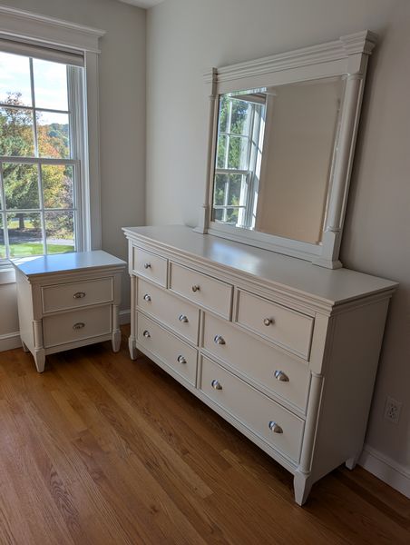 Modern Dresser, Nightstand, Occasional Table. White seven-drawer dresser (silver-colored knobs & pulls), 64"Wx18"Dx37.5"H with attached beveled mirror, 42.5"Wx38"H in 3" thick frame; matching two-drawer nightstand, 26"Wx17"Dx27"H; light green octagonal table with single dovetailed drawer, 24.5"sq x28"H. Loc on 2nd fl.