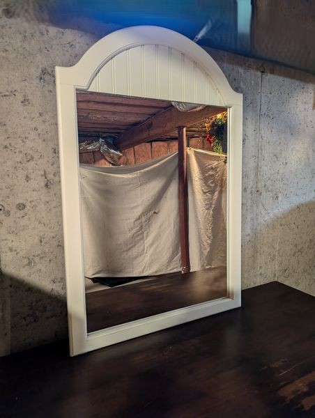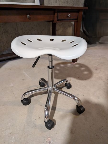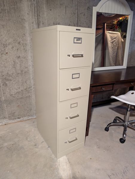Writing Desk, Wall Mirror, File Cabinet, Stool. Three-drawer writing desk (table-style), 63"Wx28"Dx30"H; Premier four-drawer metal file cabinet, 15"Wx25"Dx42"H; white beadboard wall mirror (matches bedroom furniture in other lots), 30"Wx 44"H; ergonomic white rolling seat. Loc in basement with exit through hatchway.