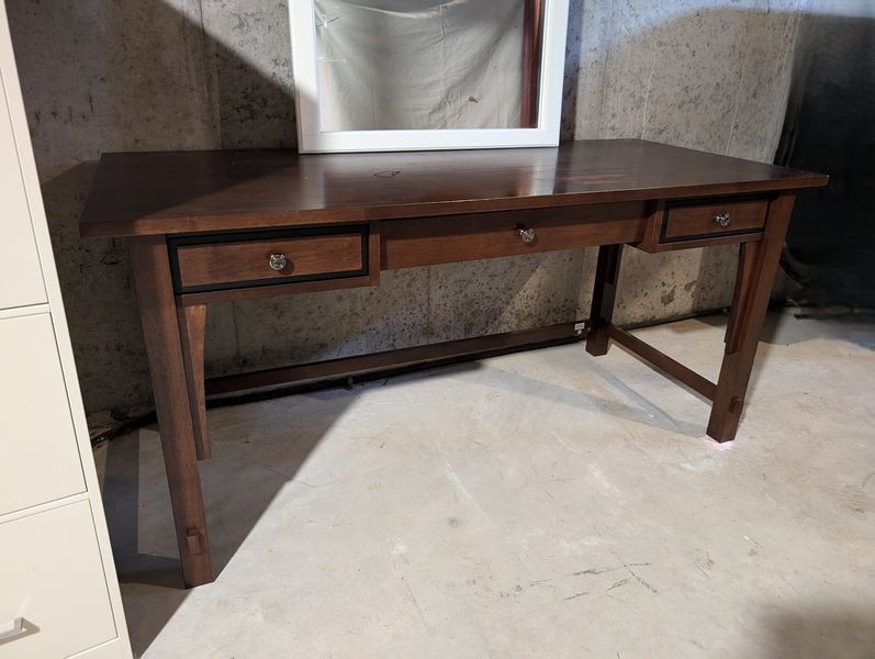 Items include Hampton Bay outdoor dining set: beveled oblong cherry-finish dining table/chairs; Broyhill faux suede sofa; Nadeau of Canada mission-style bedroom set; writing desk; Vermont Tubbs white armoire cabinet; two-piece formal hutch & more. Items are located in South Glastonbury, CT.