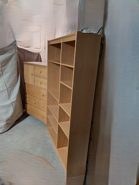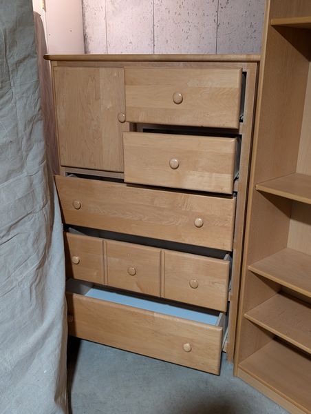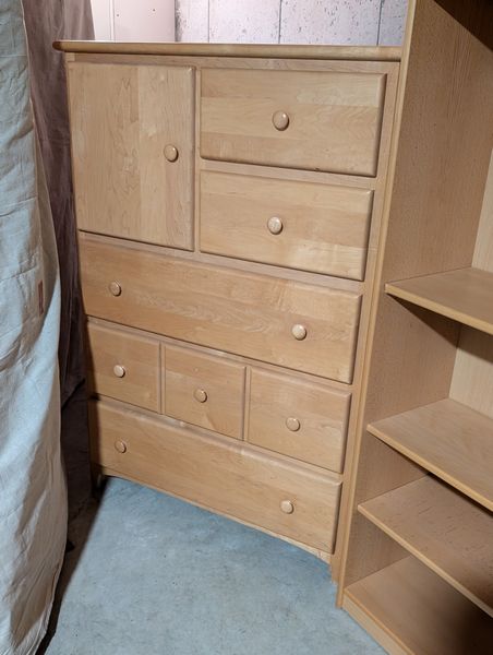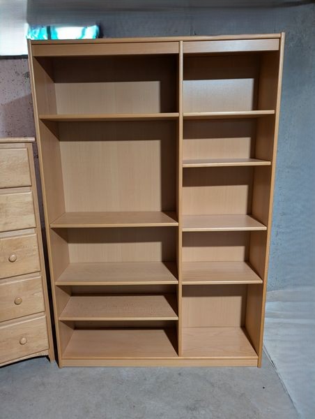 Blonde Dresser and Bookshelf. Five-drawer blonde wood dresser with wood knobs & cabinet cubby, 3'Wx17"Dx54"H; lg open bookcase with 10 (adj) shelves, 48.5"Wx12.5"Dx54"H. Loc in basement with exit through hatchway. Very lg, bring help to safely remove.